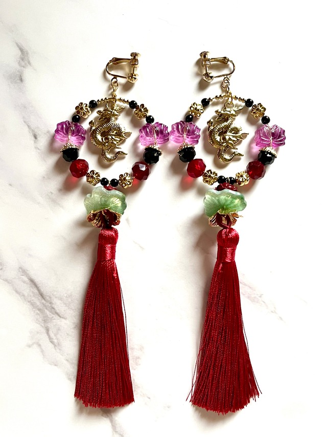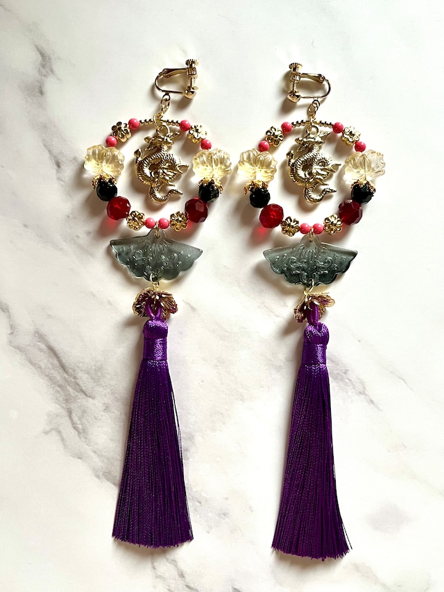 仙女たちの愛用していたアンティークの装身具を取り扱う、セレクトショップ桃仙鄉。 お洒落な仙女たちに思いを馳せた中華テイストのアクセサリーは、どこか遊び心のある華やかなデザインばかり。 季節を問わず楽しめる桃仙鄉アクセサリーをどうぞお楽しみください。 素材:キャストパーツ、プラスチックビーズ、ガラスビーズ、チェコガラスビーズ、タッセルなど 素材には日本製、海外製のパーツやヴィンテージのパーツを使用しているものがあります。 海外製パーツは日本製の物と違い最初から小さなキズや欠け、ゆがみ等が含まれます。 またヴィンテージパーツにつきましても性質上曇りやキズが含まれるものがあります。 デザインに響くもの、怪我の恐れのあるものは事前の検品にて省いておりますが 上記をご了承頂いた上でご購入頂ければ幸いです。 ピアス変更可能です、最後の画像の中からご希望の金具の番号をお選び頂き、注文時の備考欄にご記入下さい。 こちらは重さのあるデザインの為、樹脂ピアス非推奨です。 記載忘れの場合は、BASEのお問い合わせからご希望の金具番号をご連絡ください。 サイズ:約16.5cm(イヤリング金具含まず) 重さ:約38.5g
