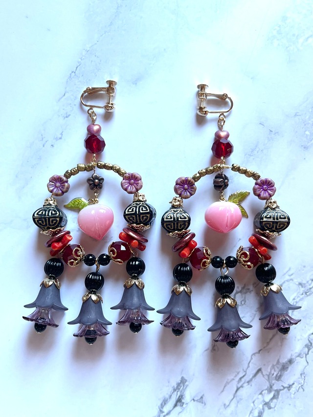 仙女たちの愛用していたアンティークの装身具を取り扱う、セレクトショップ桃仙鄉。 お洒落な仙女たちに思いを馳せた中華テイストのアクセサリーは、どこか遊び心のある華やかなデザインばかり。 季節を問わず楽しめる桃仙鄉アクセサリーをどうぞお楽しみください。 素材:チェコガラスビーズ、キャストパーツ、プラスチックビーズ、ウッドビーズなど 素材には日本製、海外製のパーツやヴィンテージのパーツを使用しているものがあります。 海外製パーツは日本製の物と違い最初から小さなキズや欠け、ゆがみ等が含まれます。 またヴィンテージパーツにつきましても性質上曇りやキズが含まれるものがあります。 デザインに響くもの、怪我の恐れのあるものは事前の検品にて省いておりますが 上記をご了承頂いた上でご購入頂ければ幸いです。 ピアス変更可能です、最後の画像の中からご希望の金具の番号をお選び頂き、注文時の備考欄にご記入下さい。 こちらは重さのあるデザインのため、樹脂ピアスは非推奨です。 記載忘れの場合は、BASEのお問い合わせからご希望の金具番号をご連絡ください。 ピアス変更希望のみのメールは返事を割愛させていただいております。恐れ入りますが予めご了承くださいませ。 サイズ:長さ約9.6cm(イヤリング金具含まず) 重さ:約39.5g