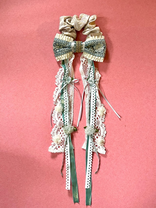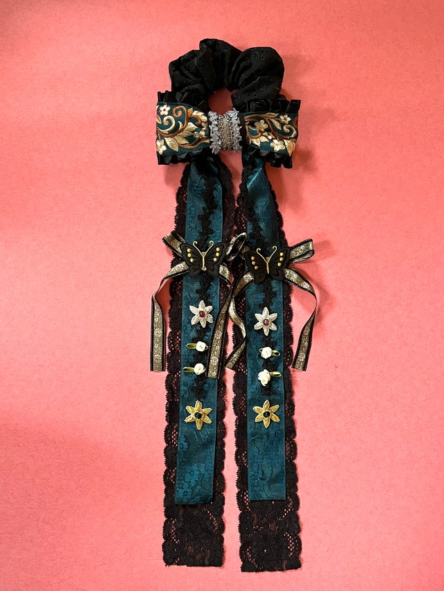 永遠の少女を心に棲ませる、全ての人へ贈るAPOLIAらしいフォークロアデザインの少女族シリーズ。 棲・少女族はAPOLIA独自のフォークロアを突き詰める為に進化していくシリーズです。 APOLIAの初期衝動である永遠の少女性とそれに反する身体の成長と生まれる心身の剥離。それを受け容れる為の旅と、新たなる少女フォークロアの創造を目標に制作し続けます。 こちらはまるでりぼんのエクステの様なロングタイプのシュシュ。 インド刺繍リボンを初め様々なモチーフやブレードなどを使用して、mixテイストなフォークロアデザインに仕上げました 素材:インド刺繍りぼん、ポリエステルフリル、ブレード、綿レース、台湾仕入れフラワーモチーフなど 素材には日本製、海外製のパーツやヴィンテージのパーツを使用しているものがあります。 海外製パーツは日本製の物と違い最初から小さなキズや欠け、ゆがみ等が含まれます。 またヴィンテージパーツにつきましても性質上曇りやキズが含まれるものがあります。 デザインに響くもの、怪我の恐れのあるものは事前の検品にて省いておりますが 上記をご了承頂いた上でご購入頂ければ幸いです。 サイズ:最長部分りぼん上約15×7.5cm、りぼん下44cm