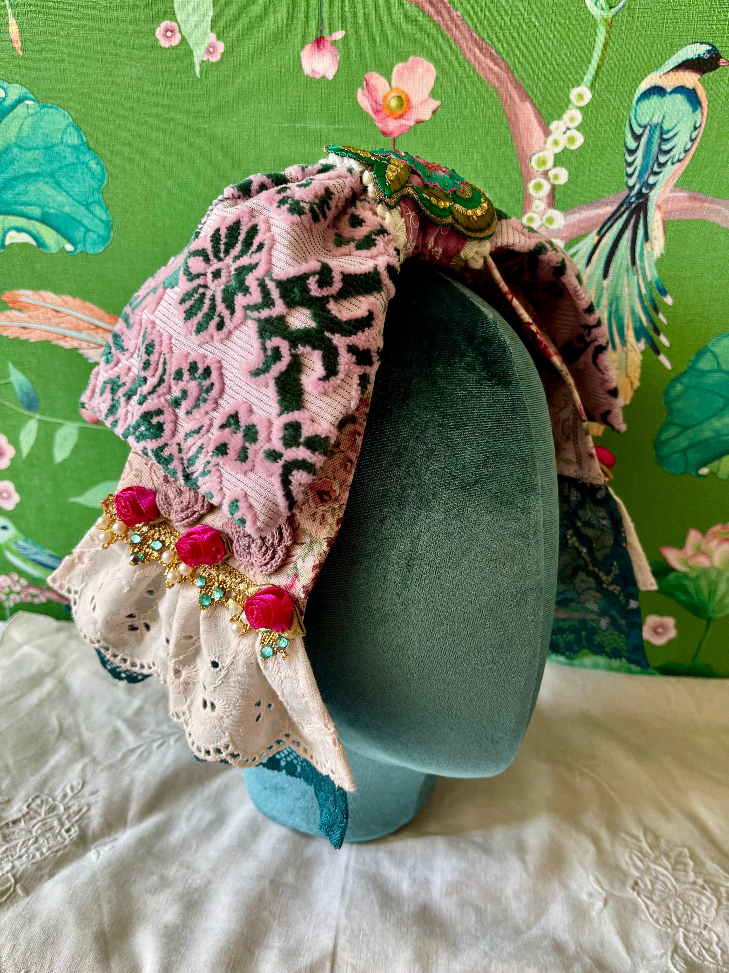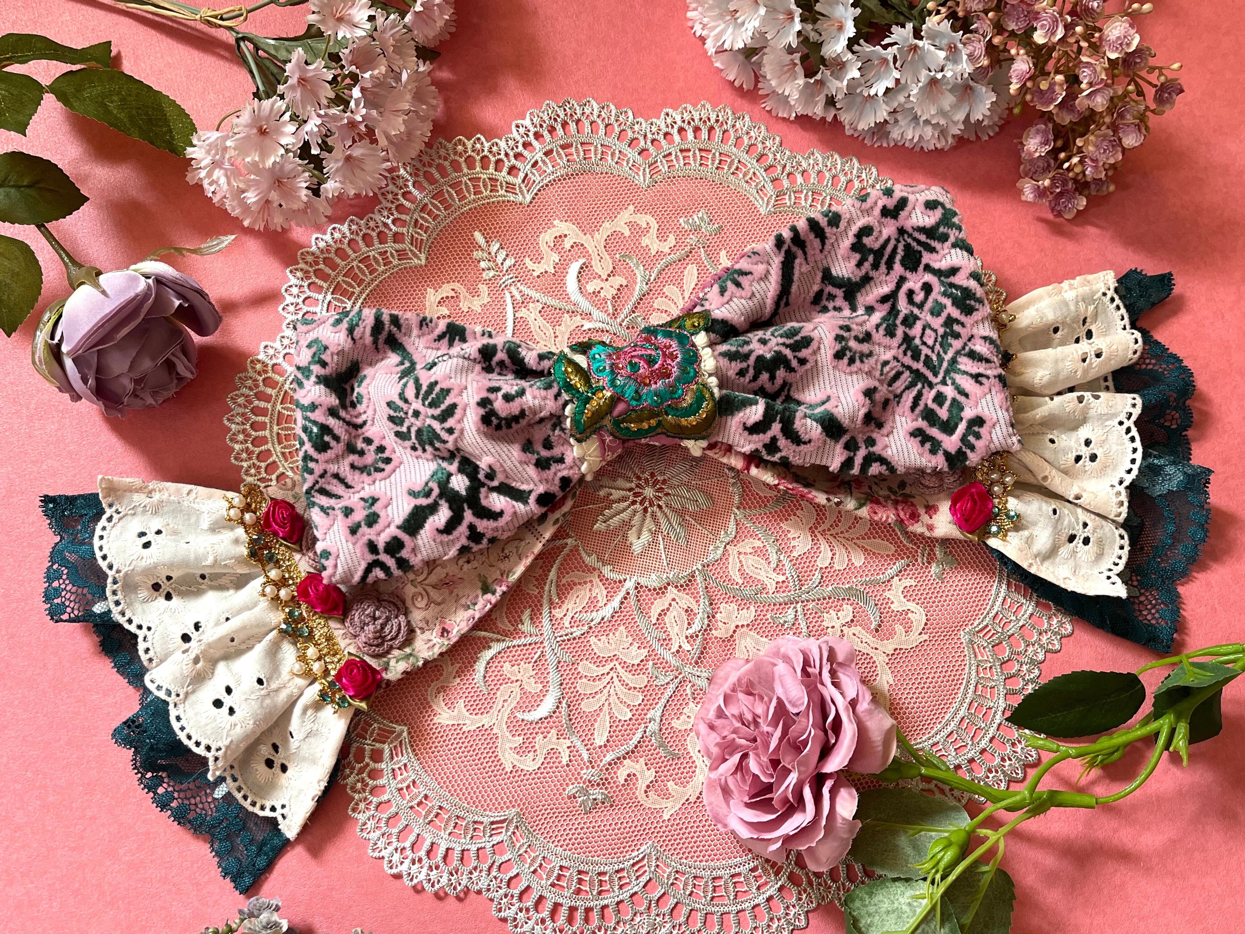 絨毯の様な美しい金華山の織り生地を使用した、ゴージャスでロマンティックなりぼんヘアバンド。