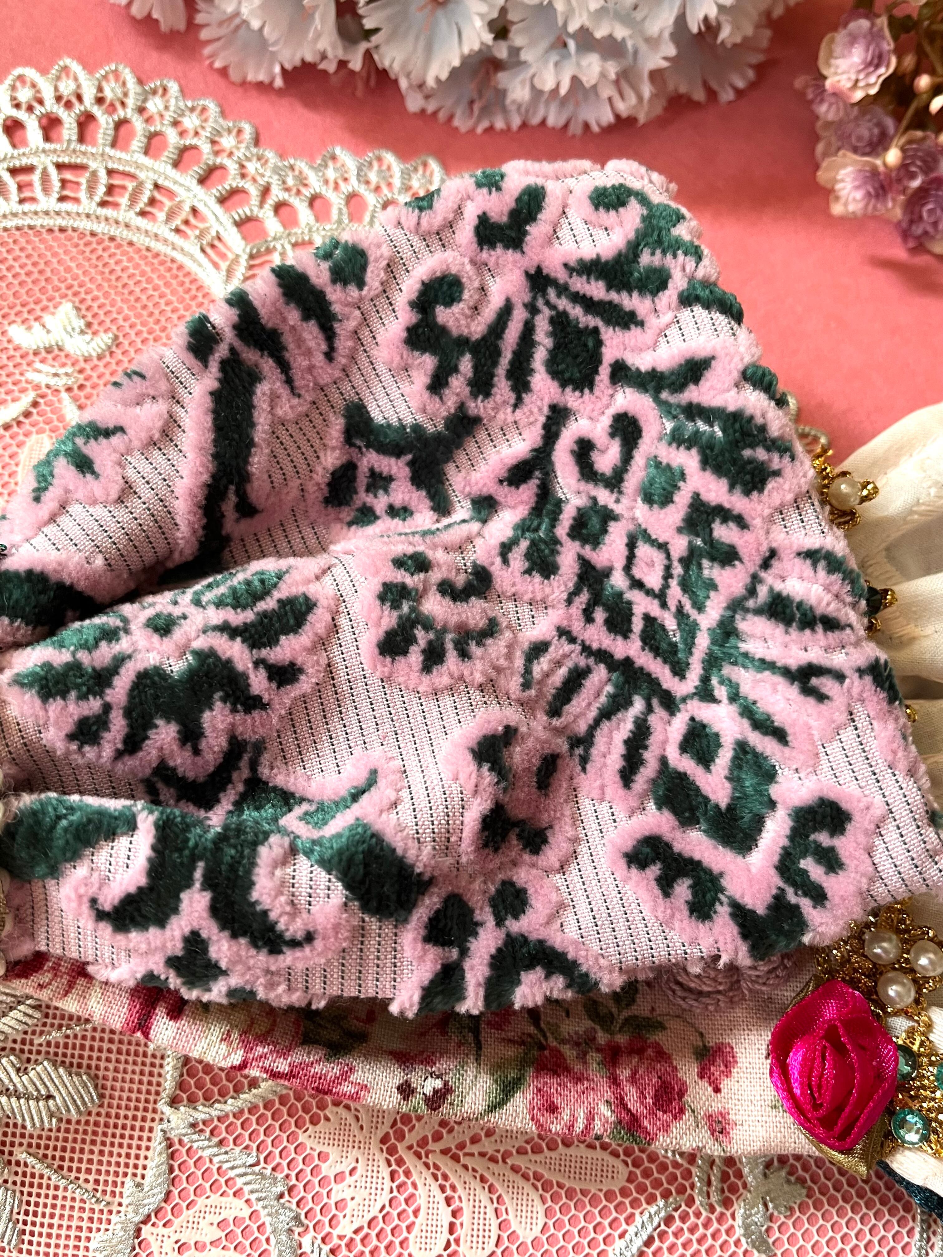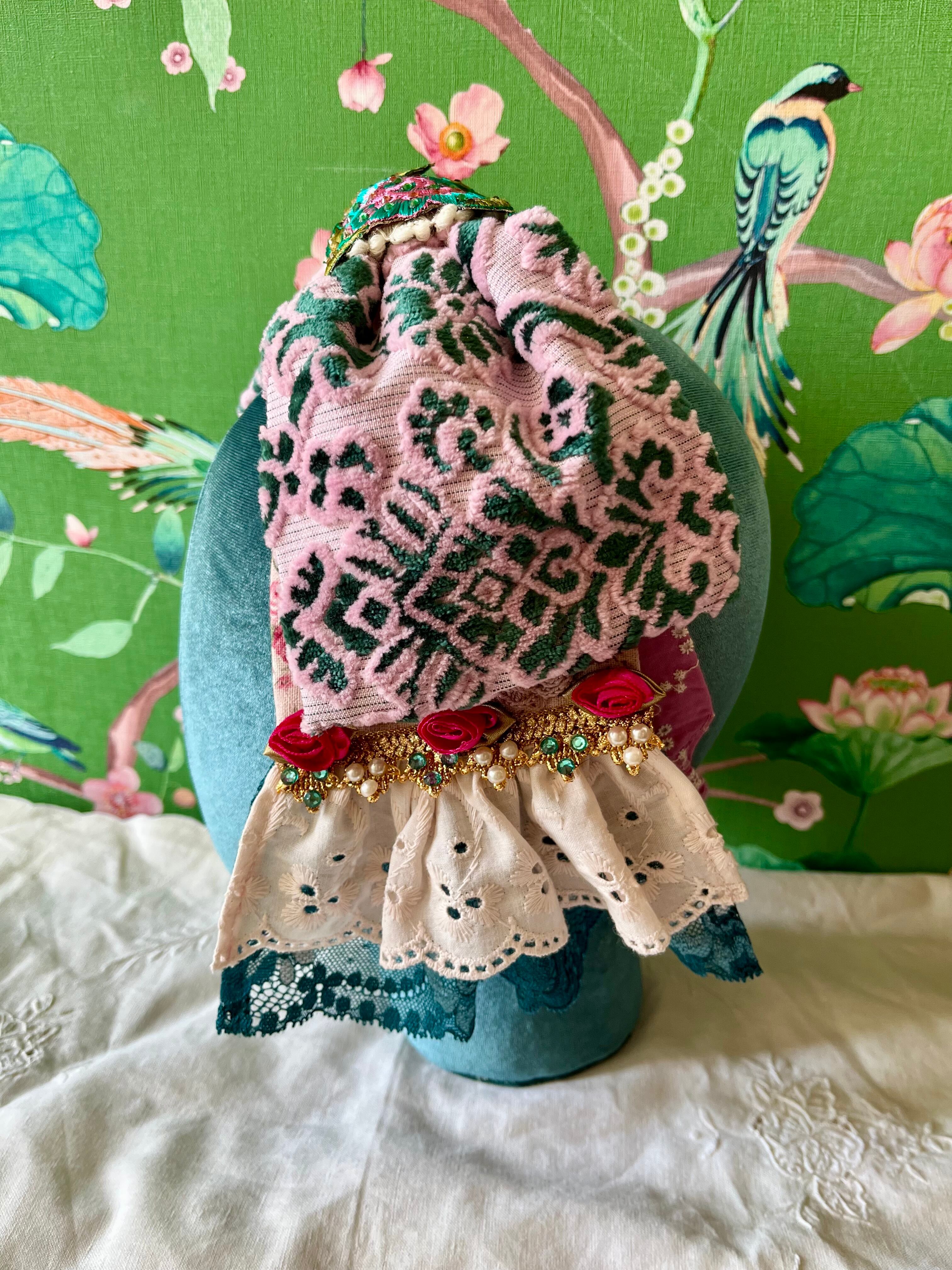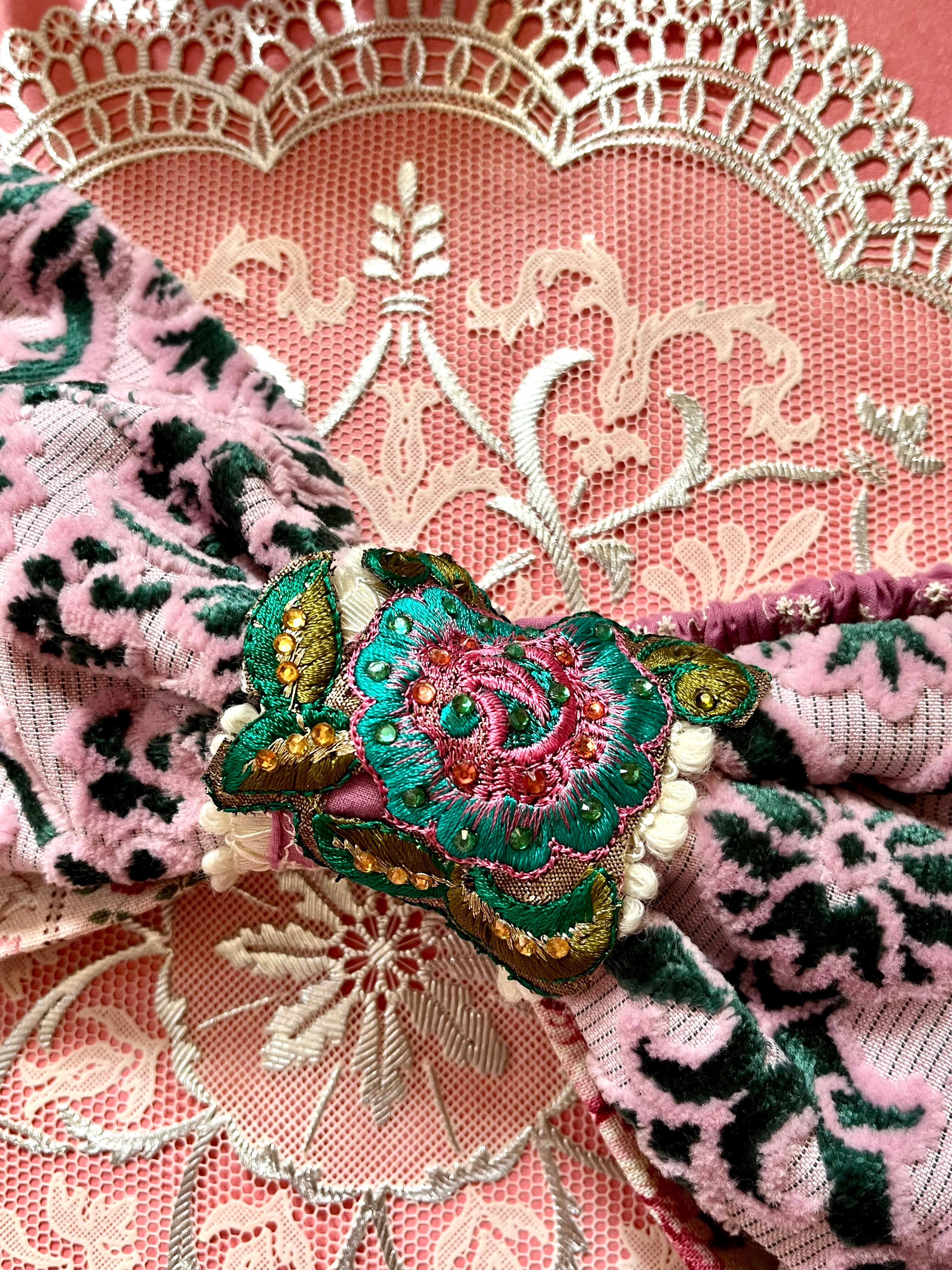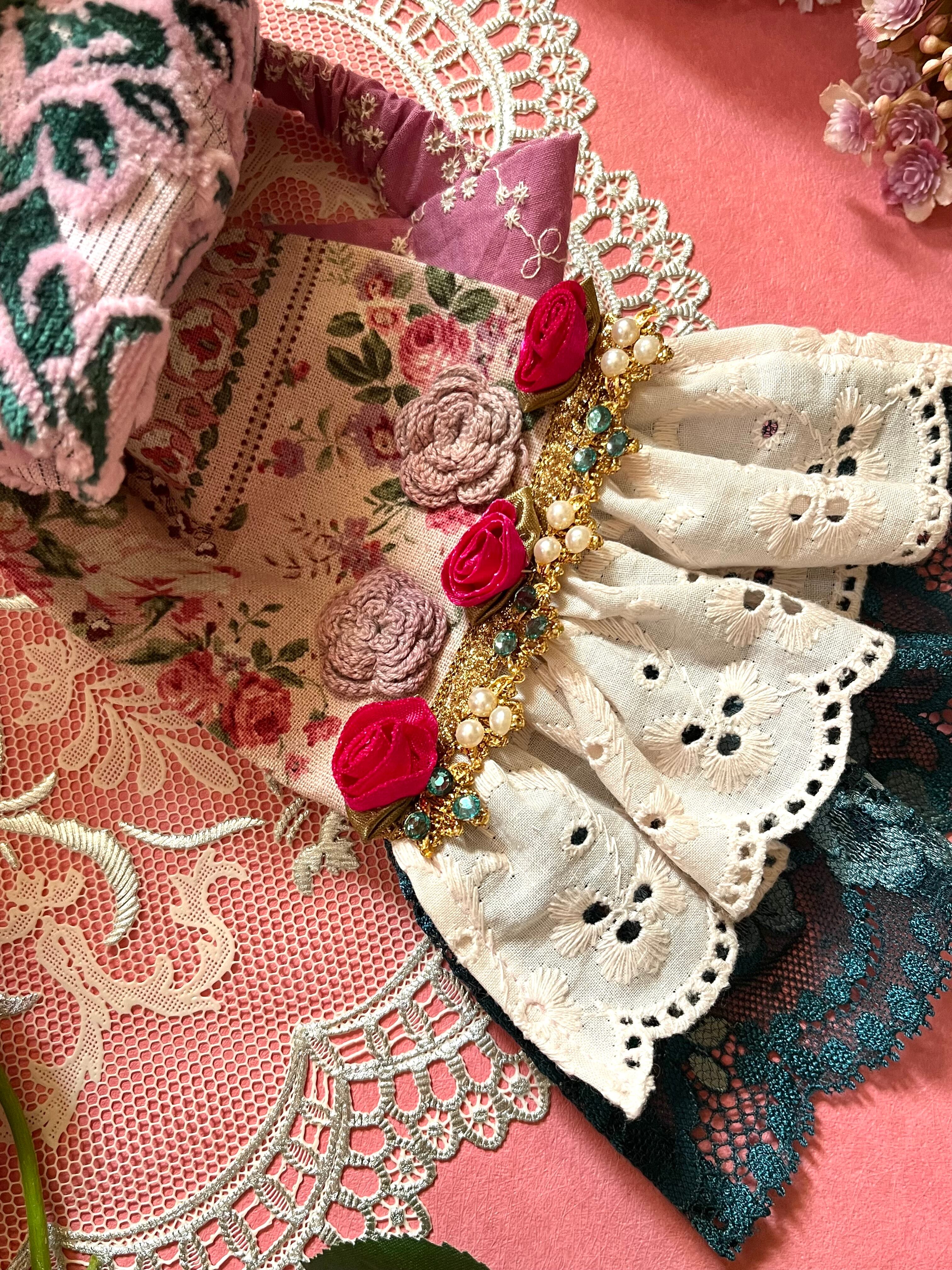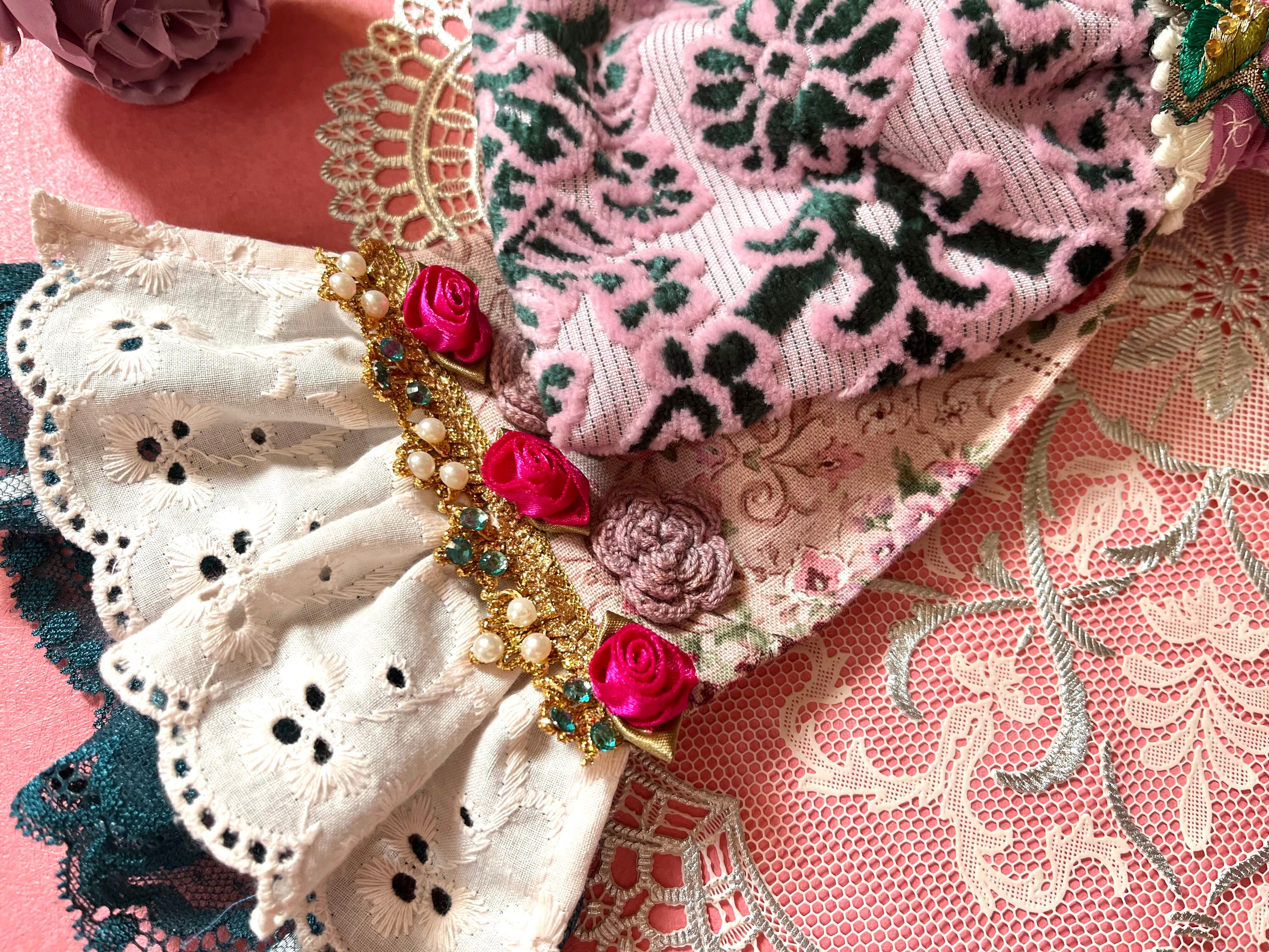 素材:金華山織生地、インドヴィンテージ刺繍モチーフ、台湾製巻薔薇、綿プリント生地、インド製ブレード、綿レース、ストレッチレースなど