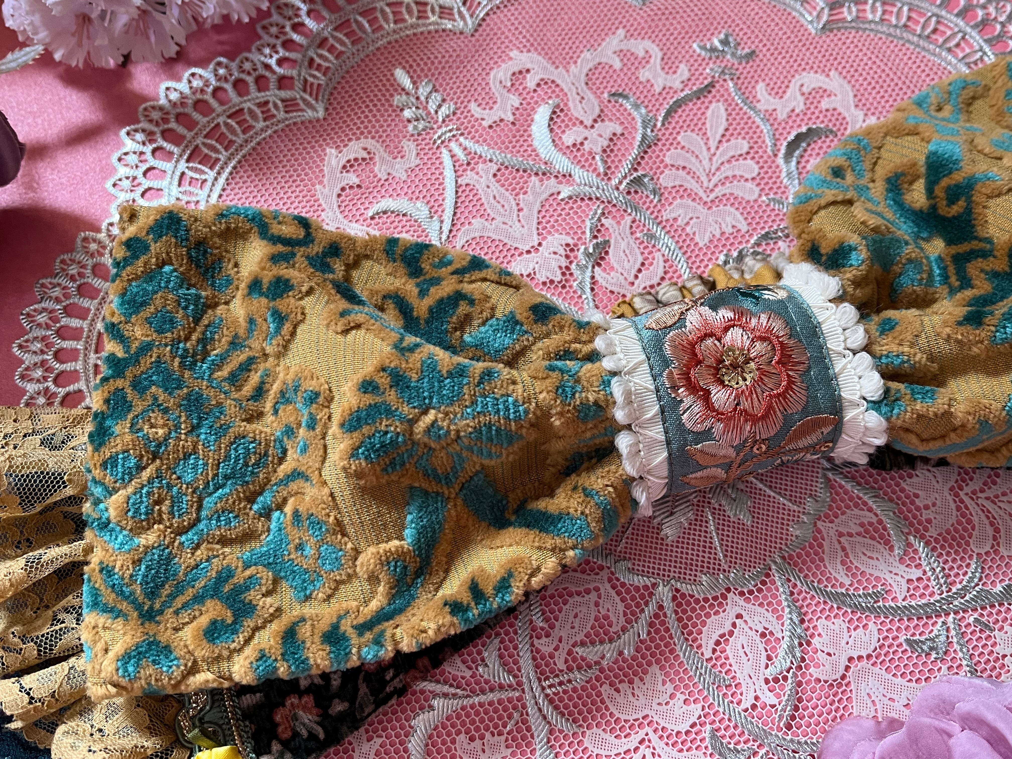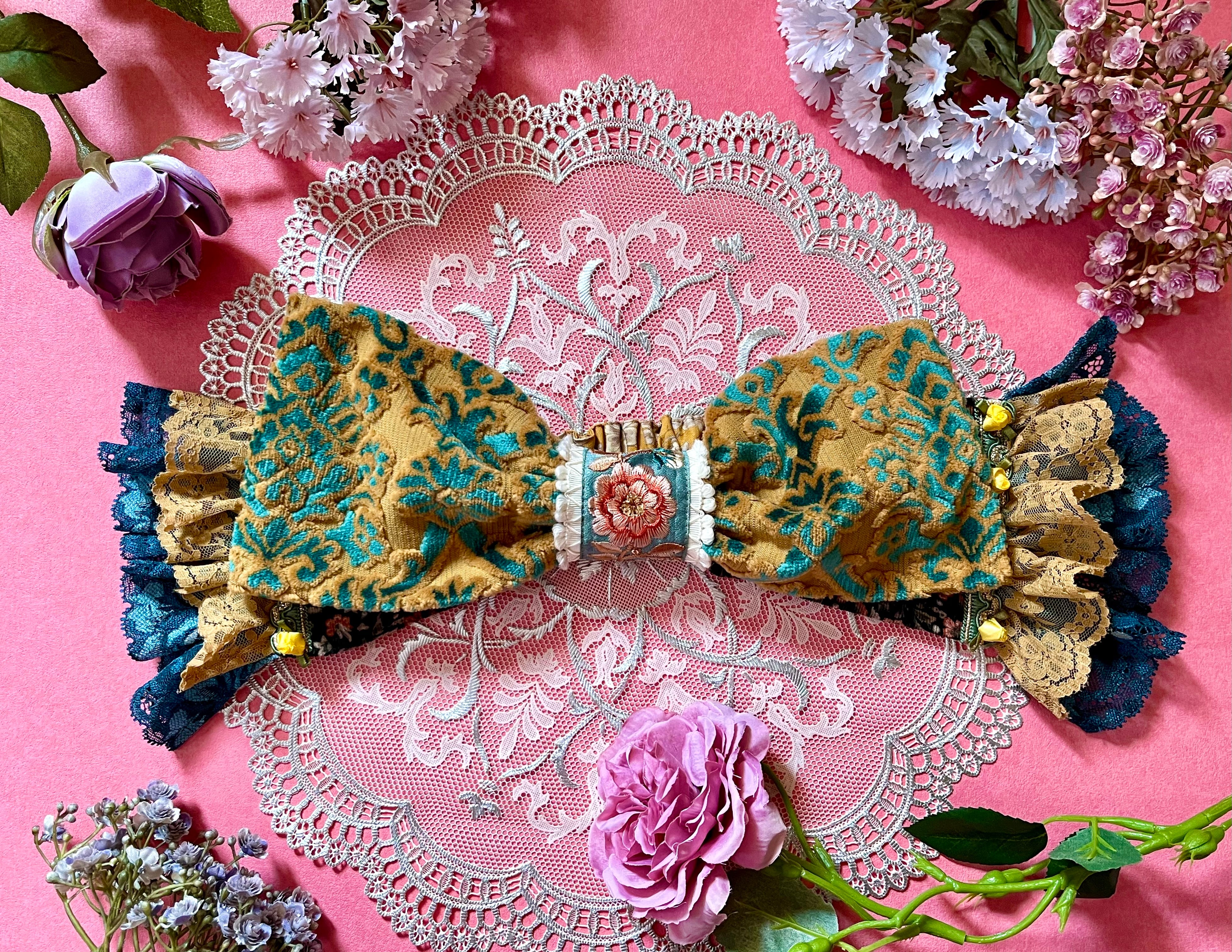絨毯の様な美しい金華山の織り生地を使用した、ゴージャスでロマンティックなりぼんヘアバンド。