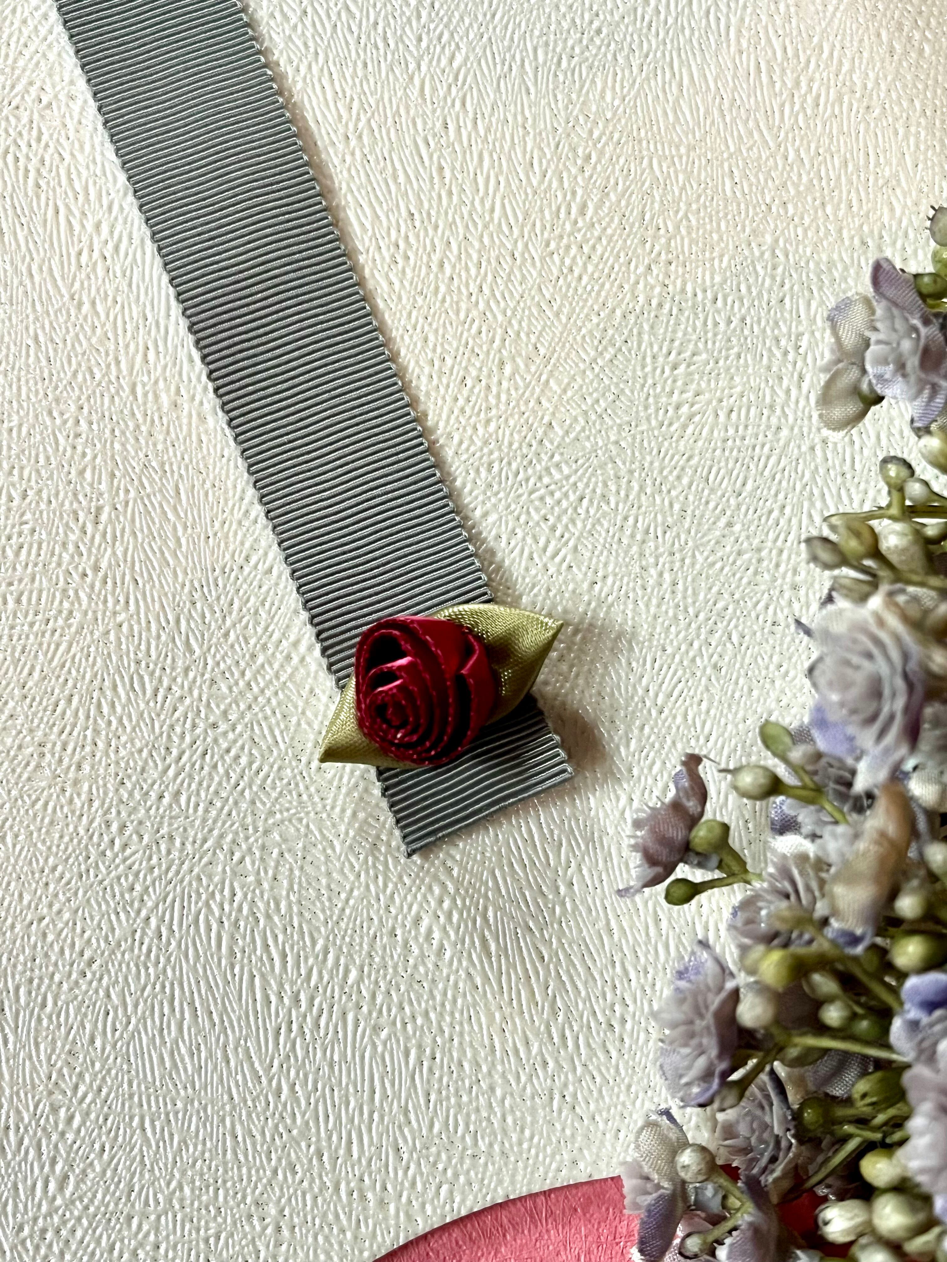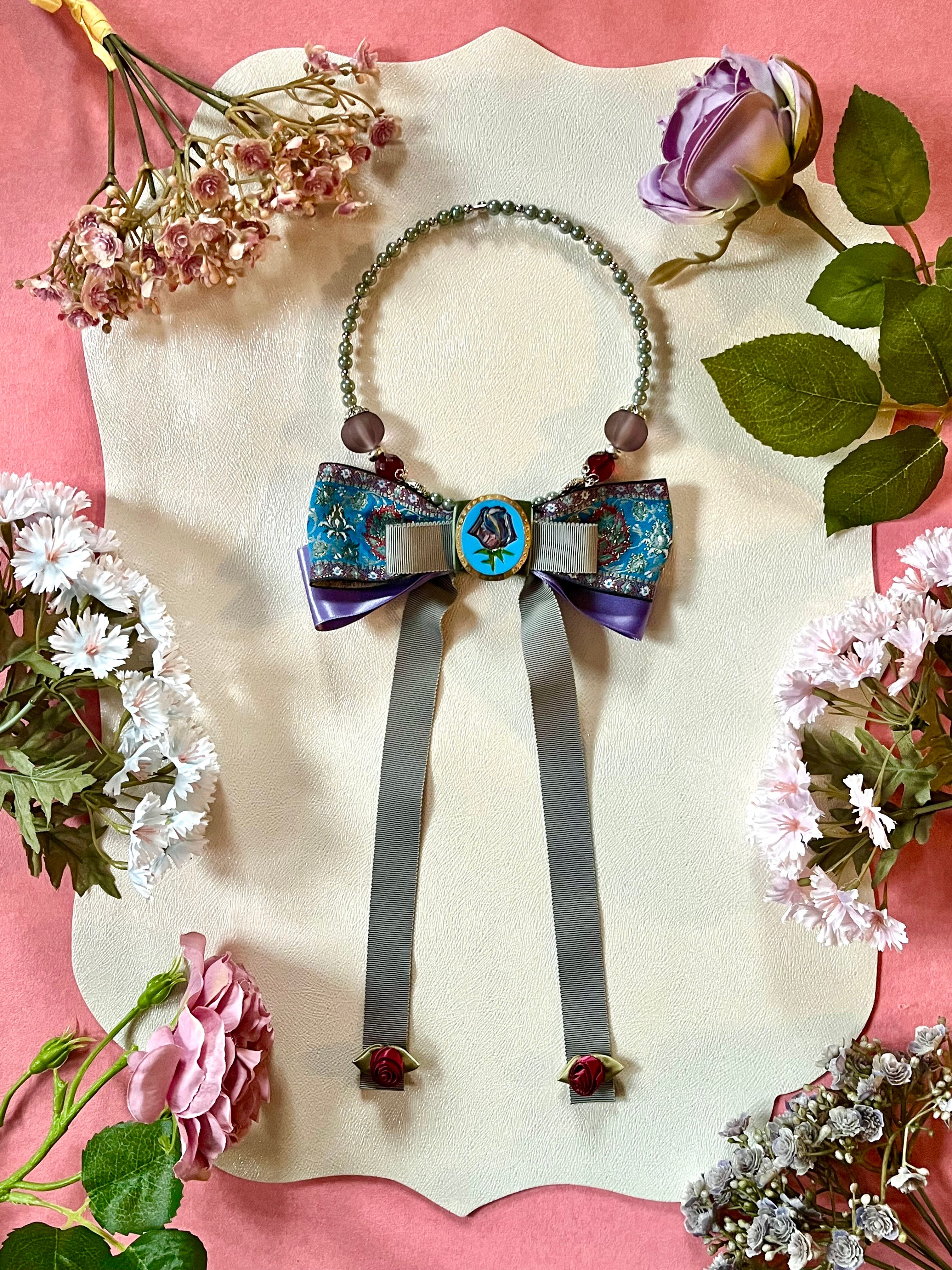 素材:チェコ硝子ボタン、織りりぼん、サテンりぼん、チェコ硝子ビーズ、アクリルビーズなど