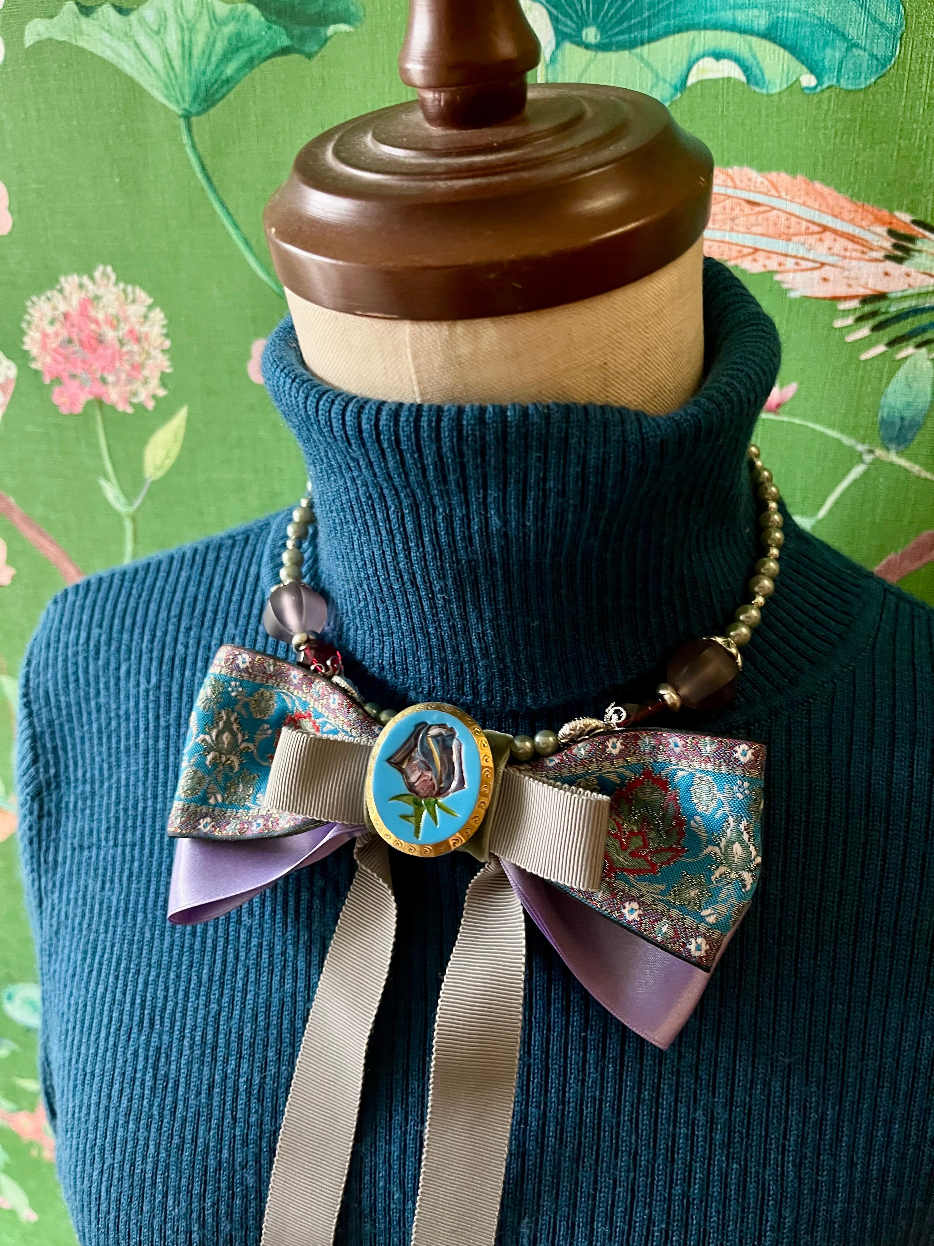 インド刺繍りぼんや織りりぼんを使用し、エキゾチックなリボンタイに仕上げました。