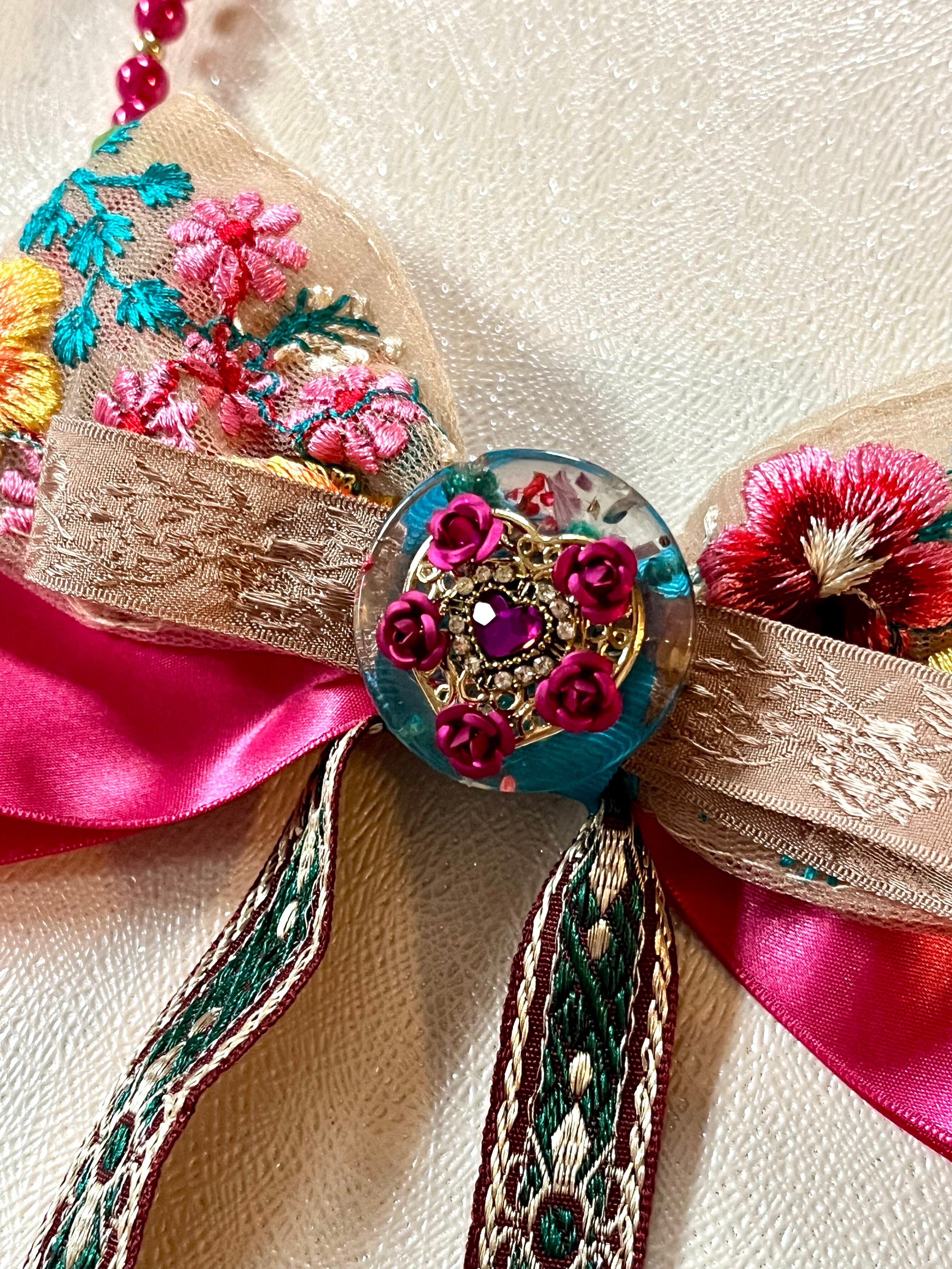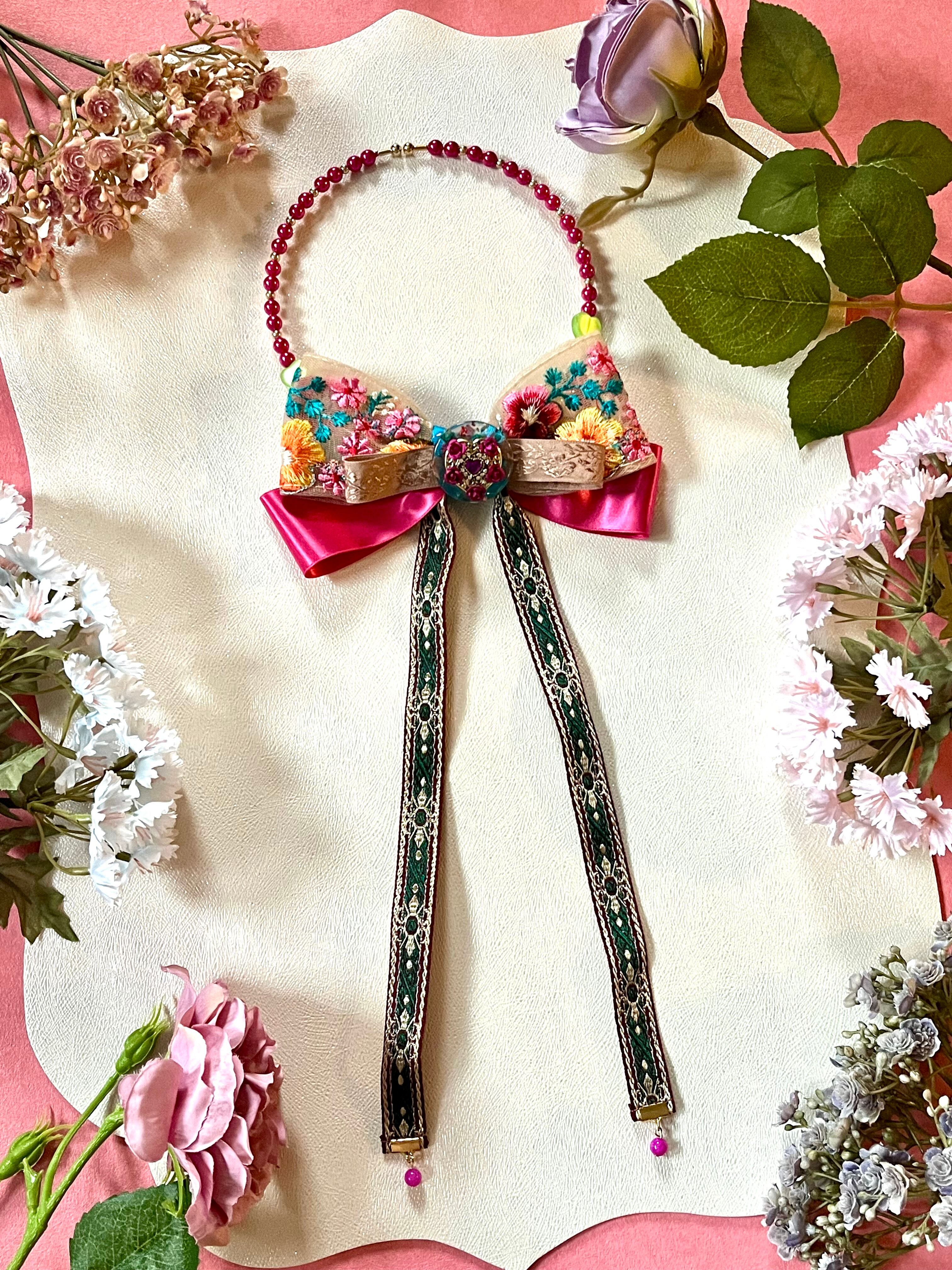 インド刺繍りぼんや織りりぼんを使用し、エキゾチックなリボンタイに仕上げました。