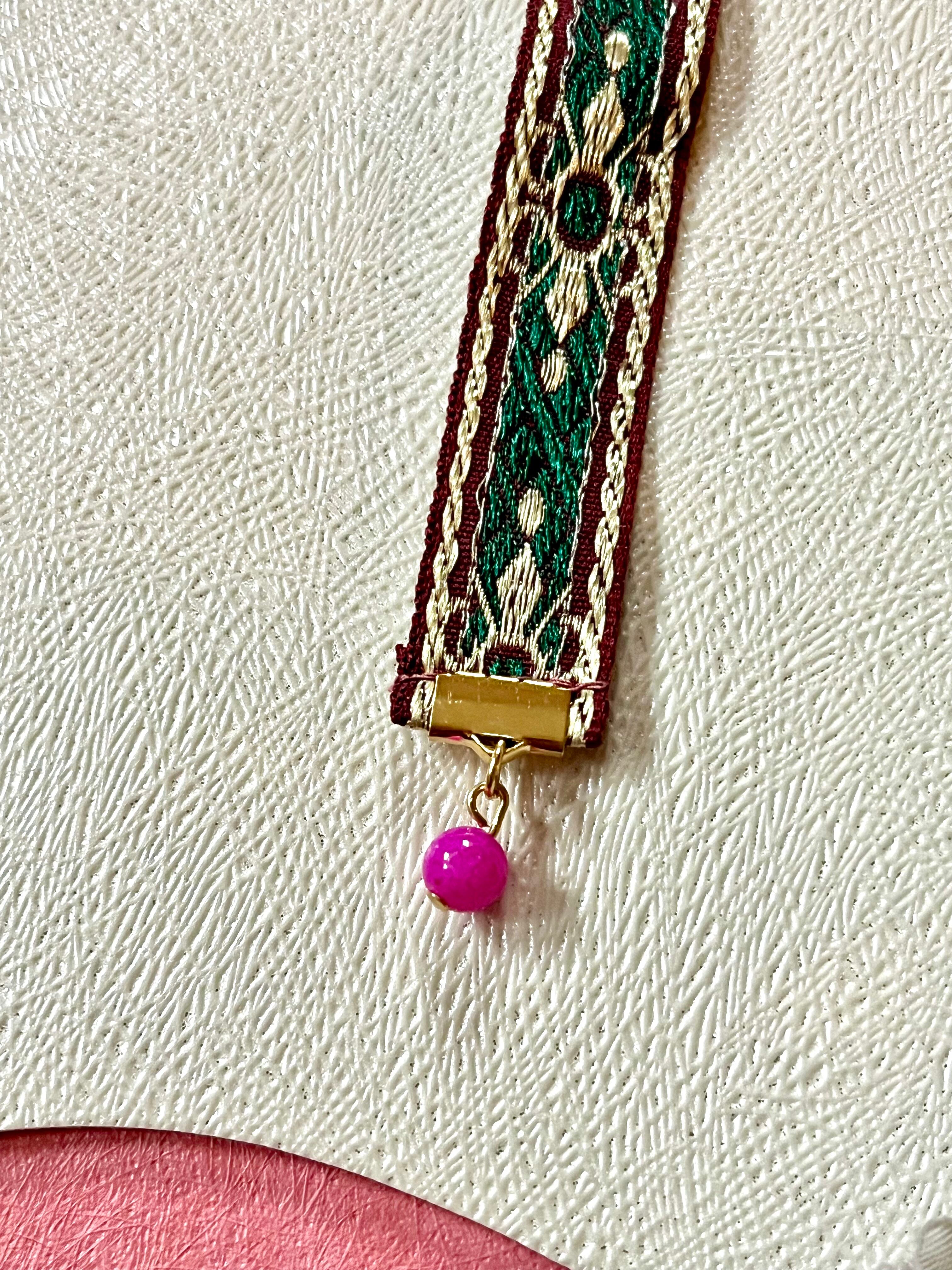 素材:インド刺繍りぼん、サテンりぼん、チェコ硝子ビーズ、アクリルビーズなど