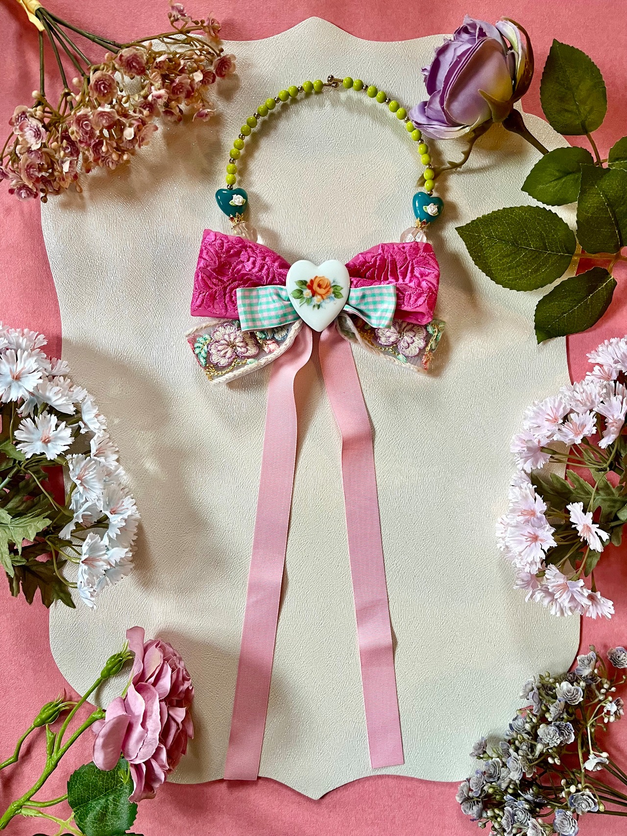 素材:陶器カボション、インド刺繍りぼん(ビンテージ含む)、グログランりぼん、アクリルビーズなど