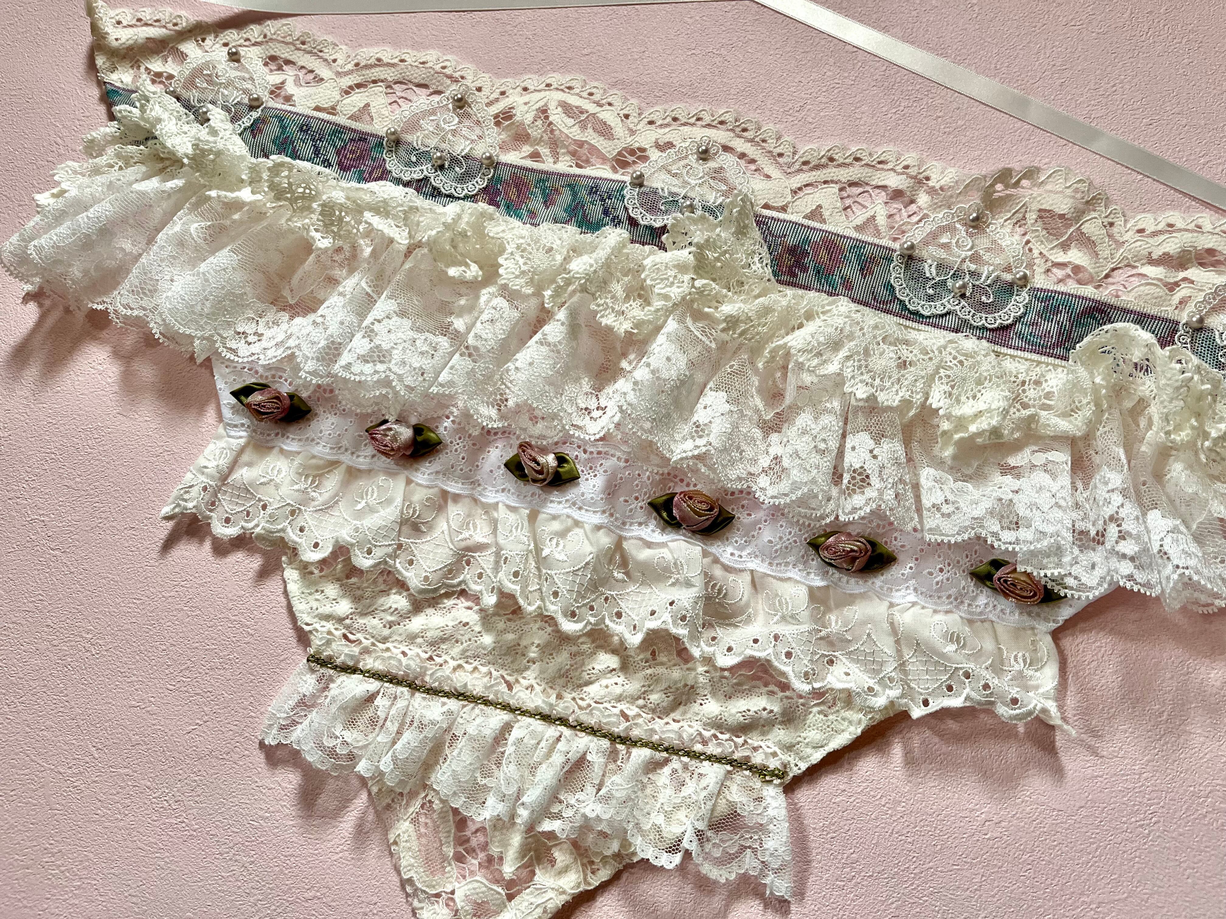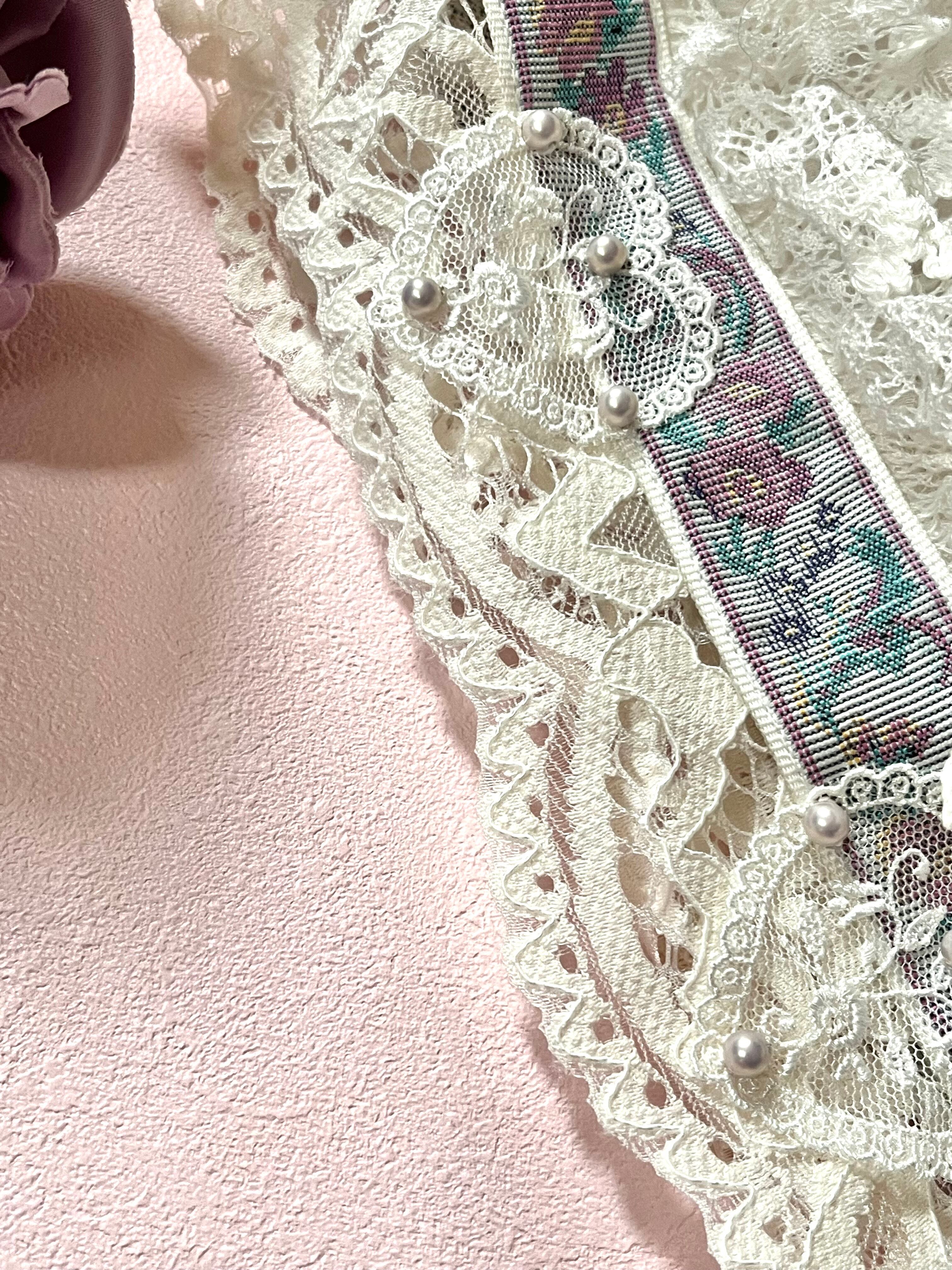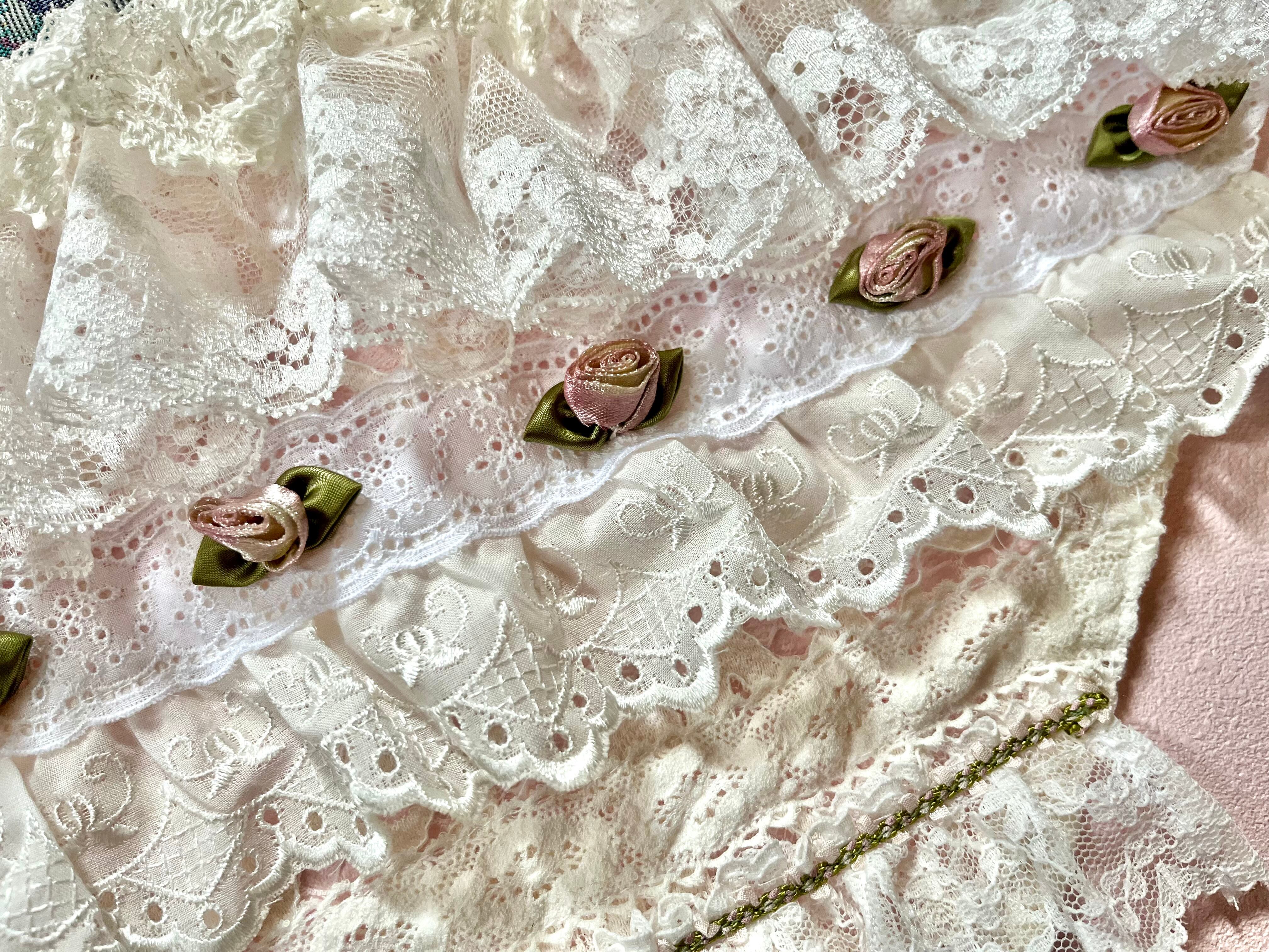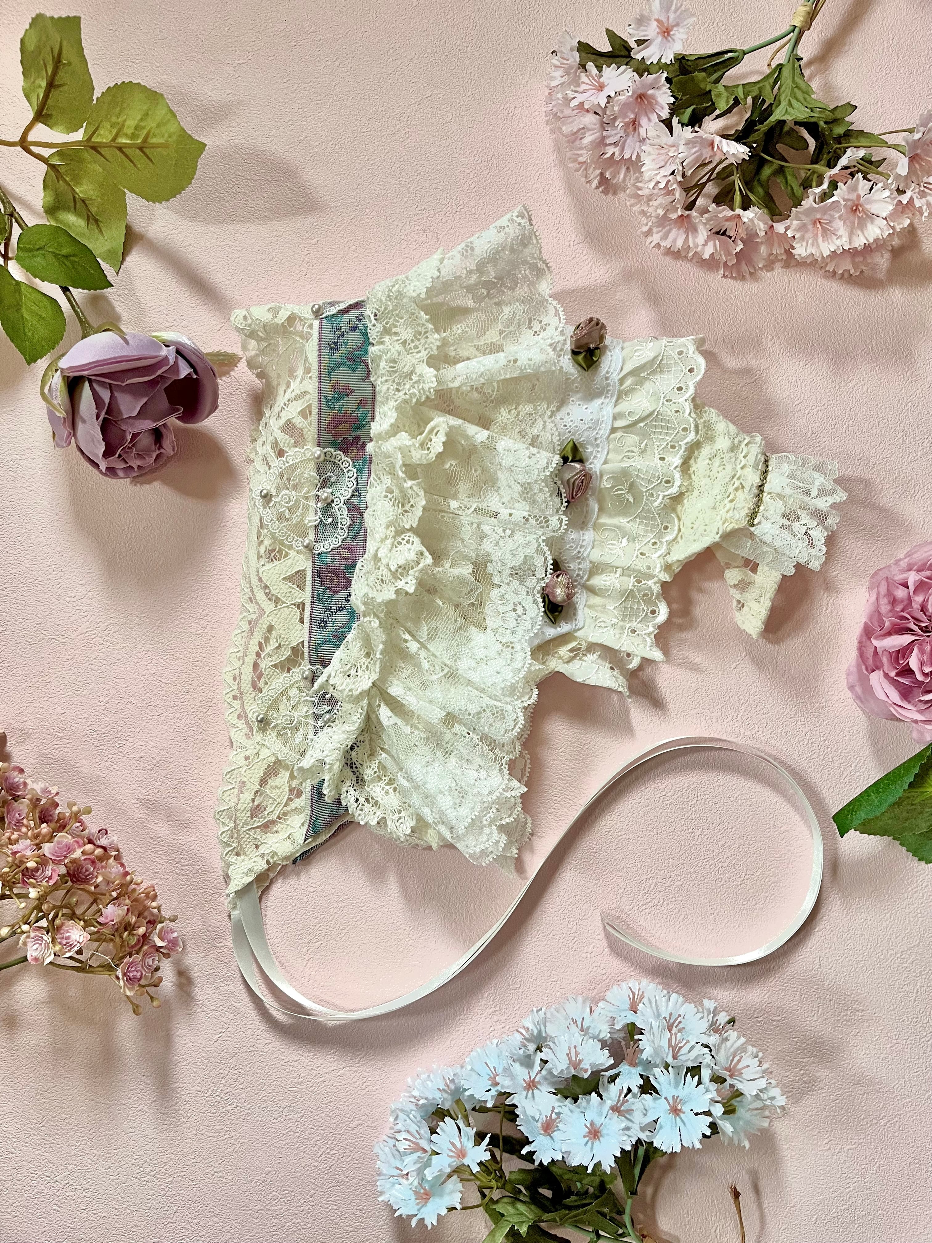 素材:ポリ混レース生地、織りりぼん、ラッセルレース、綿レース、巻バラ、樹脂パールなど