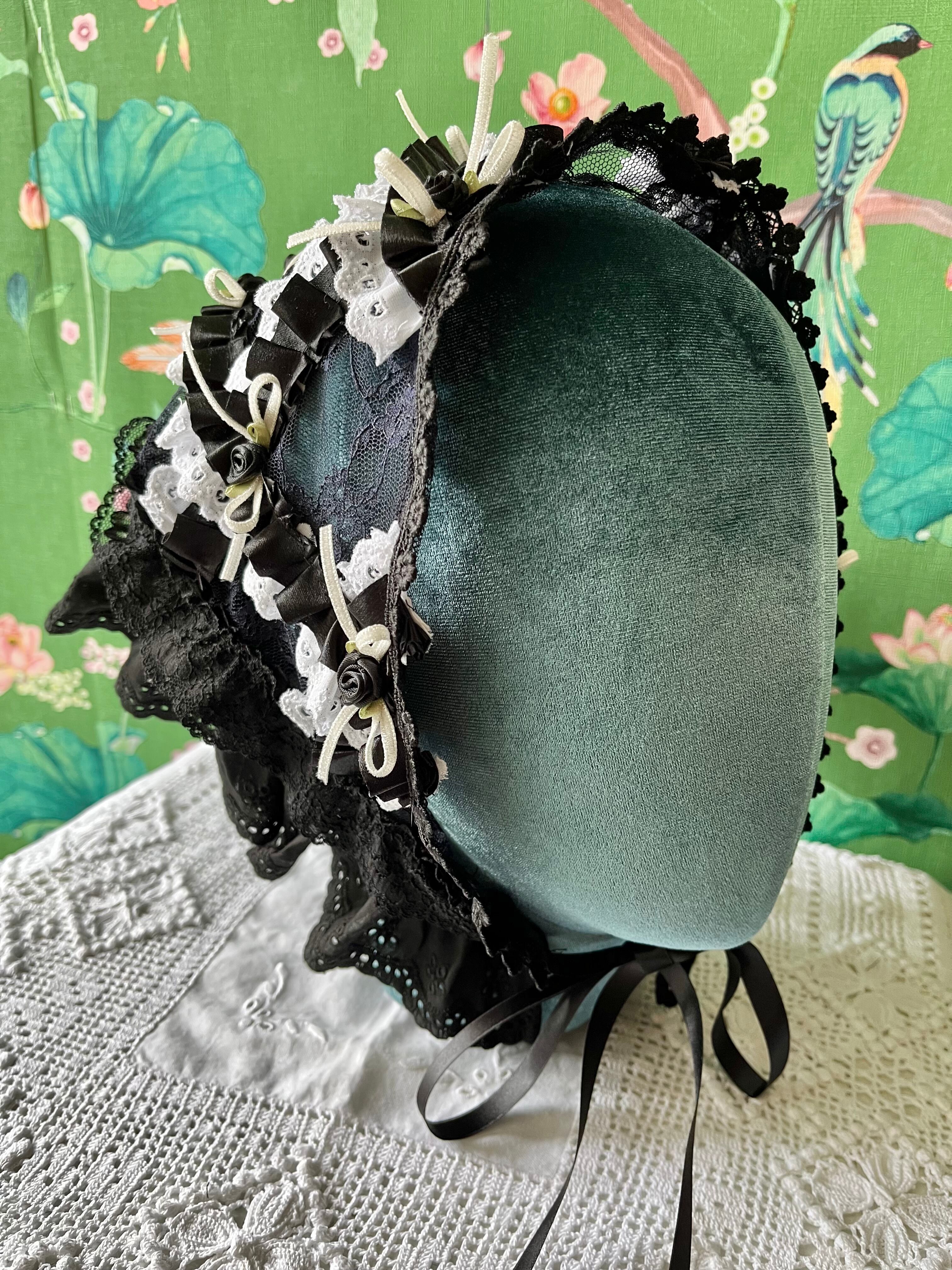 APOLIAらしくLolitaをイメージしたバブーシュカ。ハート柄の綿レースにサテンプリーツレースを合わせ、沢山の別珍りぼんに黒の巻薔薇を贅沢に縫いとめています。