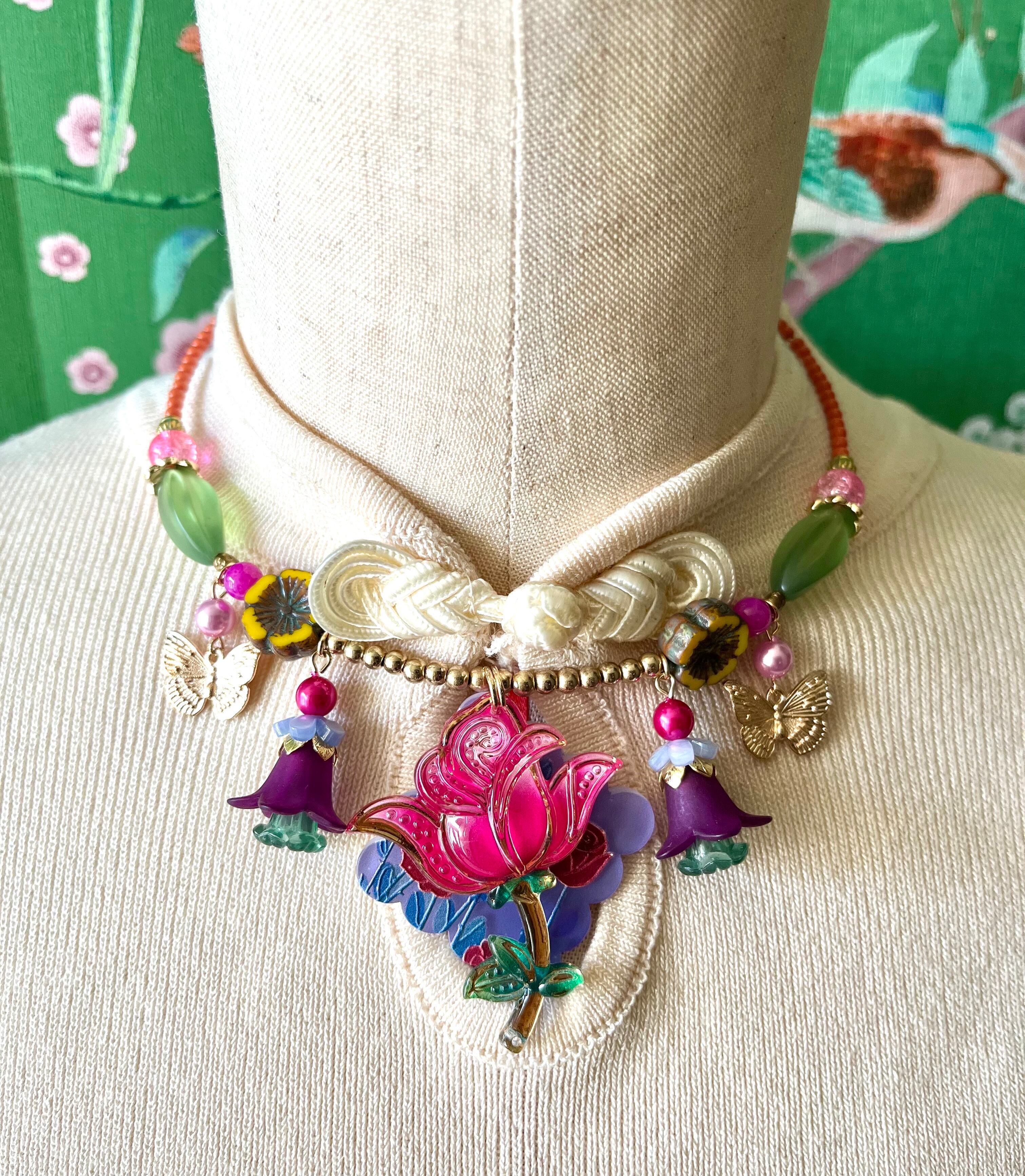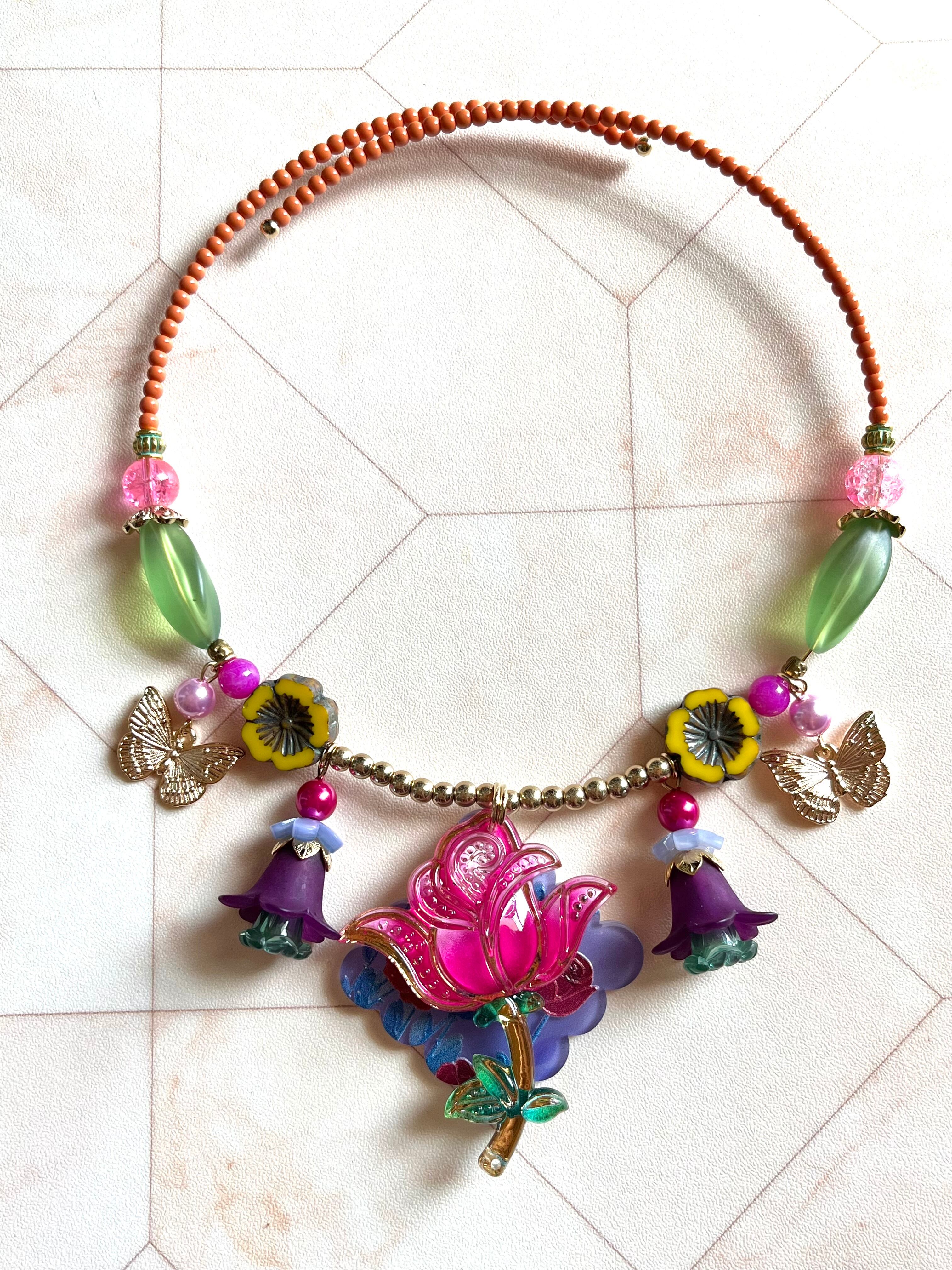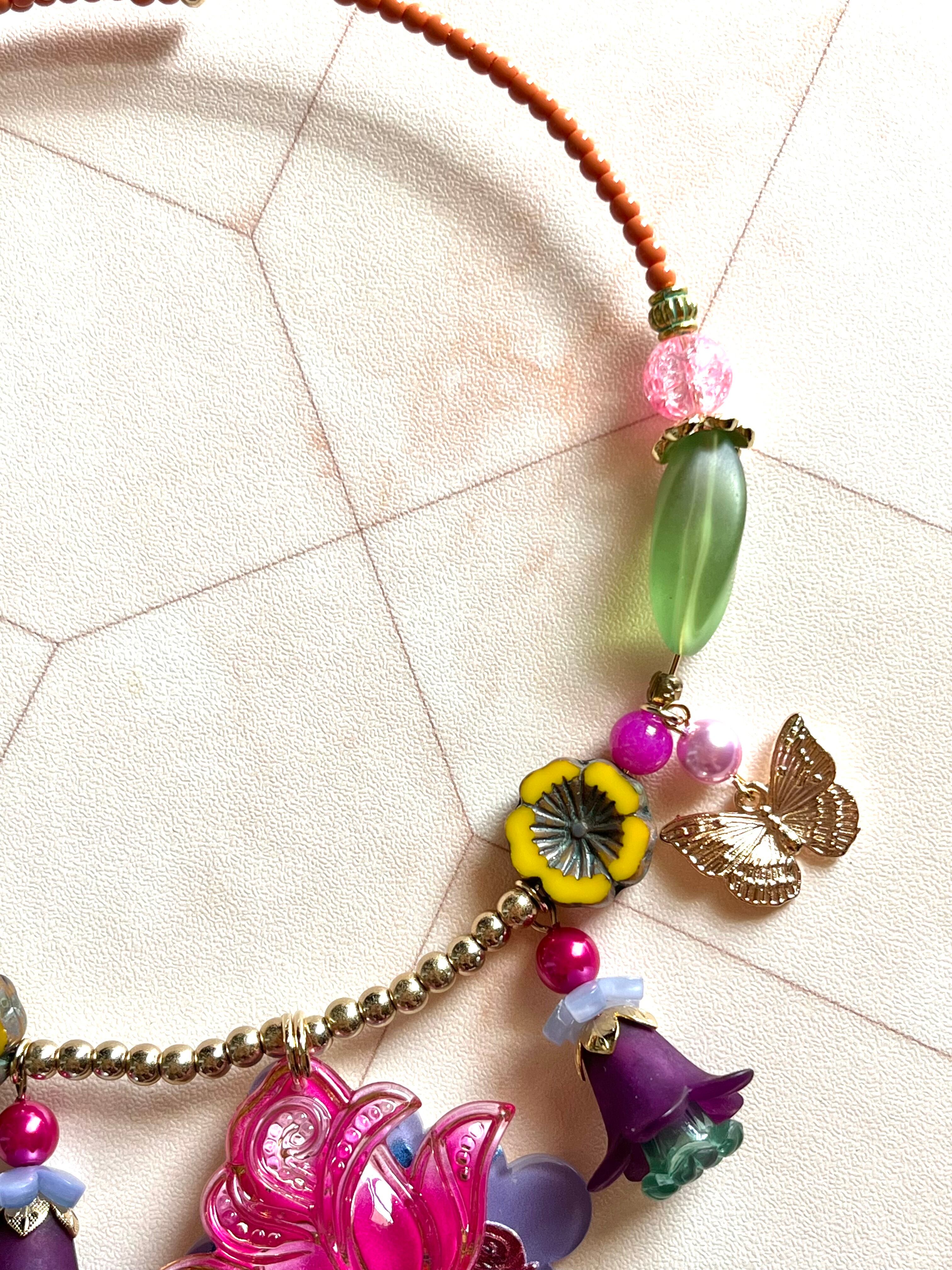 素材:ビンテージガラスビーズ、チェコガラスビーズ、プラスチックビーズ、キャストパーツなど