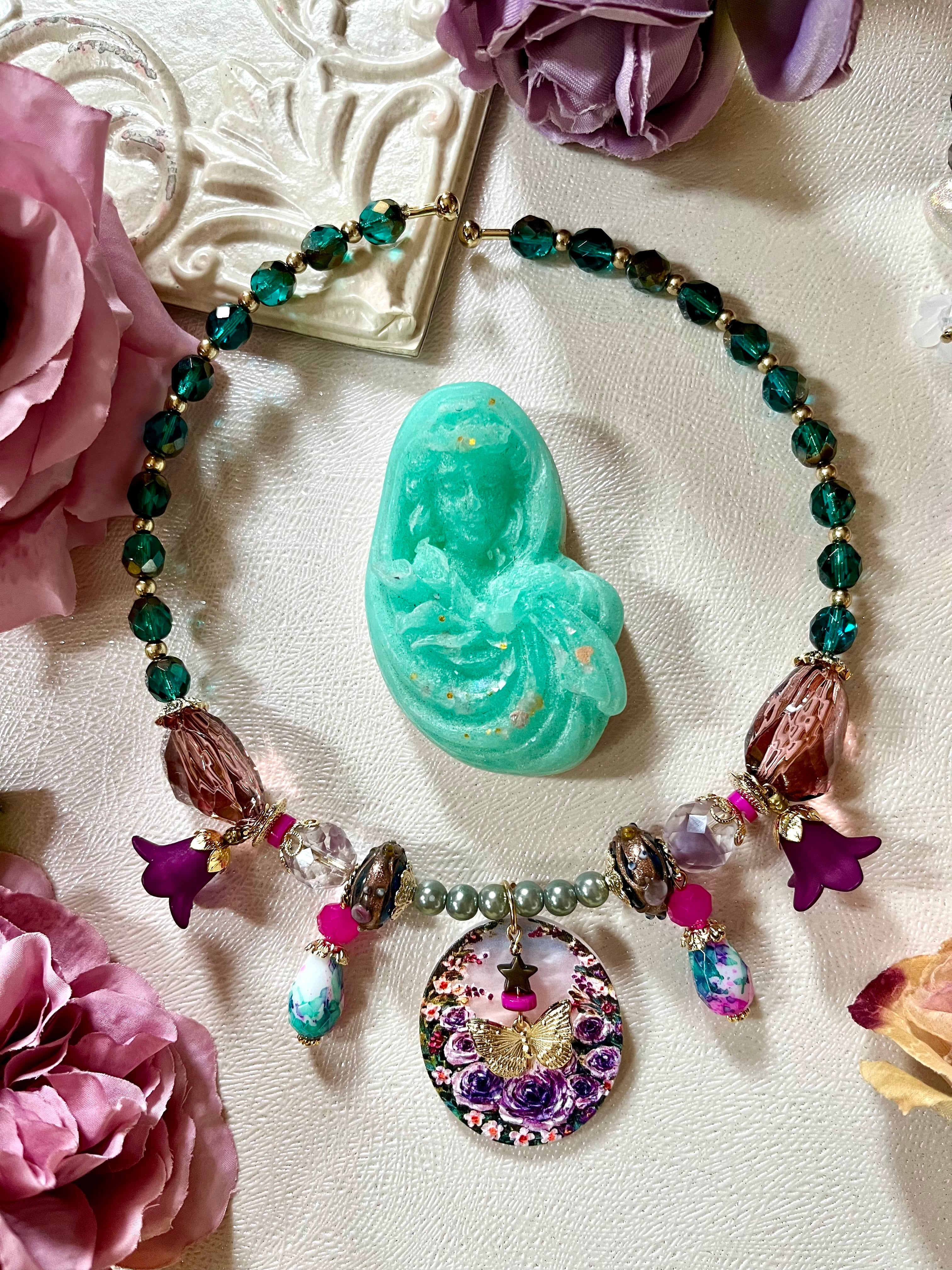 春の暖かく朝露に濡れる薔薇の様な、瑞々しい煌めきをもつチェコ硝子ビーズをベースに、賑やかで華々しい薔薇園をチャーム等で表現しました。