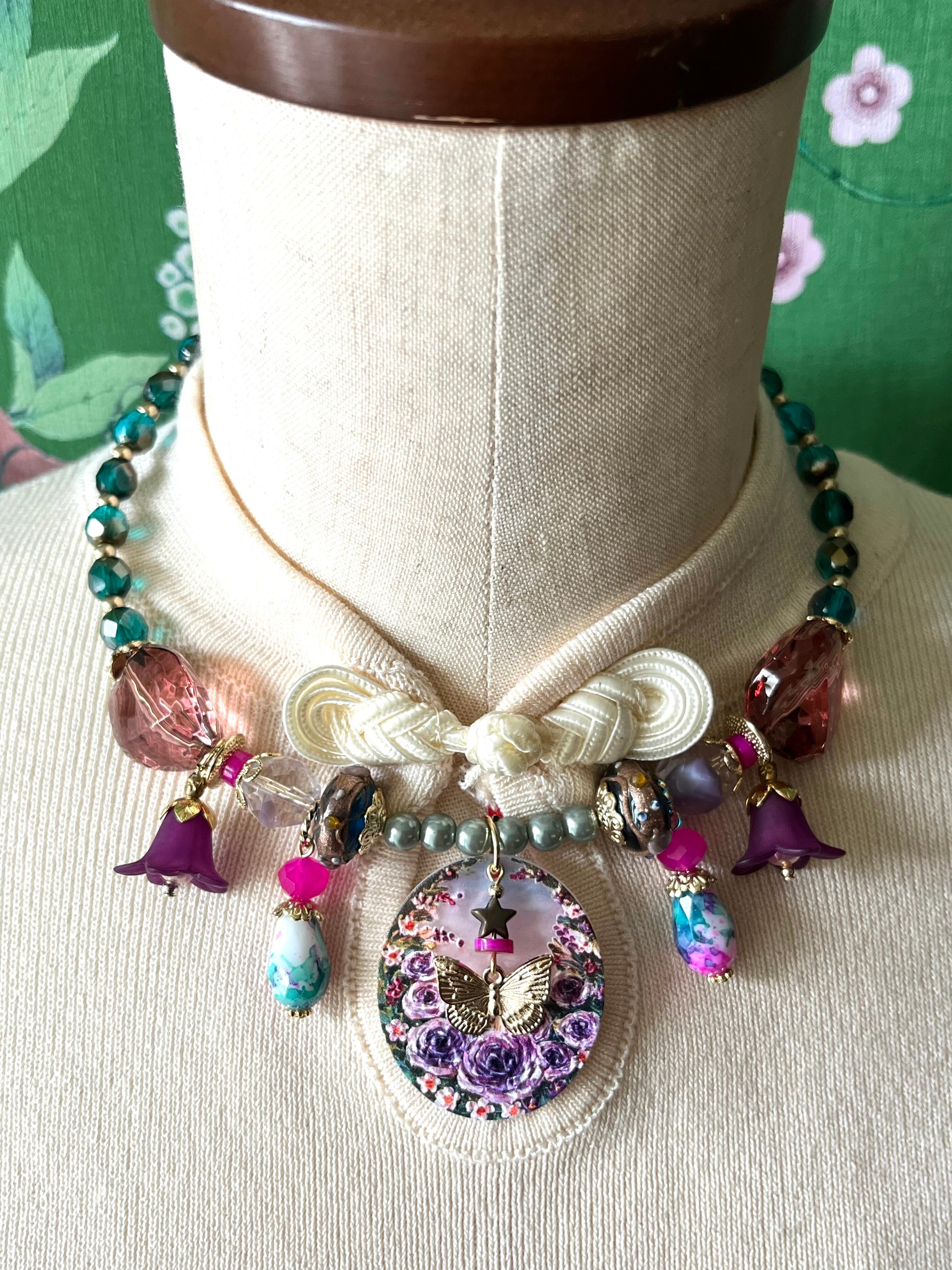 春の咲き乱れる薔薇園をイメージした、華やかなワイヤーネックレス。