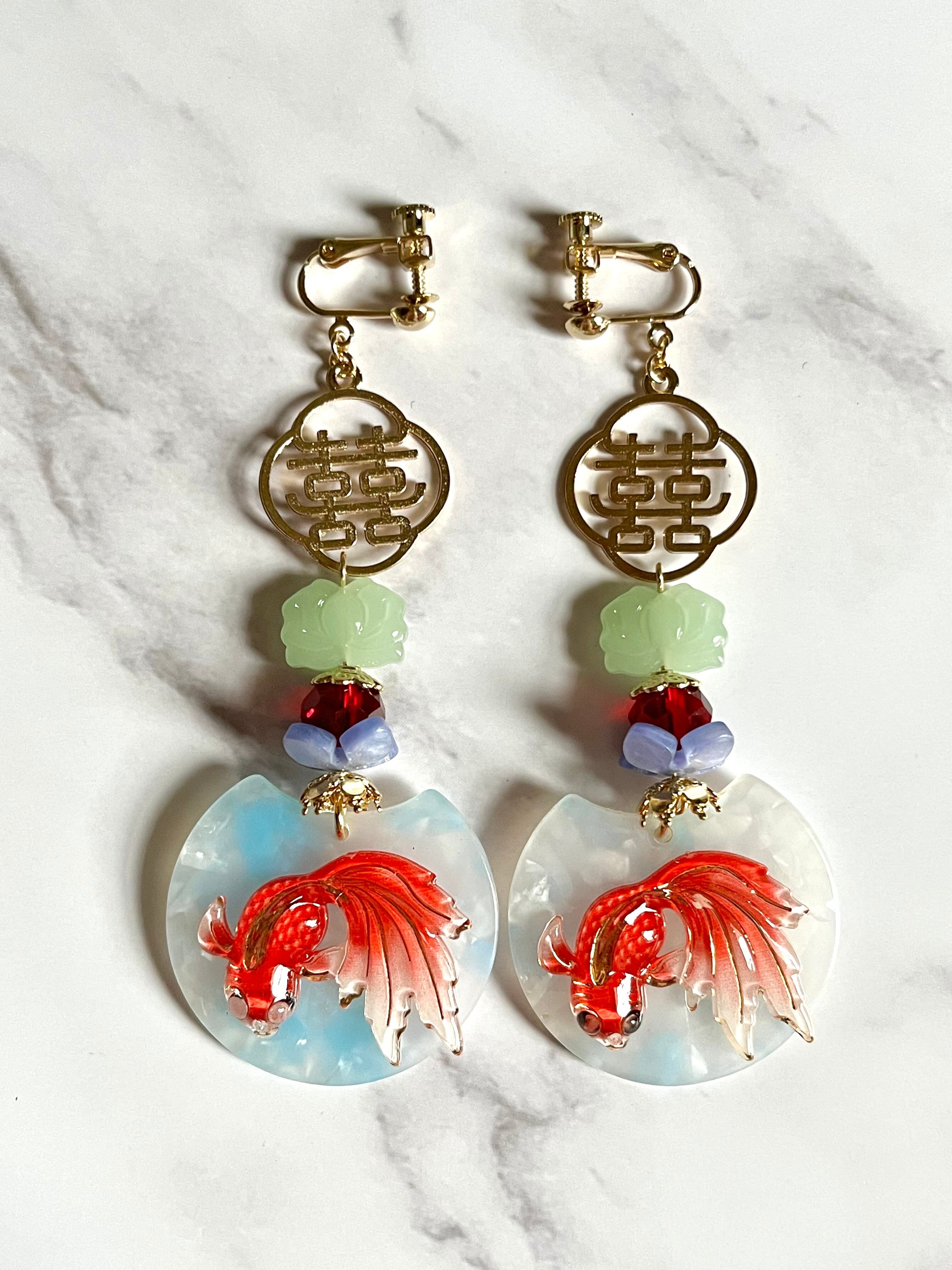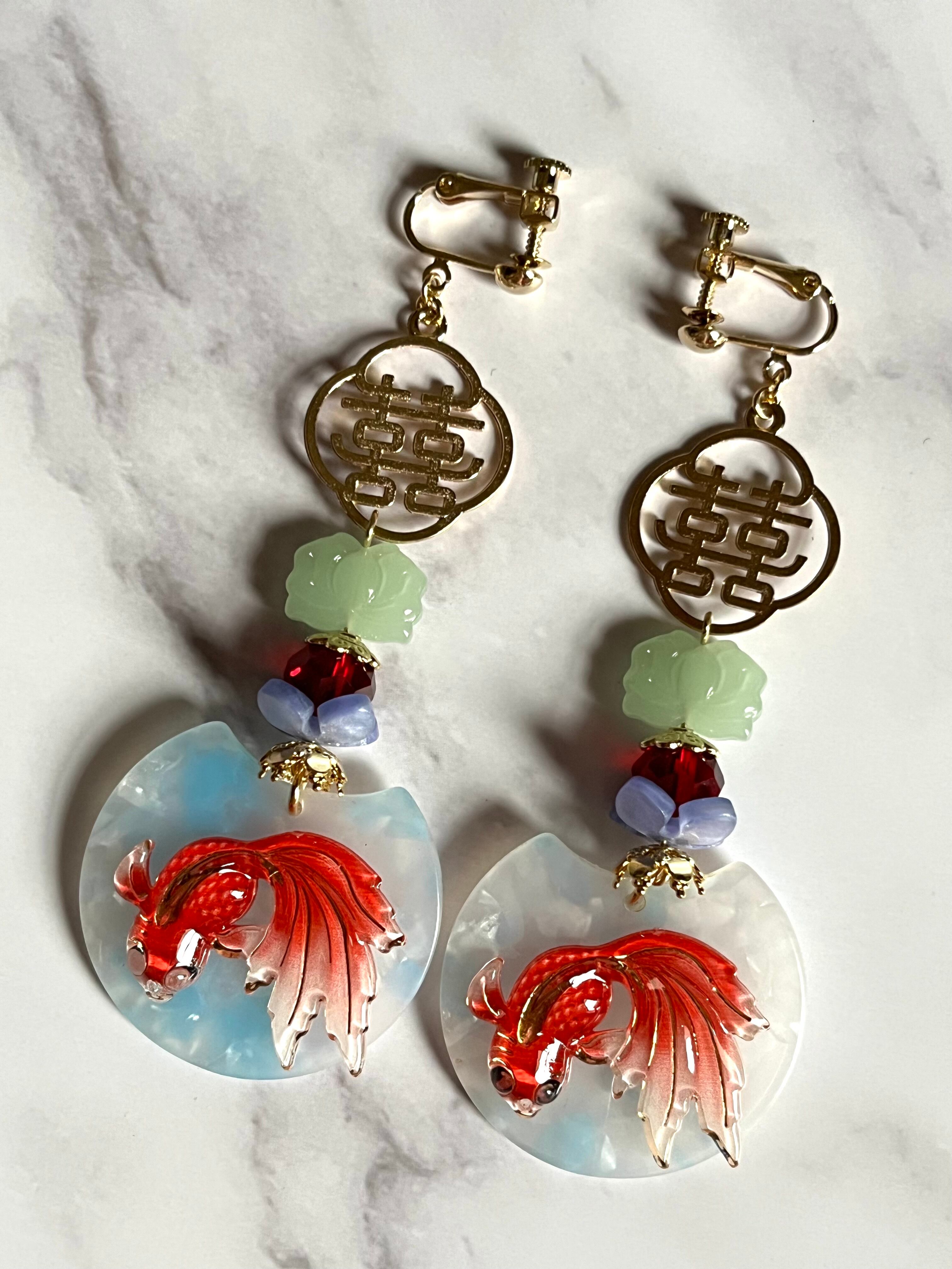 金魚モチーフの大ぶりですが軽やかなデザインの耳飾りです。