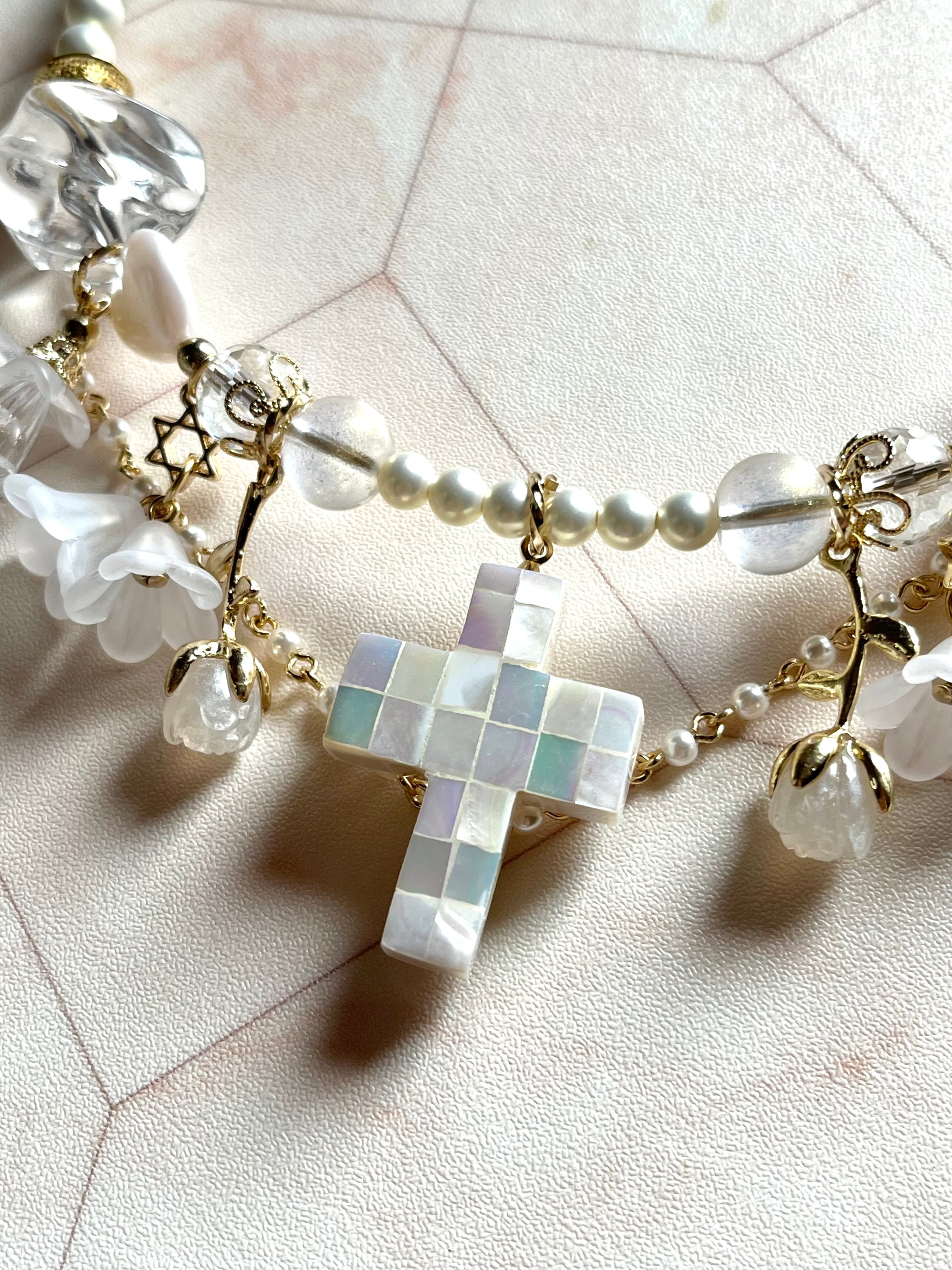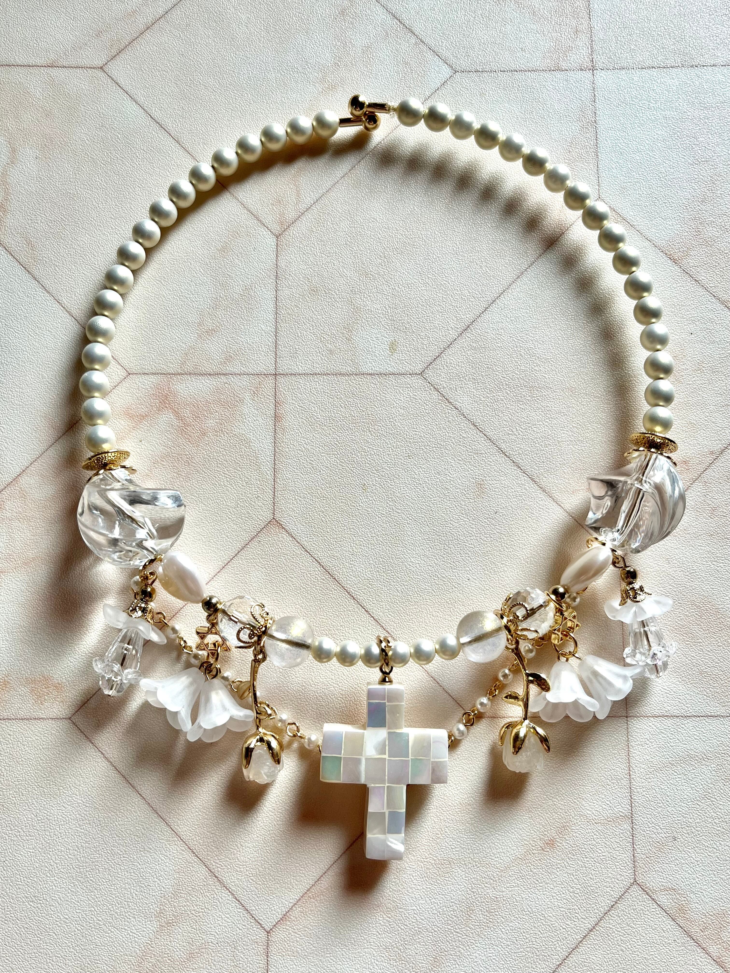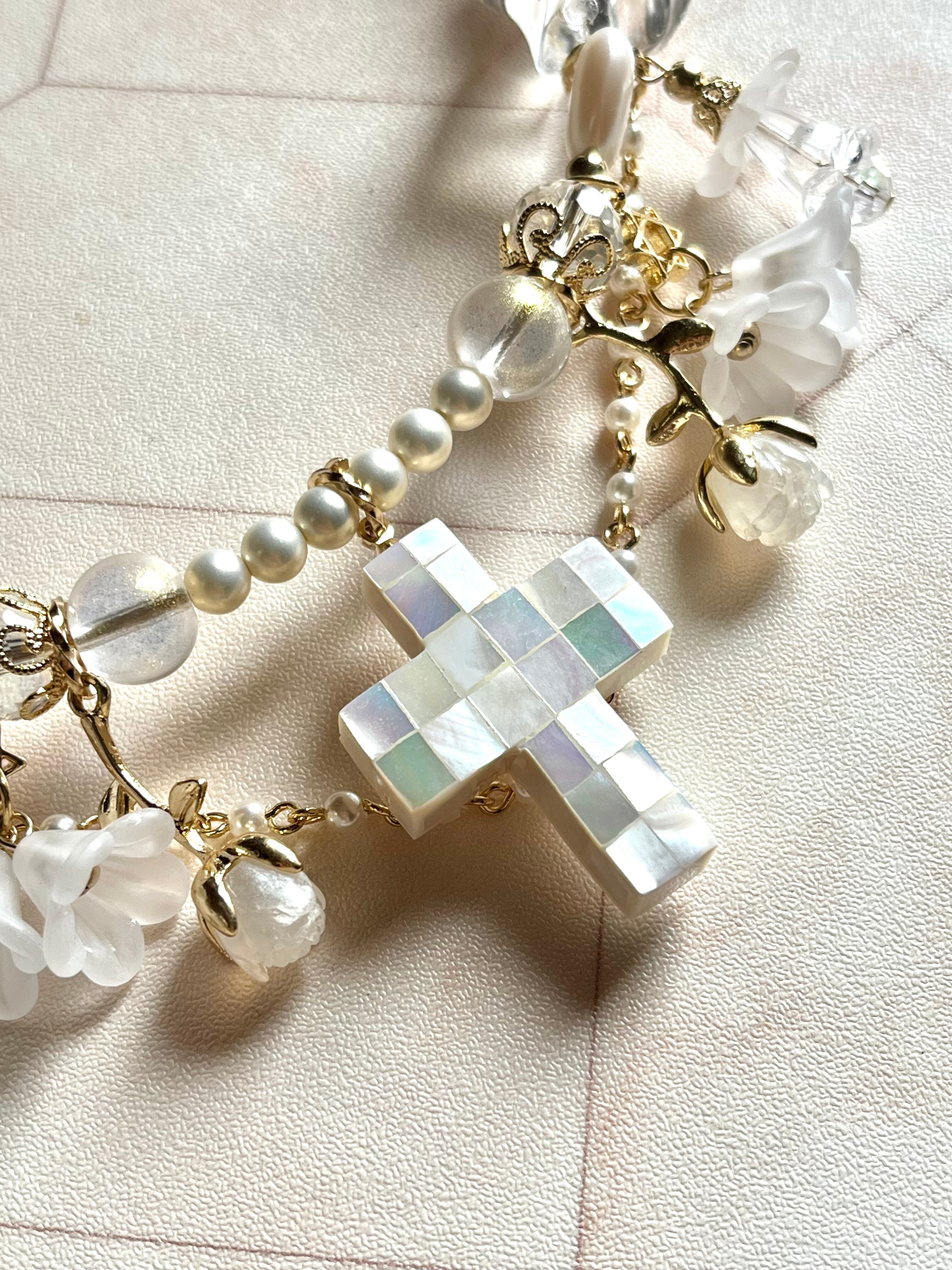 貝細工の十字架が印象的なフープネックレスです。