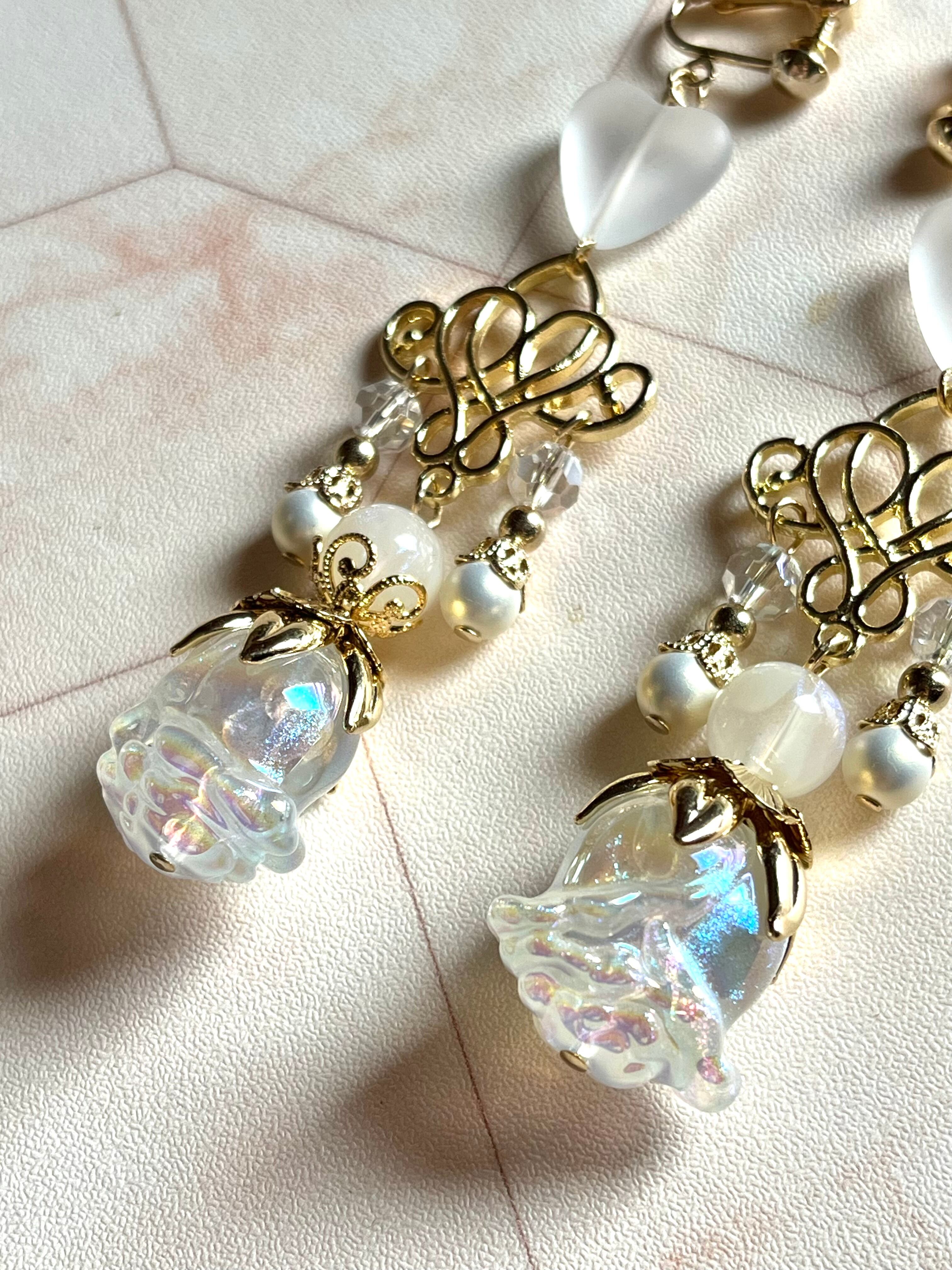 早朝の霞がかった薔薇園。朝露に濡れたような透明感のある薔薇チャームを使用した耳飾り。