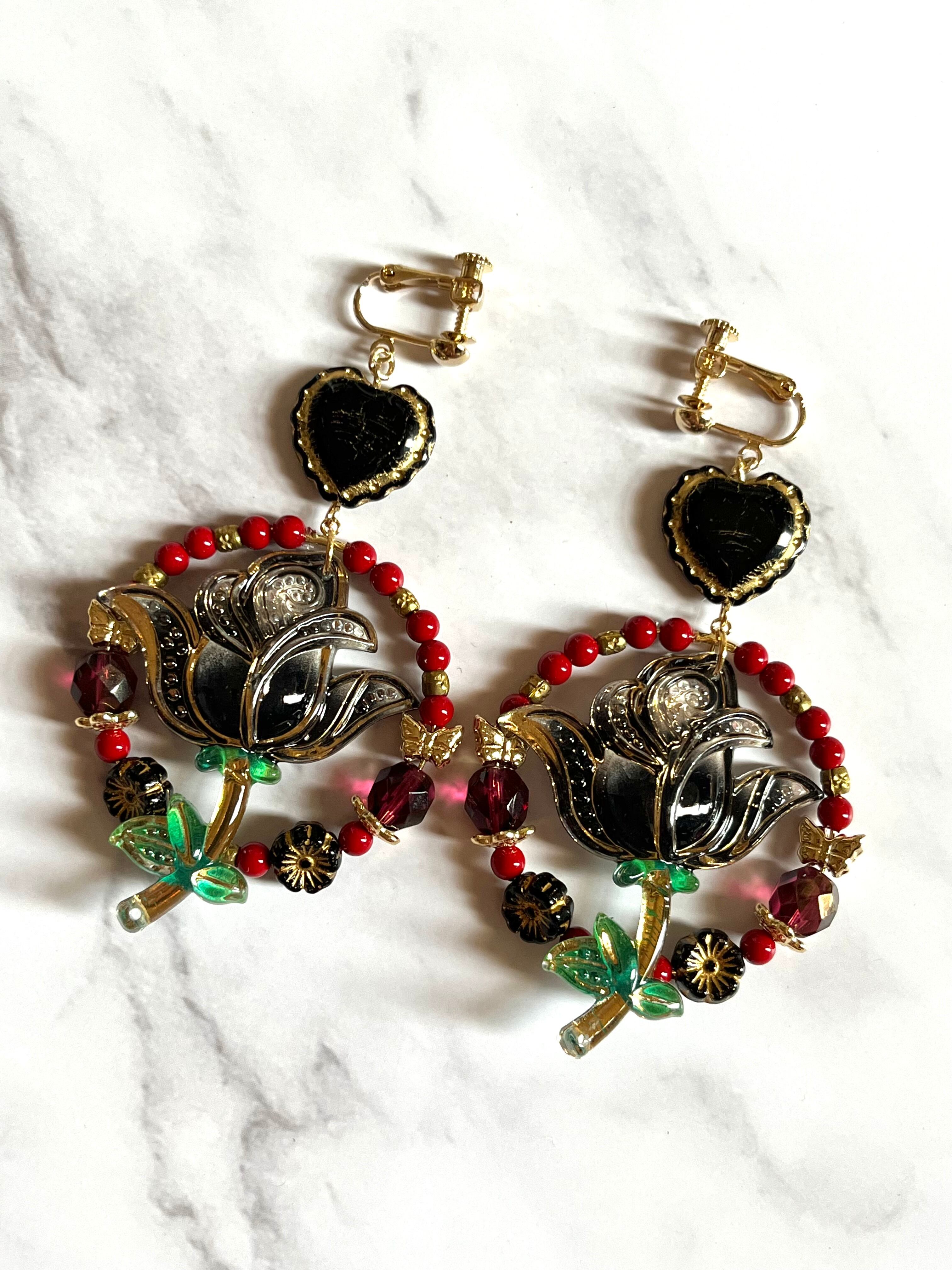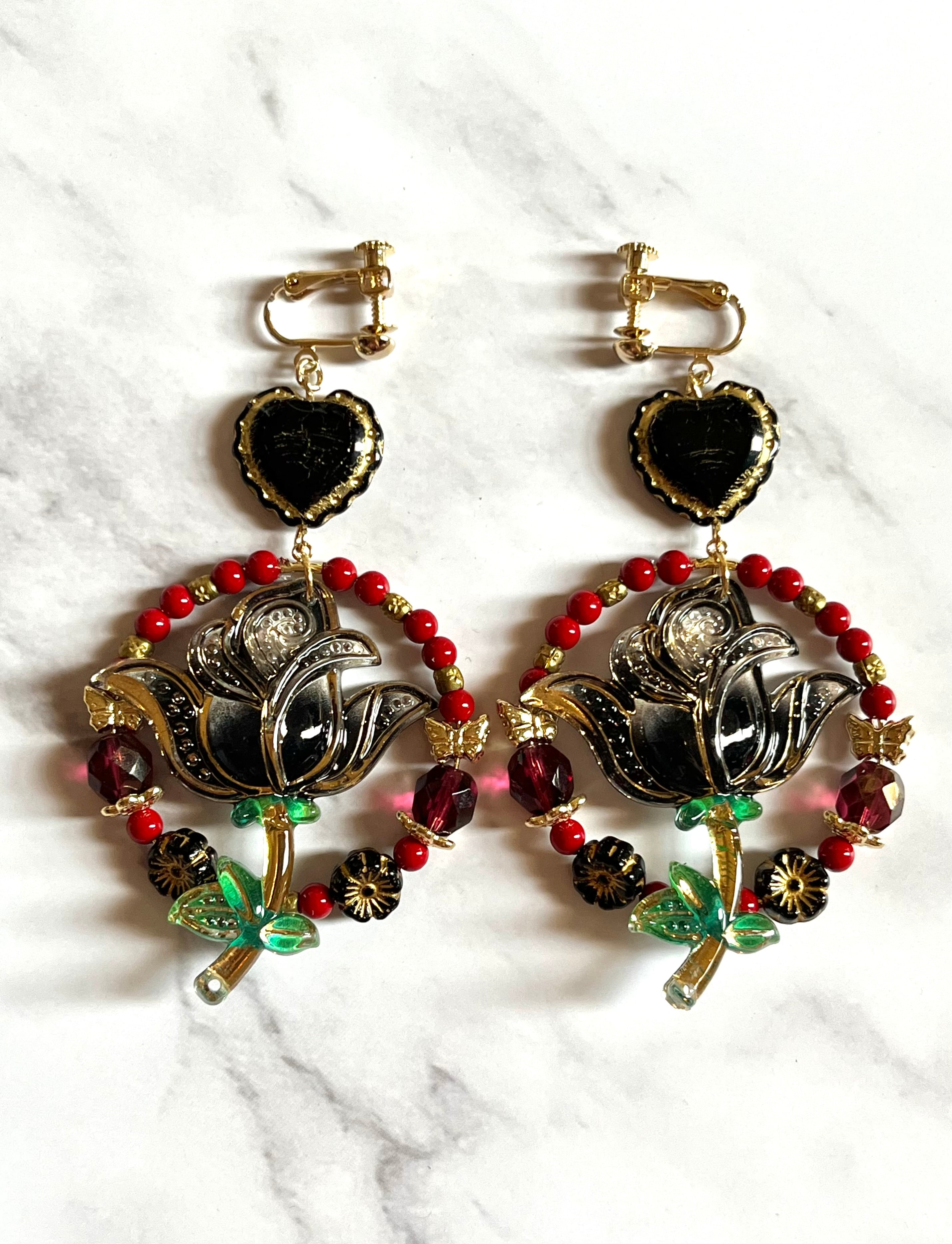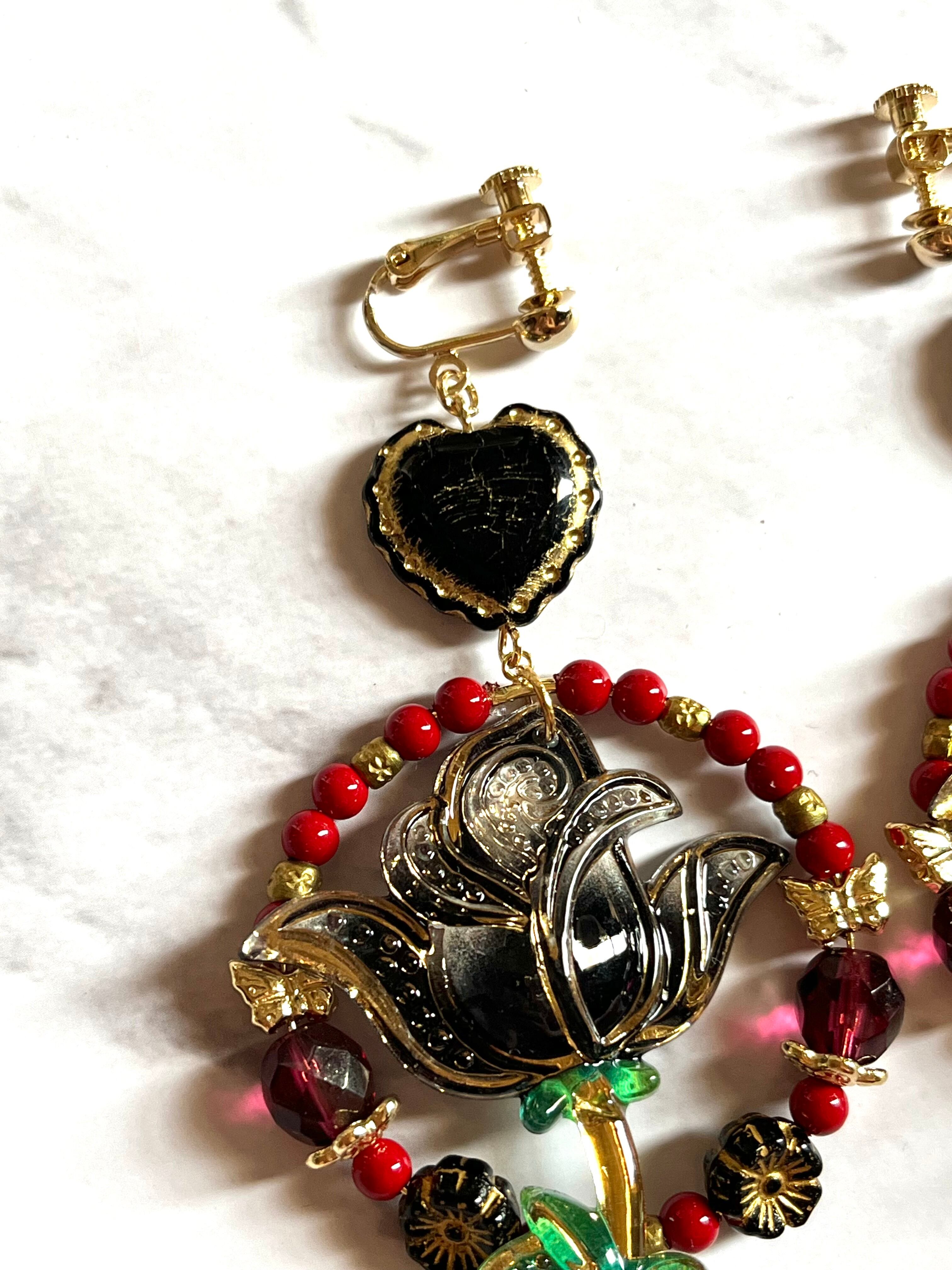 大きな薔薇モチーフが付いたフープデザインの耳飾り。