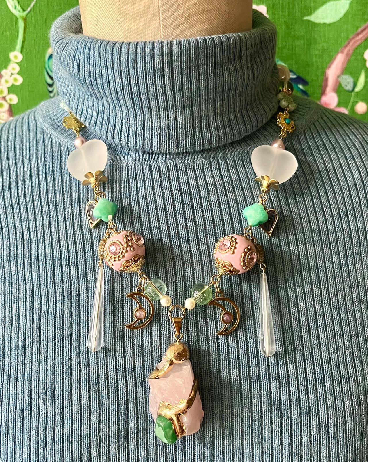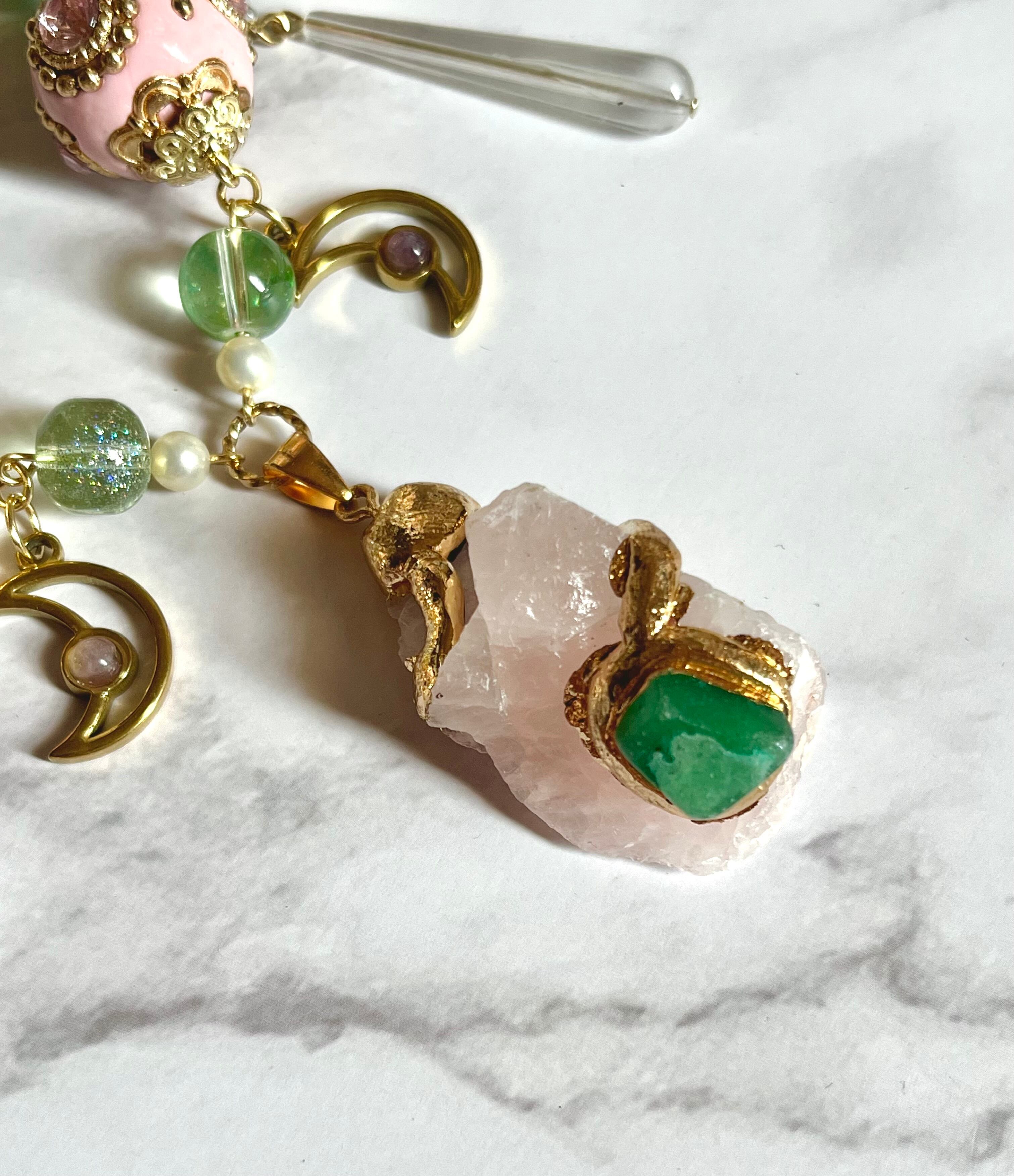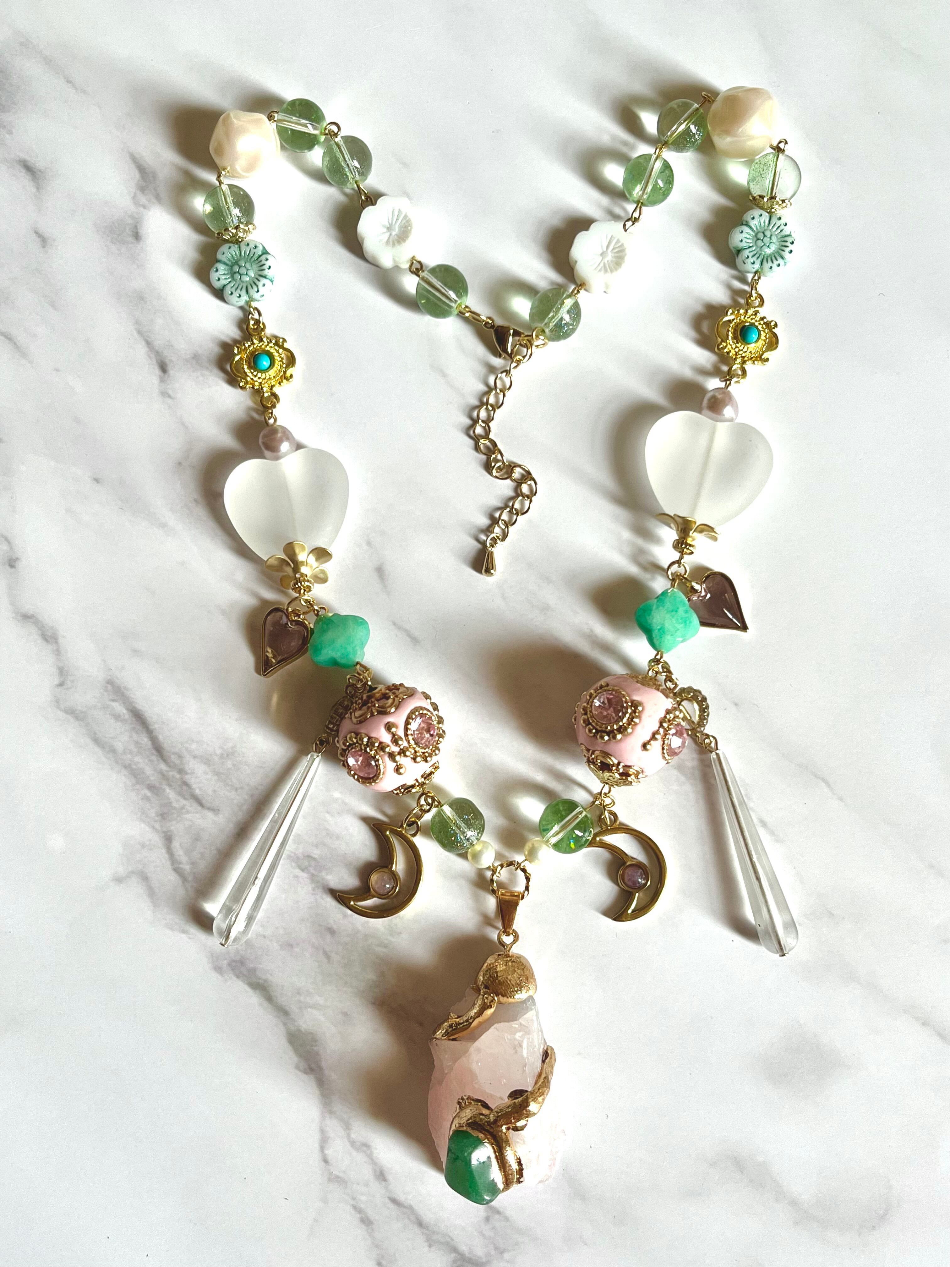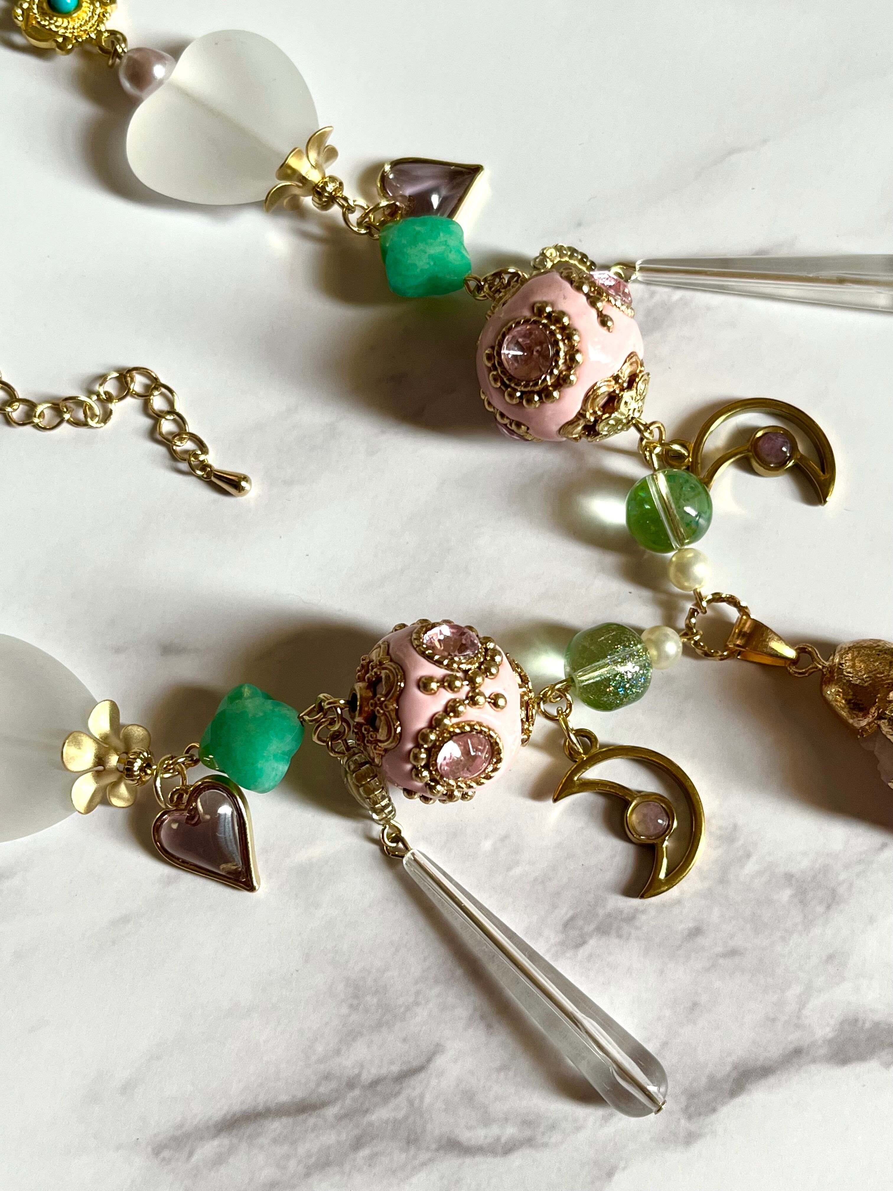 インドネシアビーズや薄ピンクとグリーンのバイカラーに染めてある石チャームなどを使用し、鉱石のお姫様の様なデザインのネックレスを制作しました。