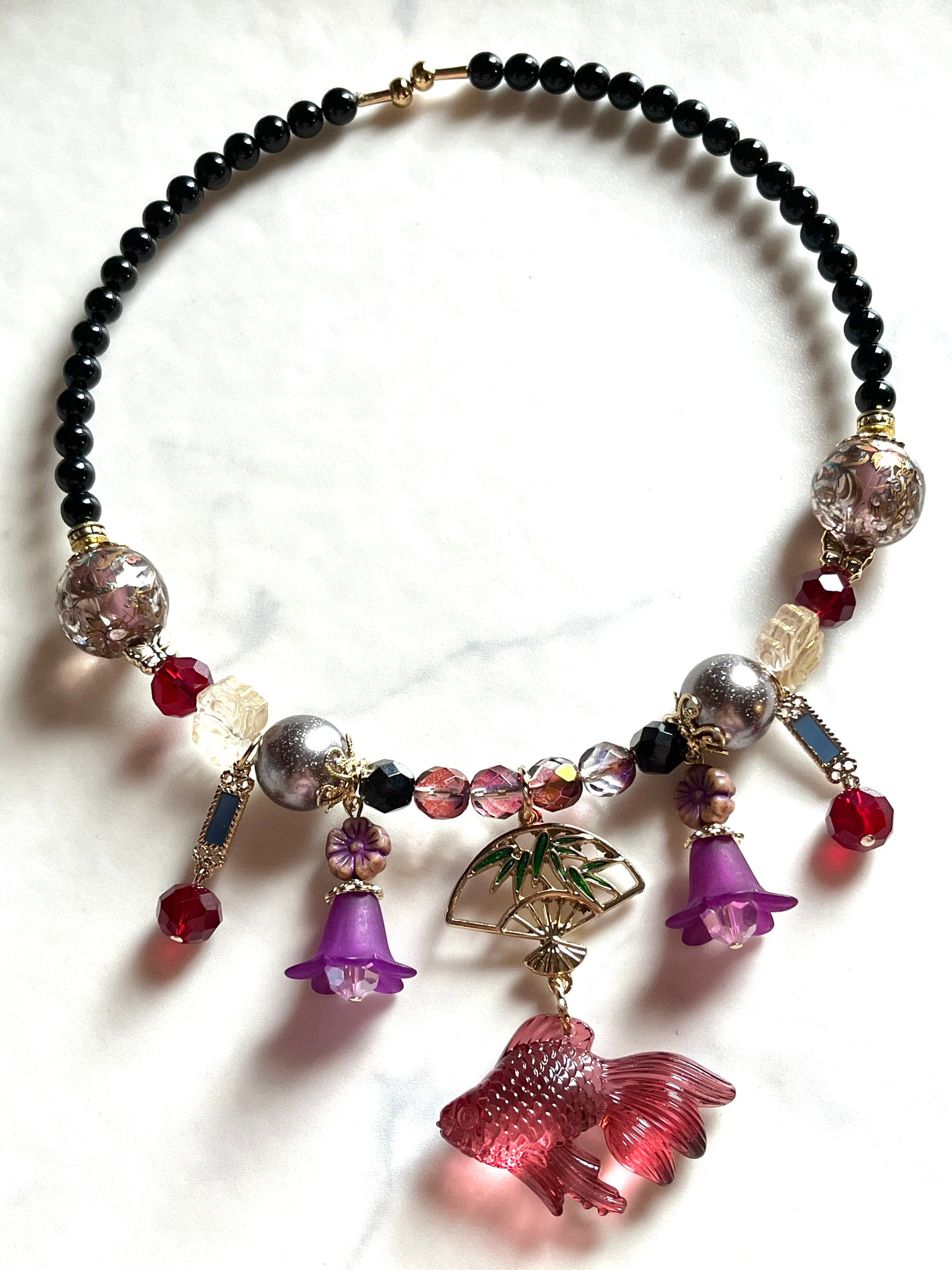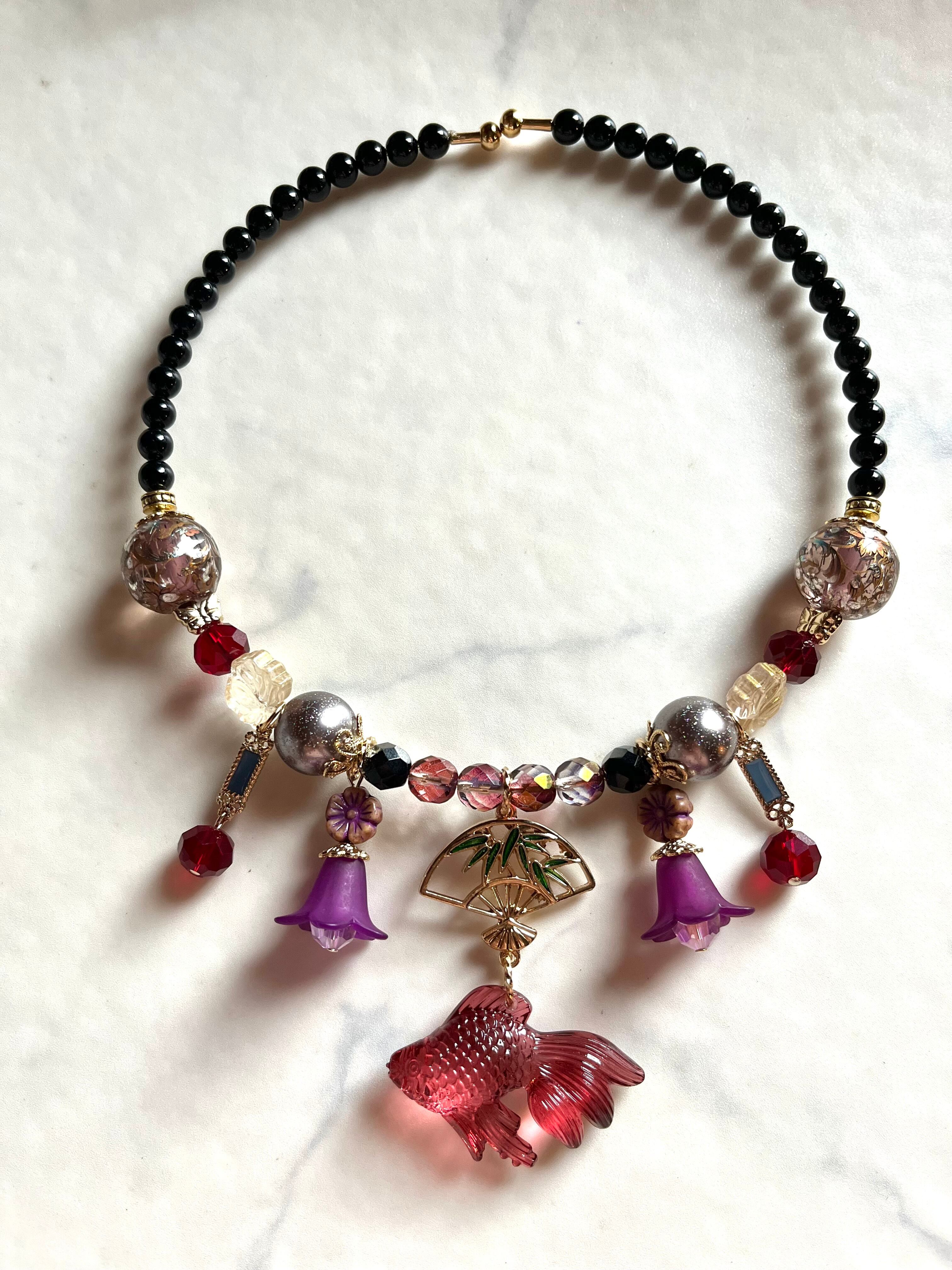 シックな蘇芳色の金魚が浮かぶアクセサリーたち。