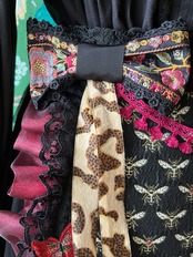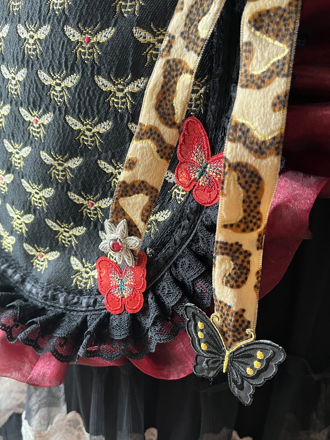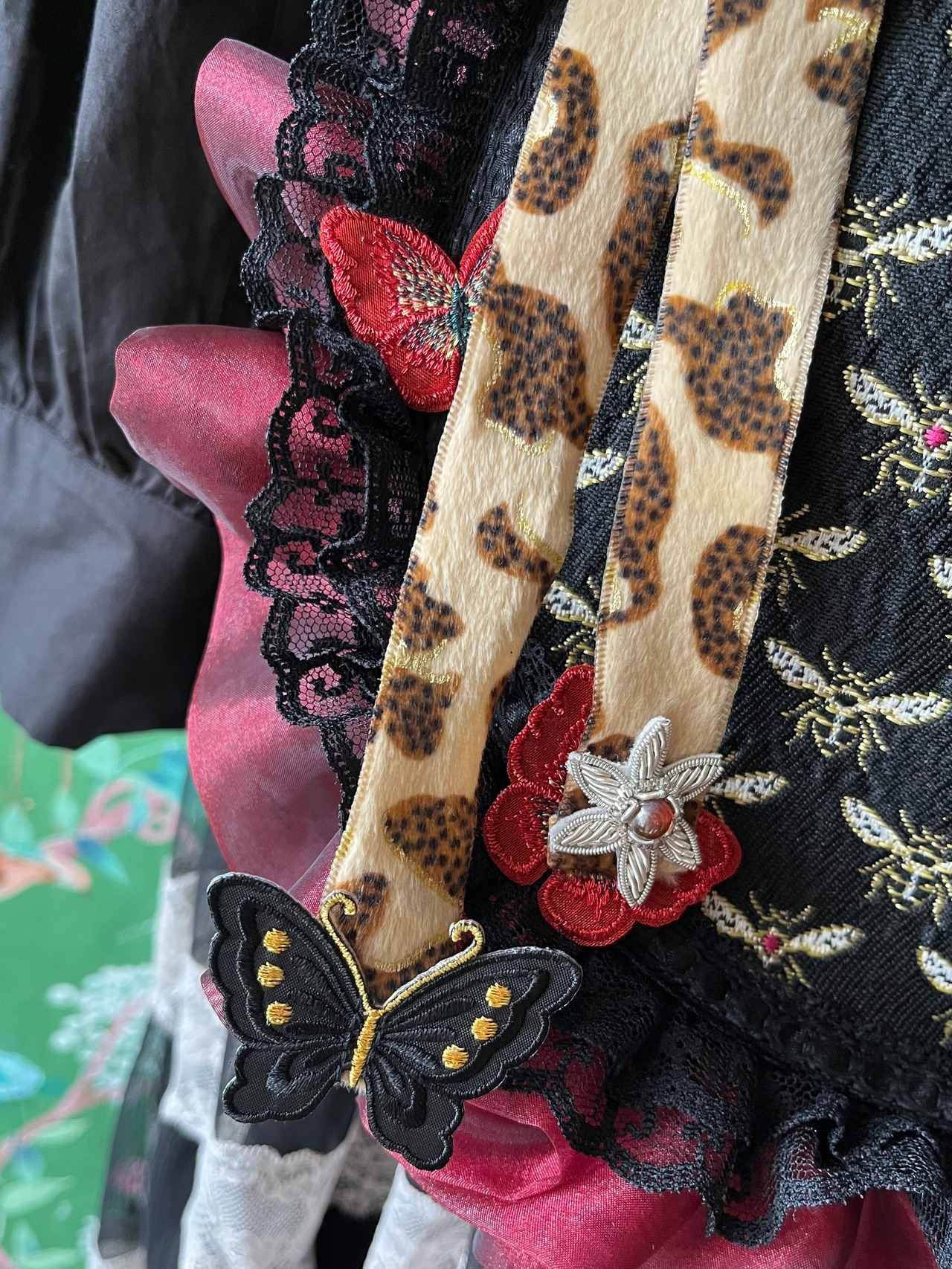 インド刺繍リボンと台湾で見つけたレオパード柄の起毛リボンをアクセントに使用しました。