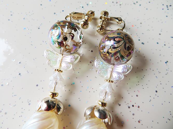 オーロラの蝶々と繭のようなツイストパールが美しいイヤリング。