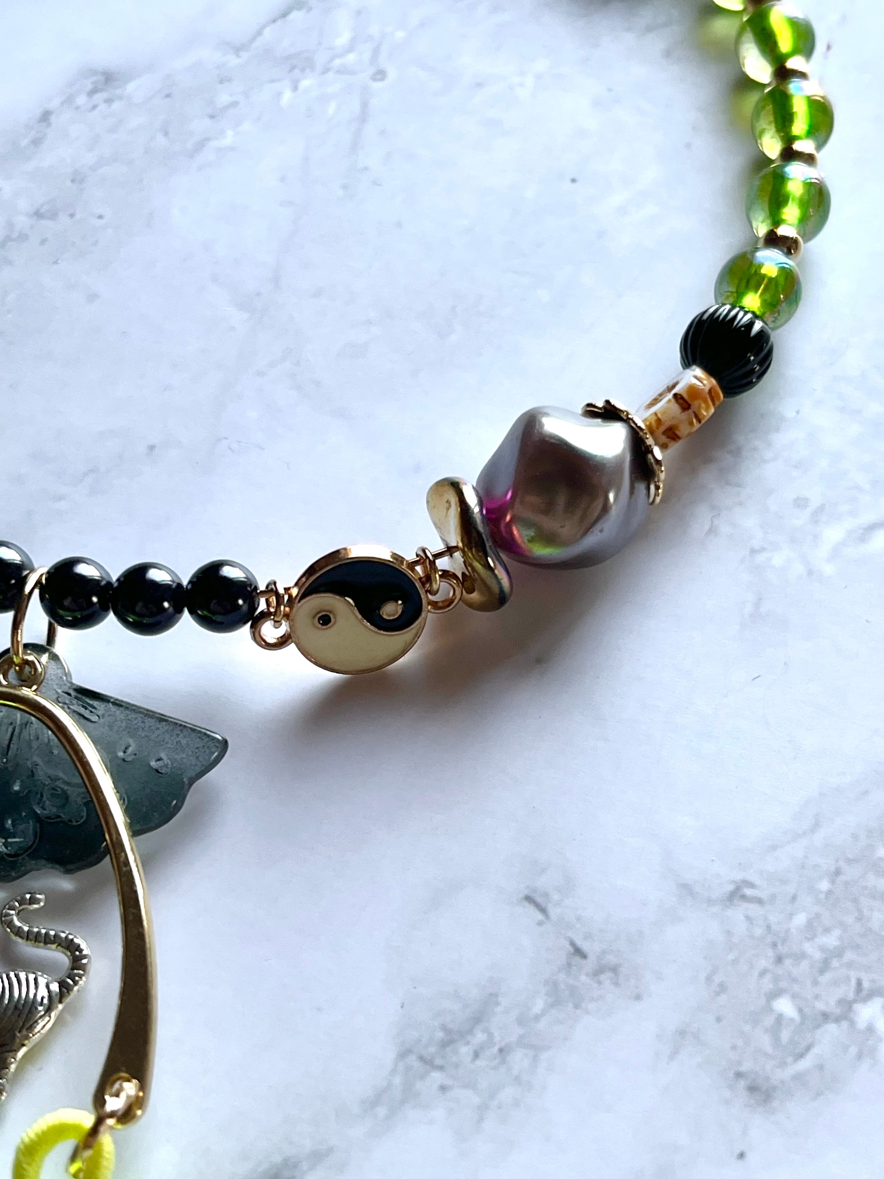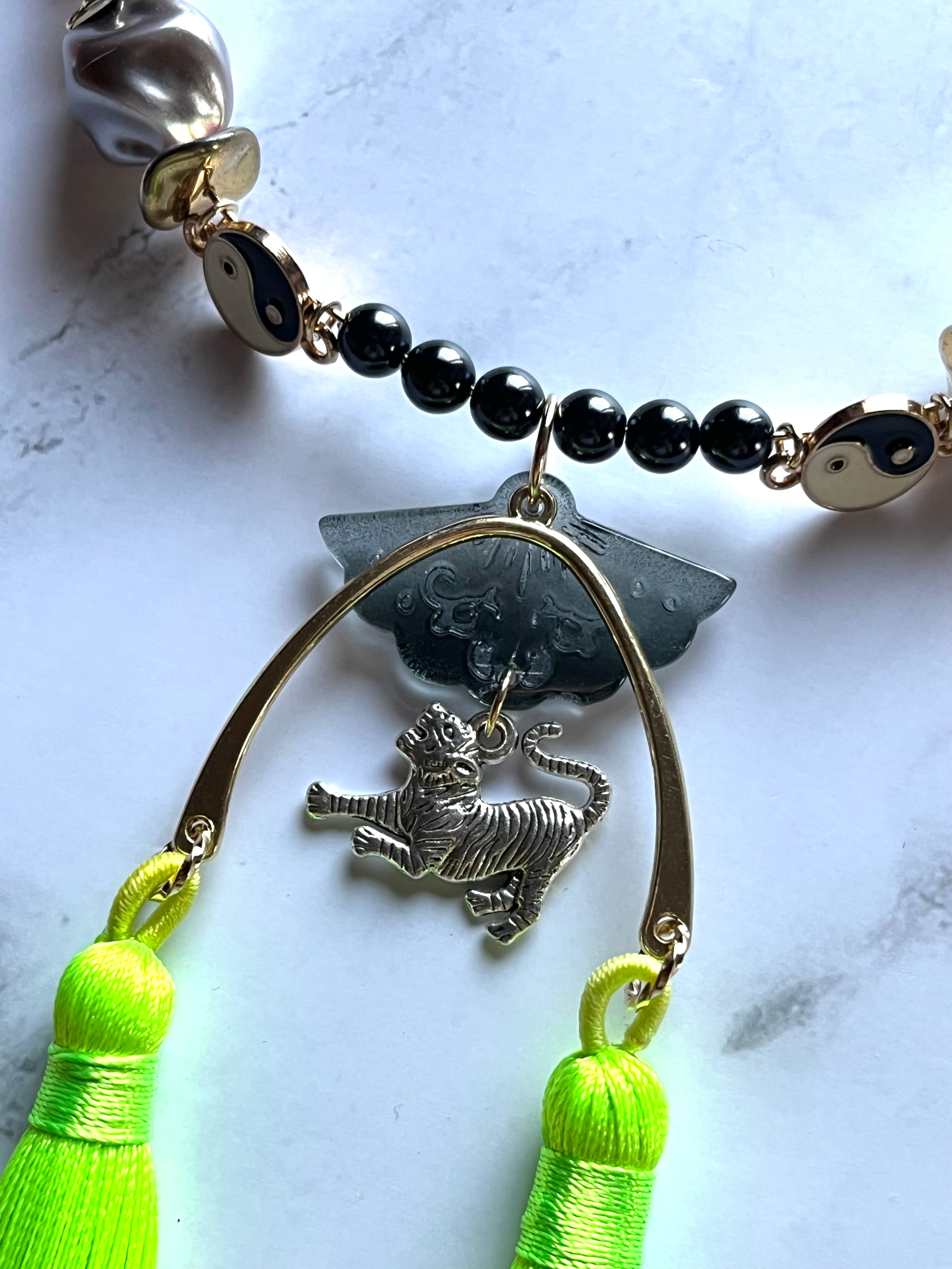 ネオングリーンなカラーとブラック、陰陽モチーフを合わせた、ストリートな雰囲気のあるサイバーチャイナデザインです。