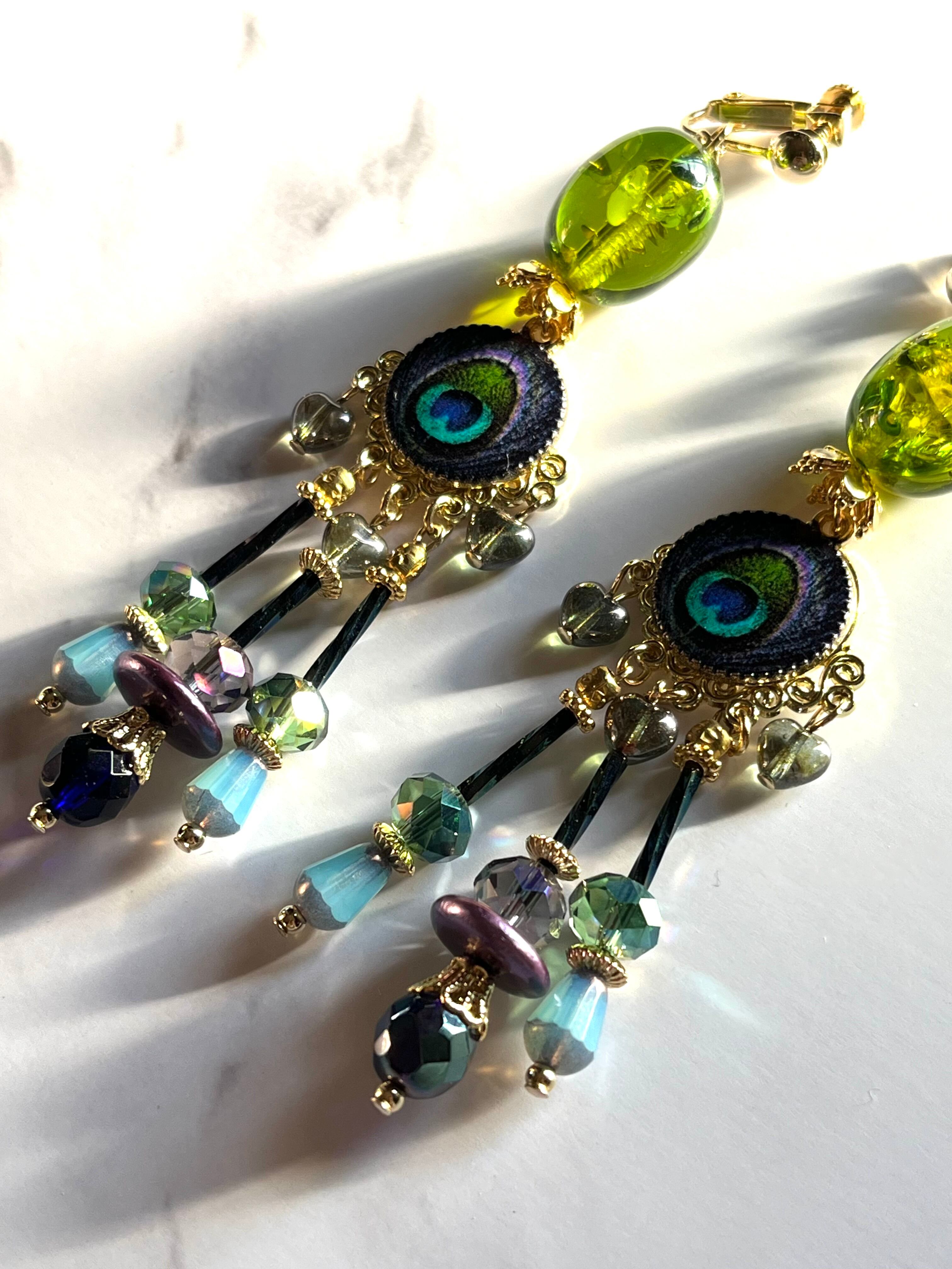 孔雀や蓮モチーフなどのオリエンタルで装飾的な耳飾り。