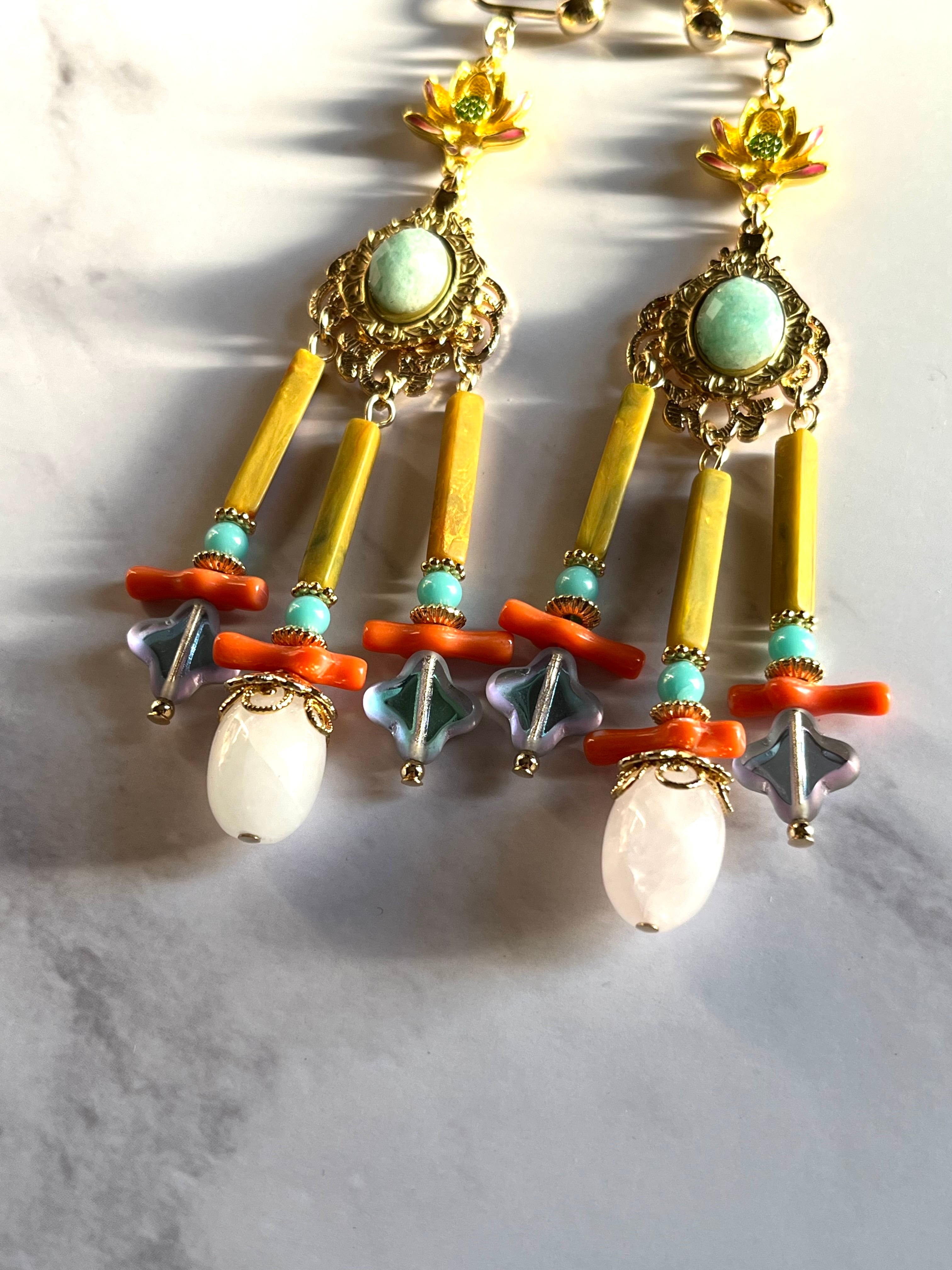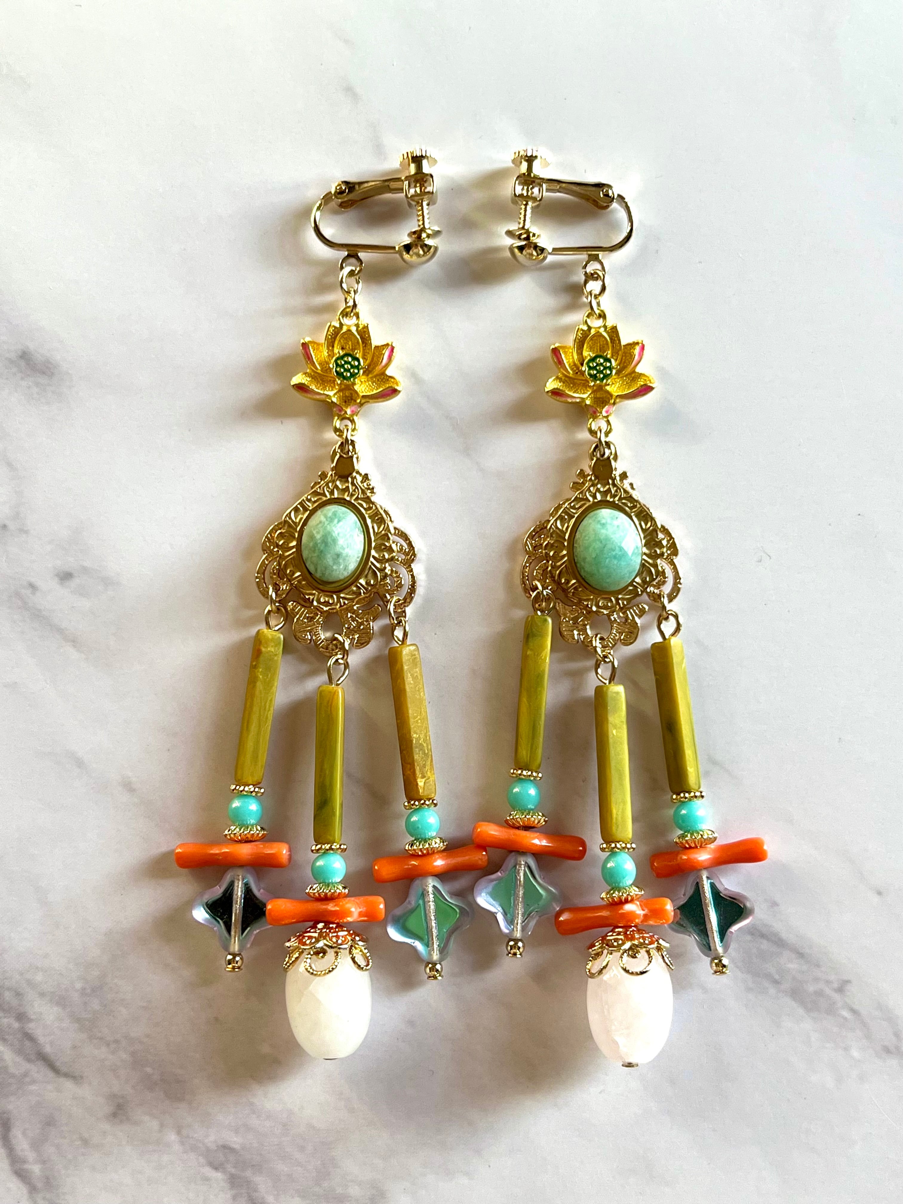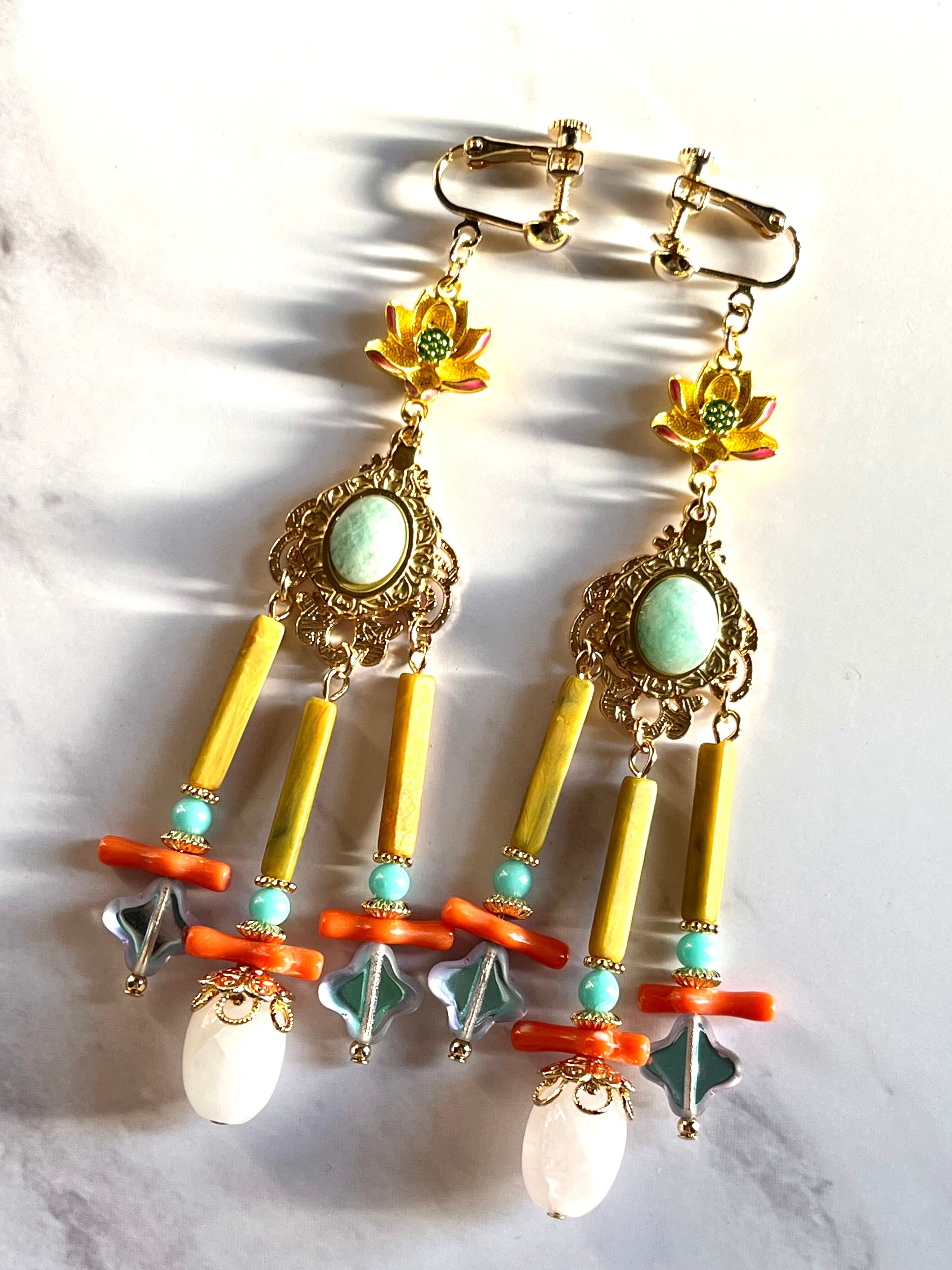 孔雀や蓮モチーフなどのオリエンタルで装飾的な耳飾り。