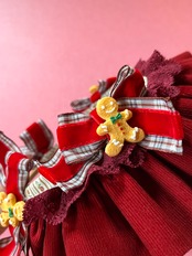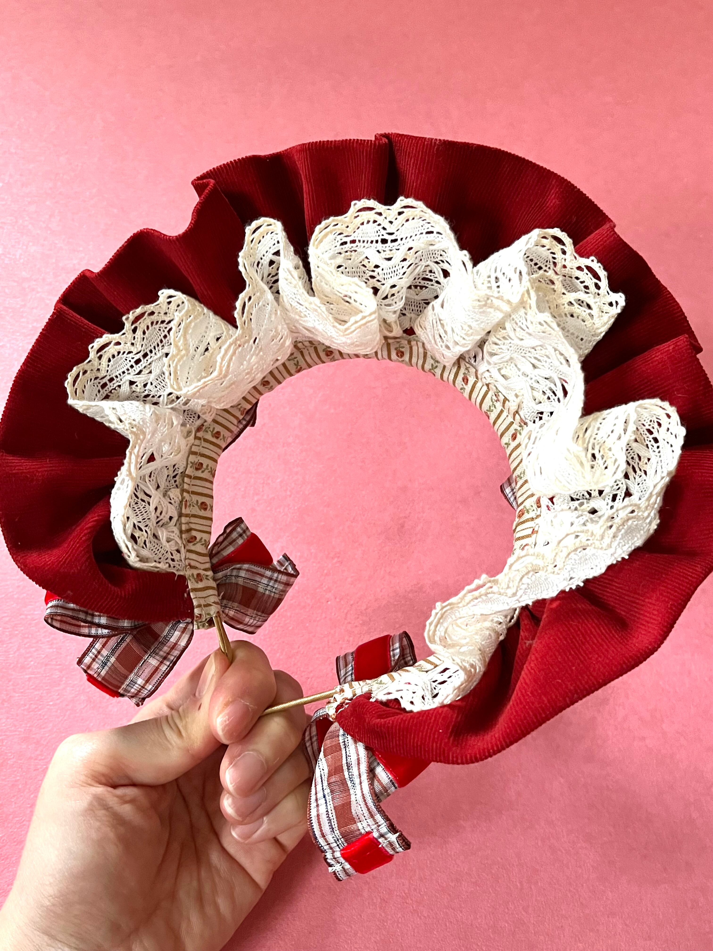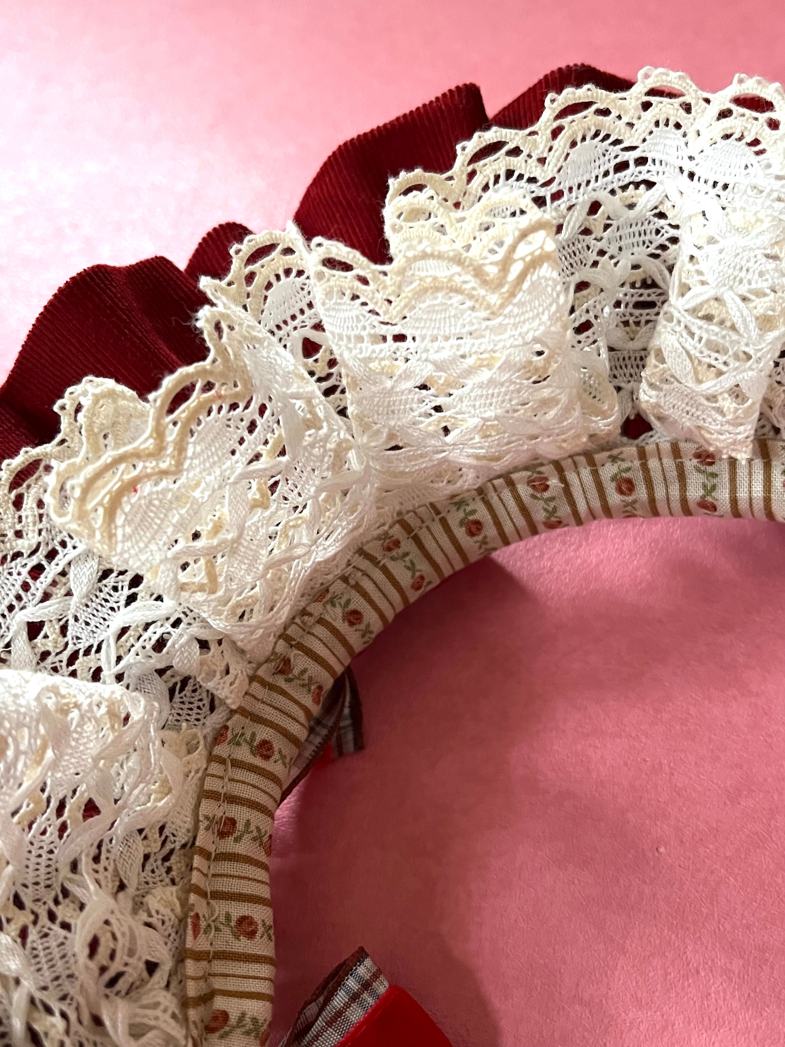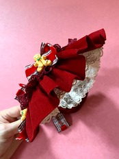 素材:キャストパーツ、プラスチックパール、コーデュロイ、綿プリント生地、トーションレース、りぼんなど