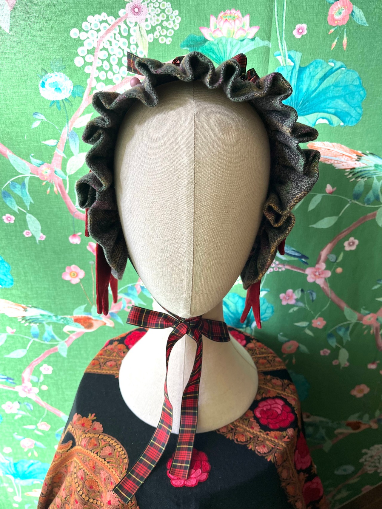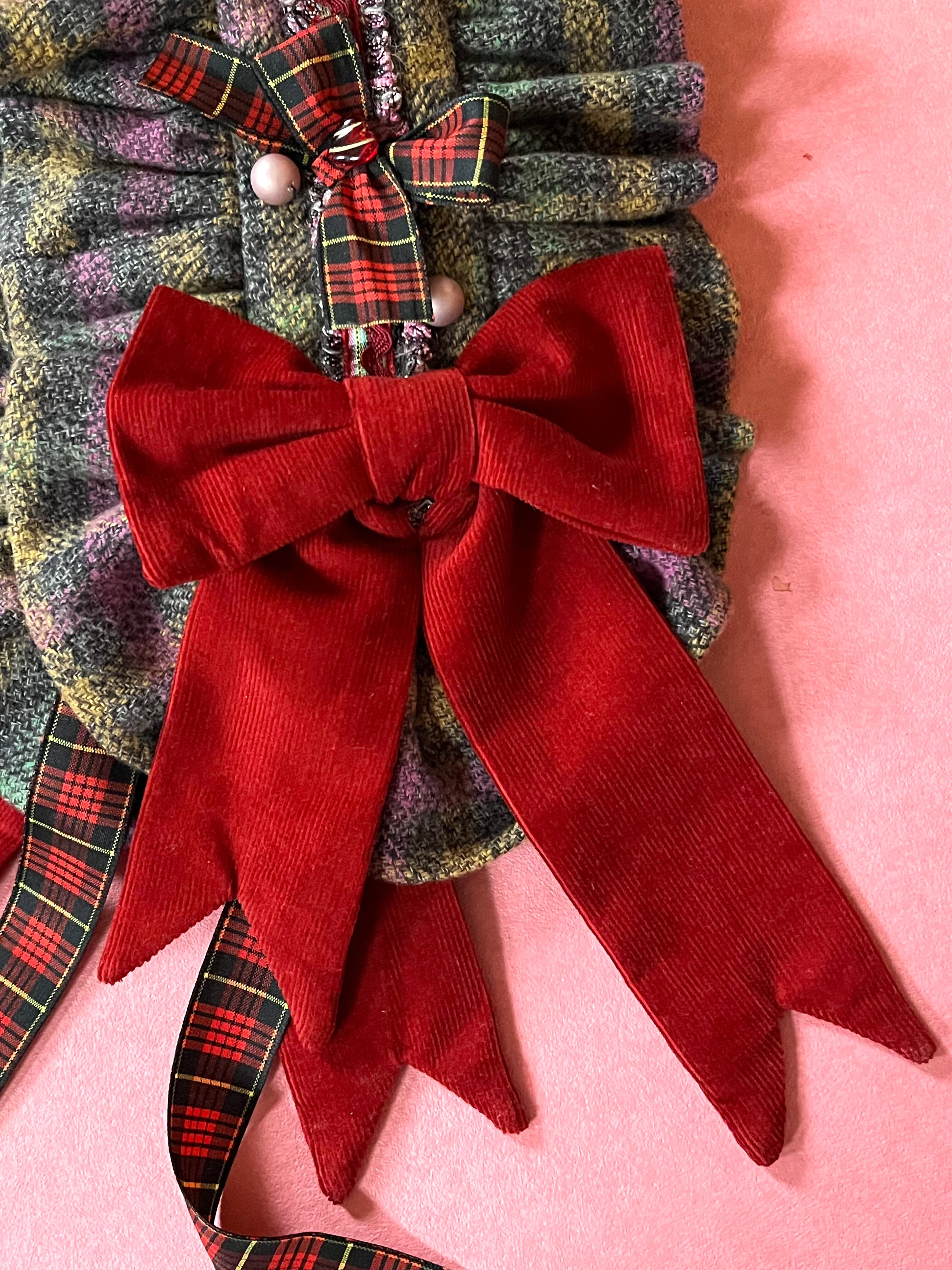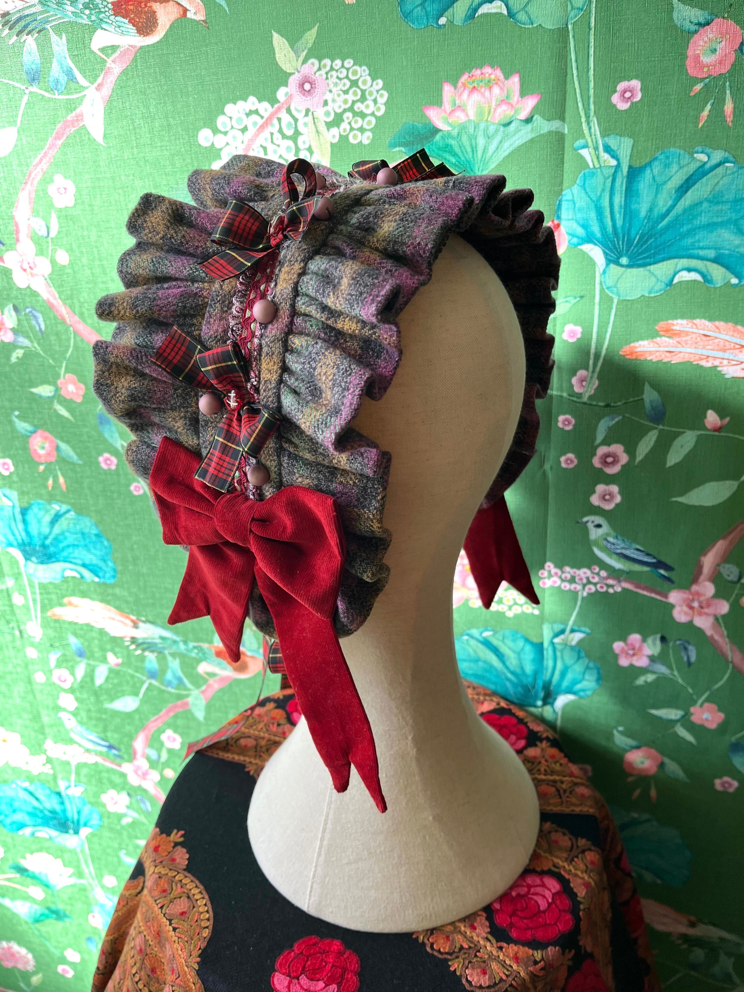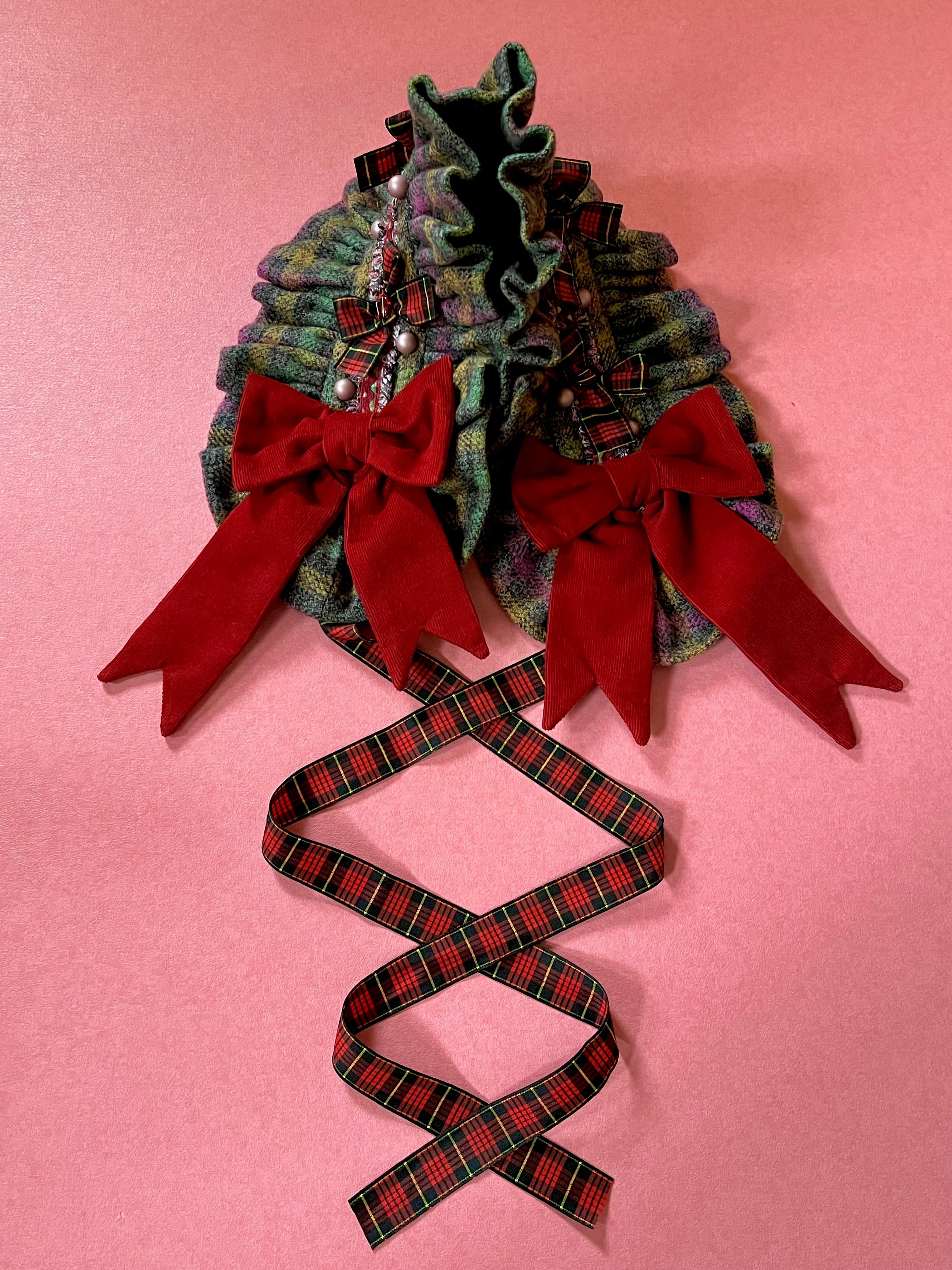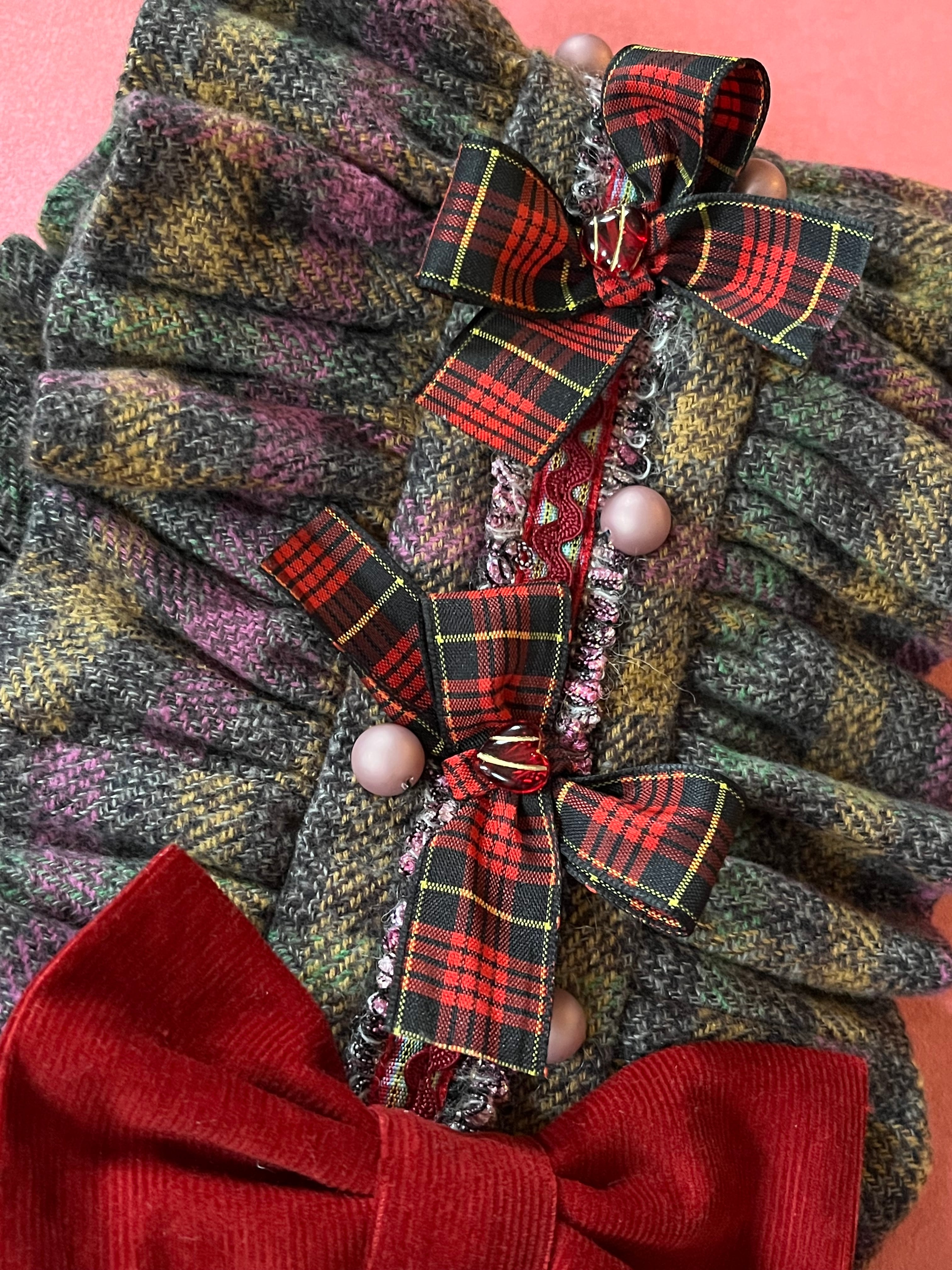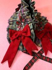素材:チェコ硝子ビーズ、キャストパーツ、プラスチックパール、ウールポリ混生地、コーデュロイ、りぼん、ブレードなど