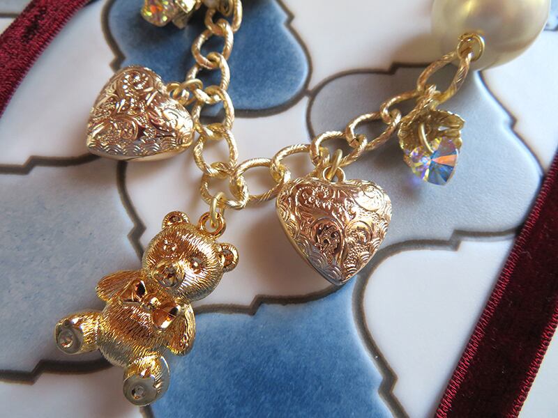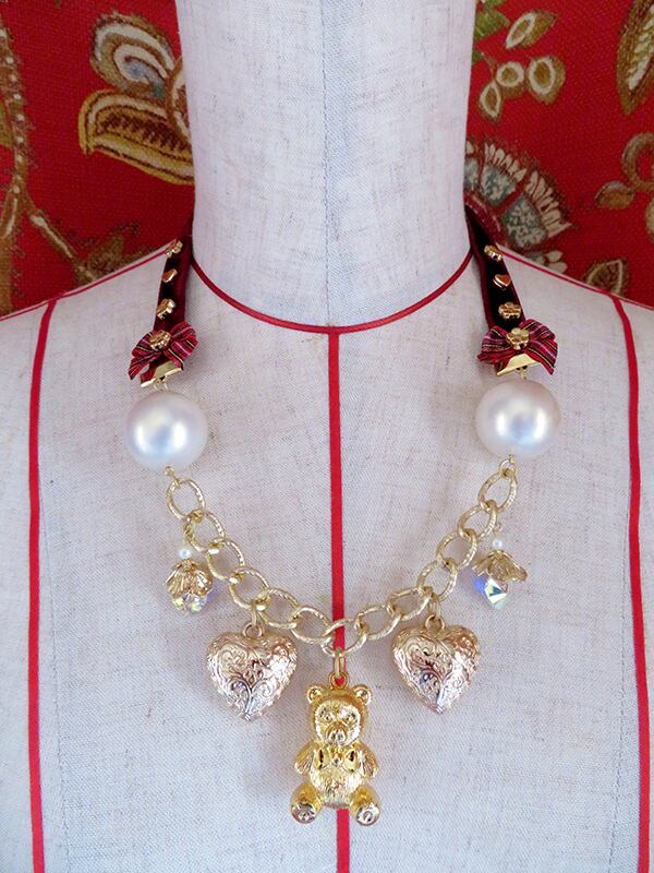 おおぶりのテディベアとハートのチャームが可愛いリボン式ネックレス。