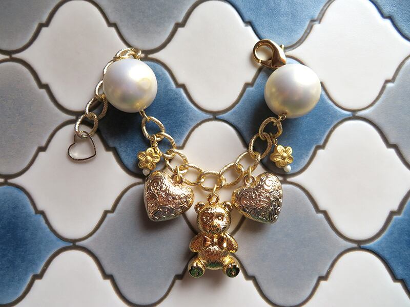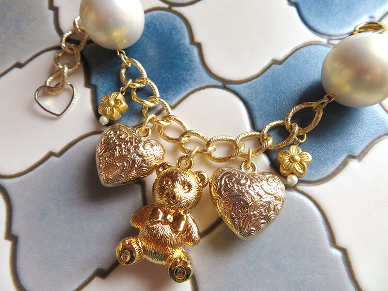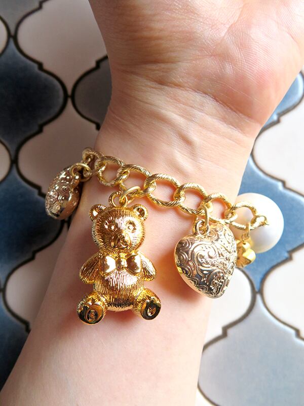 おおぶりのテディベアとハートのチャームが可愛いブレスレット。