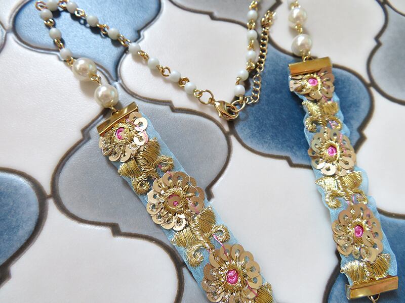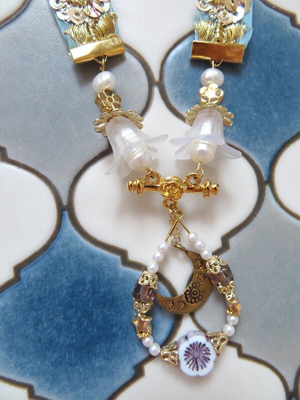 チェコのガラスビーズ、インド製の刺繍りぼんを使用しています。