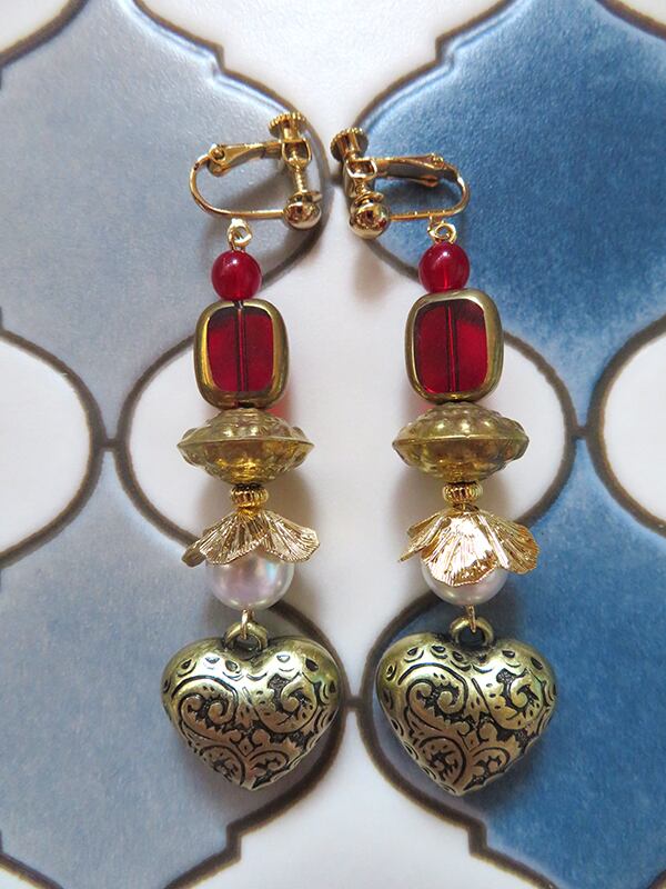 アンティークカラーのハートと、フラワーパーツがロマンティックな耳飾り。