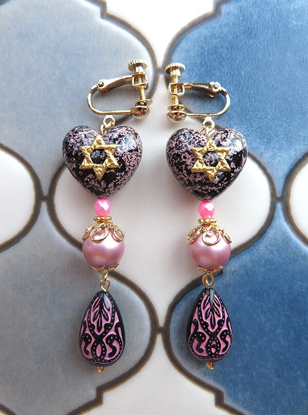 上部のハートのビーズは黒とピンクの模様の出方に個体差があります(黒が多かったりピンクが多かったりします)