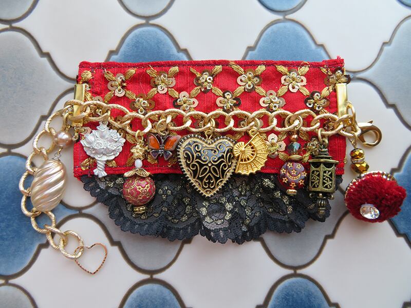 インド製の刺繍リボンにヴィンテージ、海外、日本製のチャームがジャラジャラとついており、着用するととても可愛いです(三枚目イメージ写真)