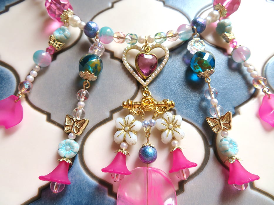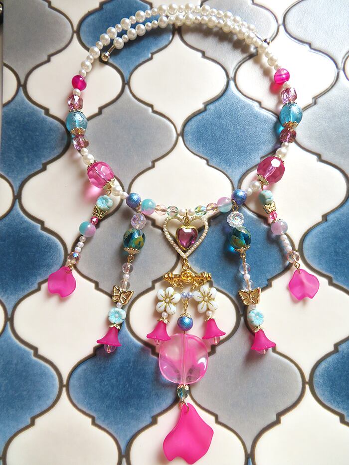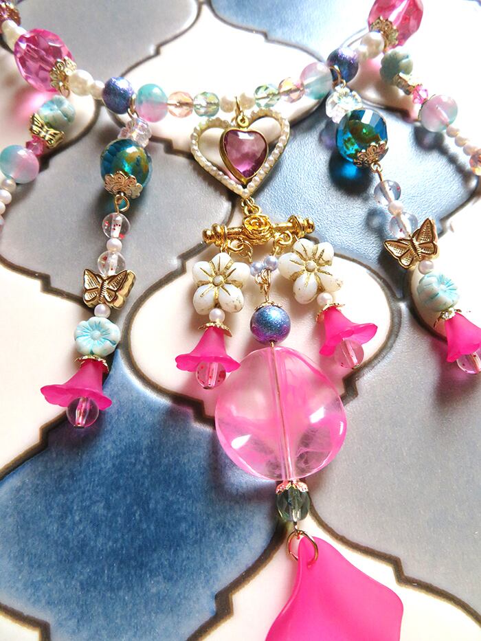 写真だと上手く伝わりませんが、グリッタービーズやオーロラガラス等が輝いて実物はとてもシャイニーなネックレスです。