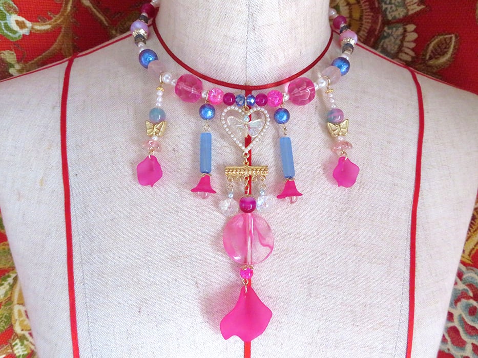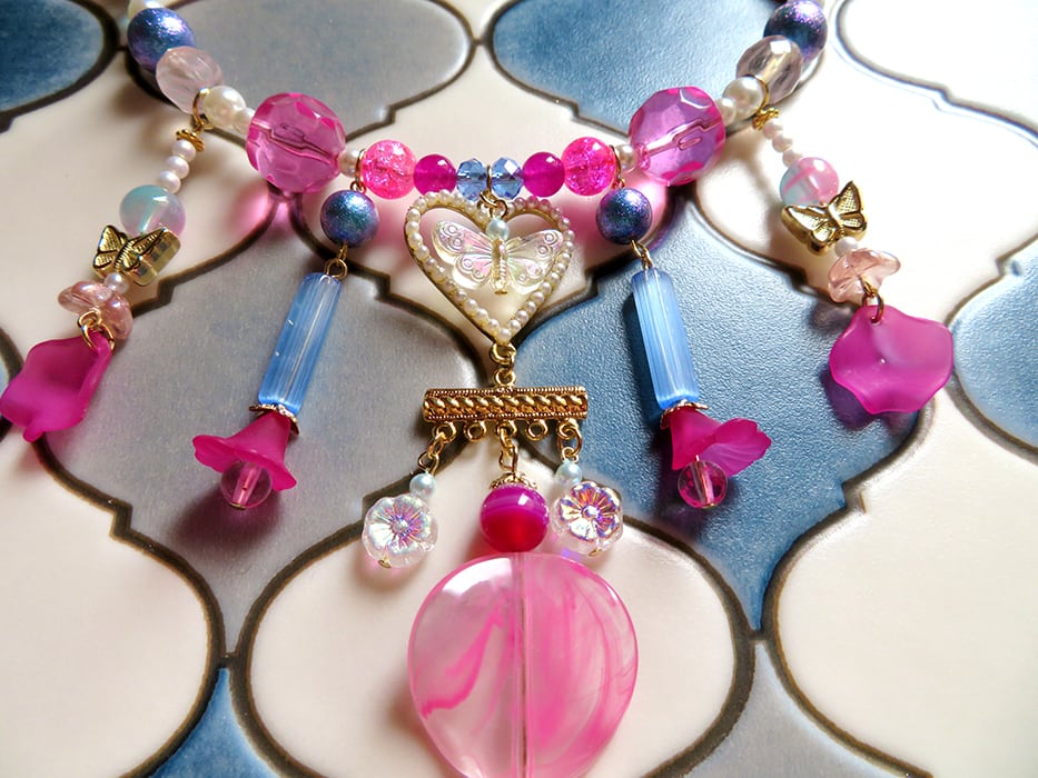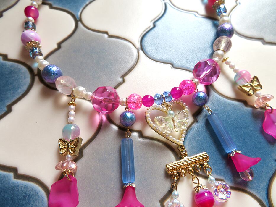 写真だと上手く伝わりませんが、グリッタービーズやオーロラガラス等が輝いて実物はとてもシャイニーなネックレスです。