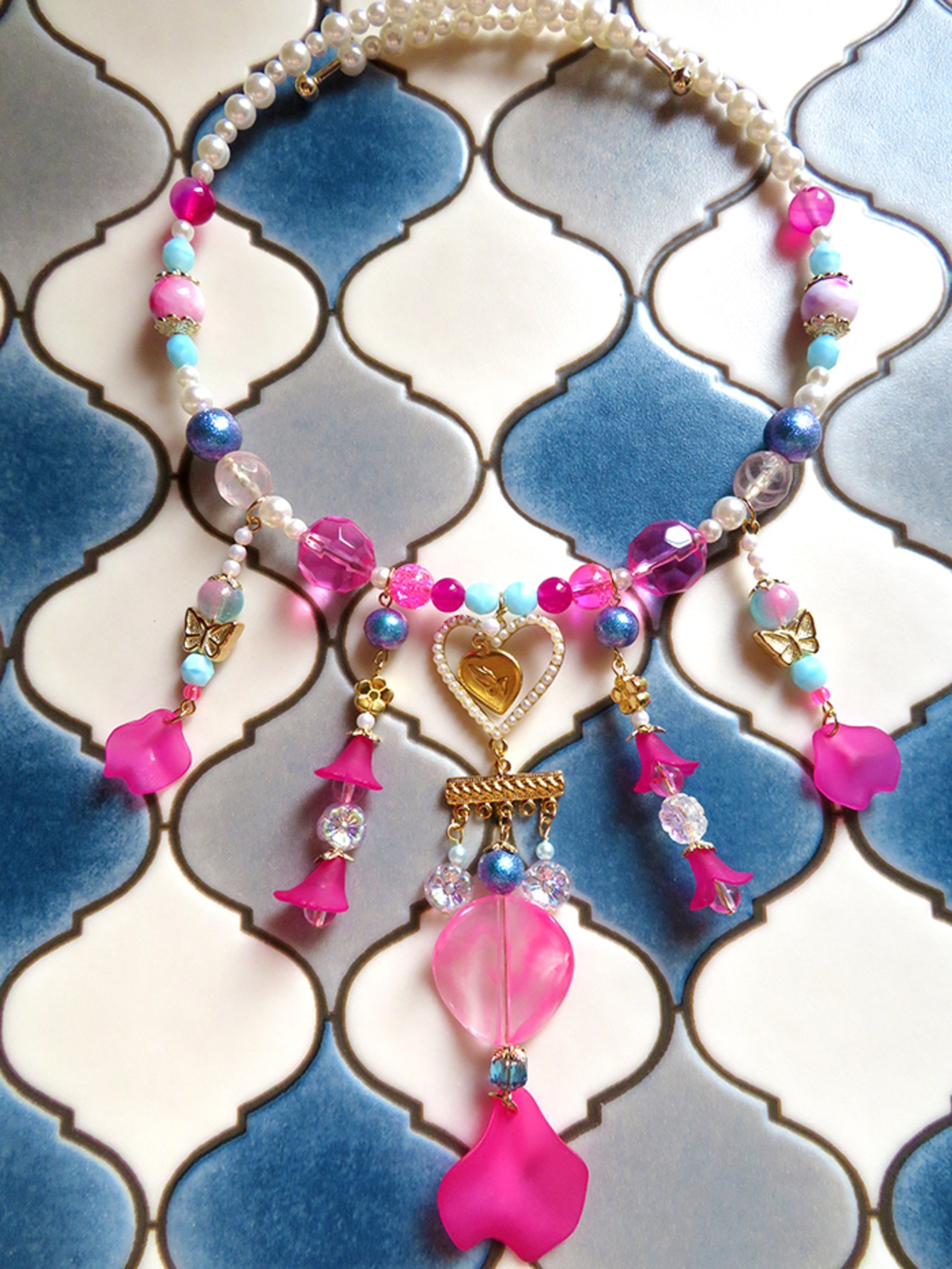写真だと上手く伝わりませんが、グリッタービーズやオーロラガラス等が輝いて実物はとてもシャイニーなネックレスです。