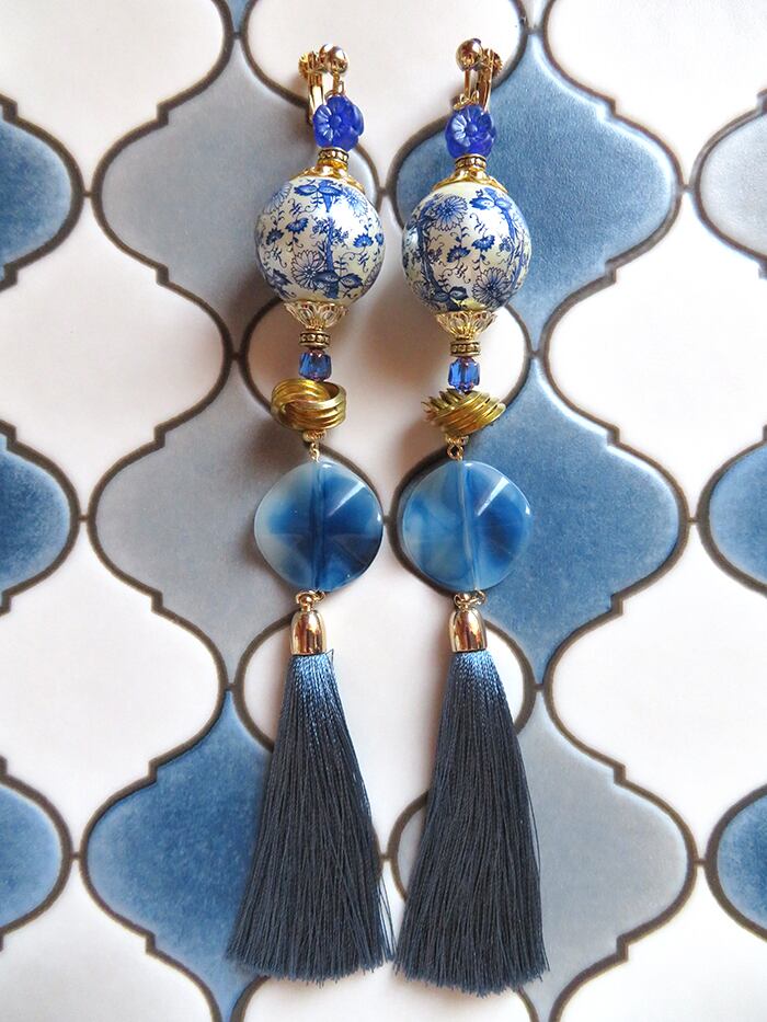 中国の焼き物の柄のような大きな玉ビーズが個性的なデザインです。