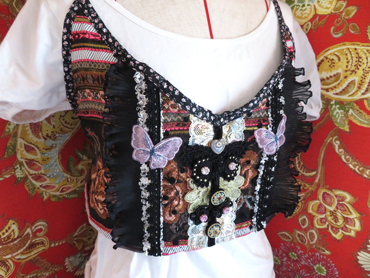 ざっくりと胸元が開いているのでフリル付きのブラウスや、レースキャミ等を組み合わせて色々なレイヤードが出来ると思います。
