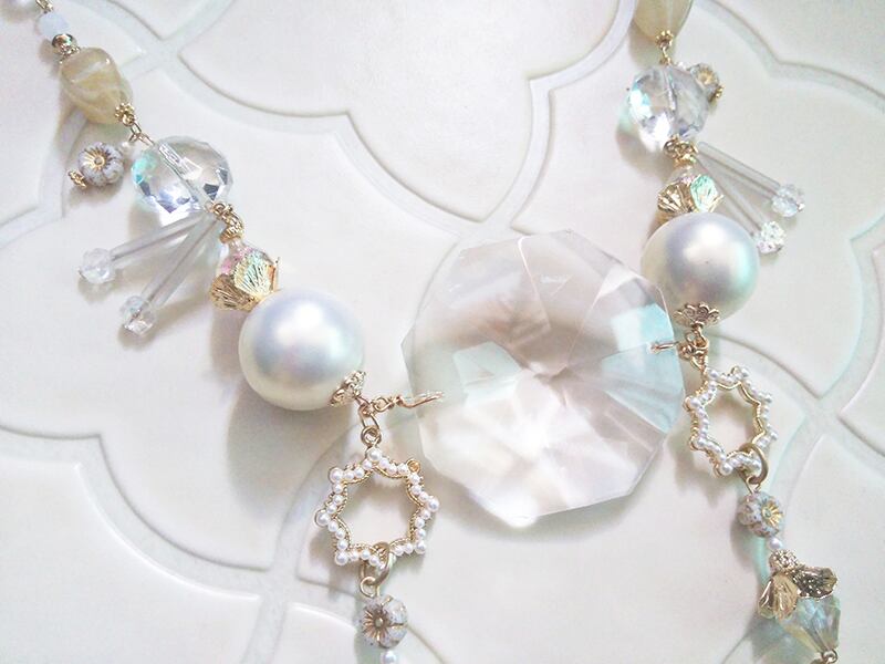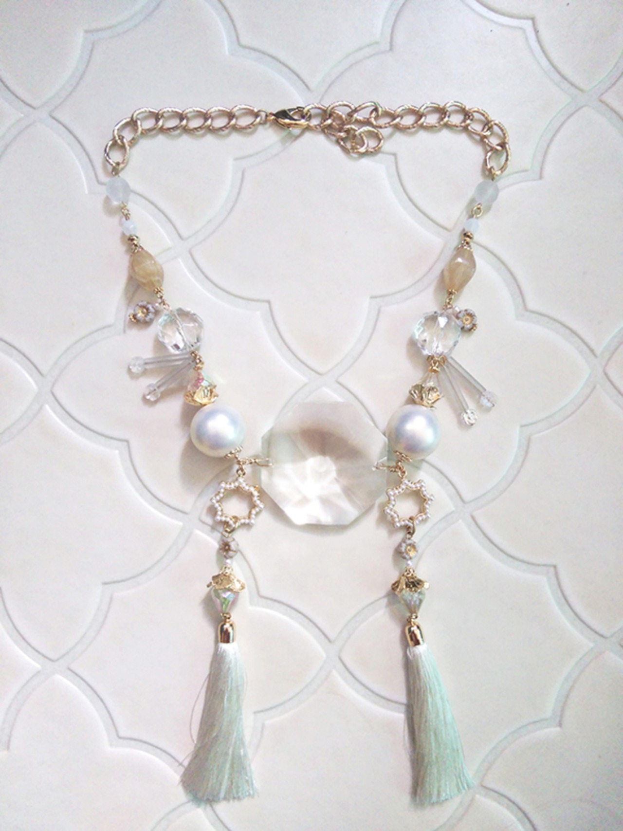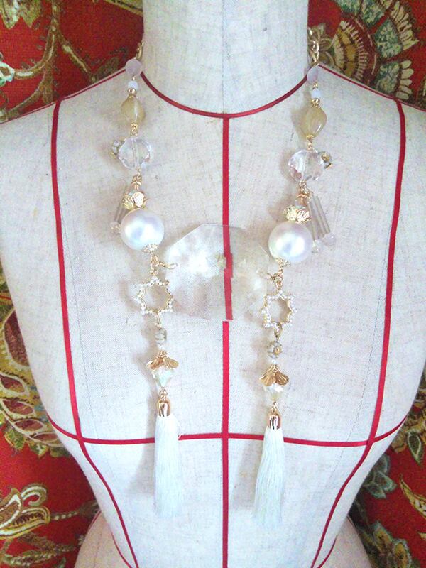 中央の大きな硝子パーツは本物のシャンデリアのパーツです。ロングタッセルと合わせて神秘的なデザインに仕上げました。