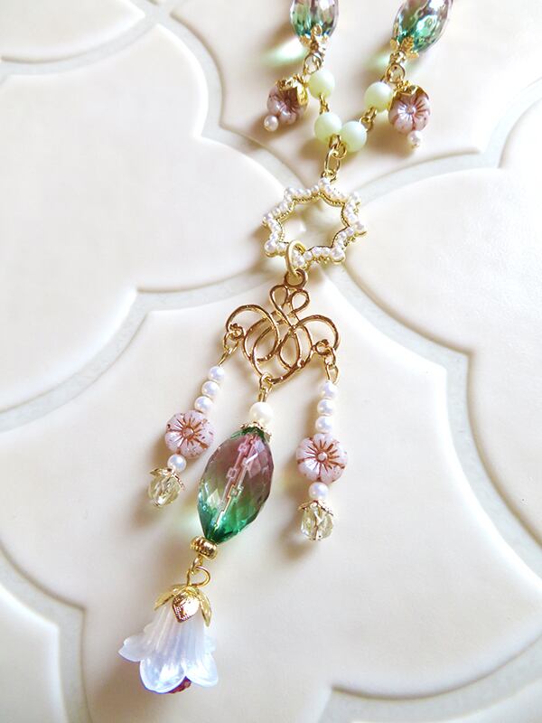 ピンクとグリーンのグラデーションが可愛いビーズと、薄紅色のお花のチェコビーズの組み合わせがガーリーなネックレスです。