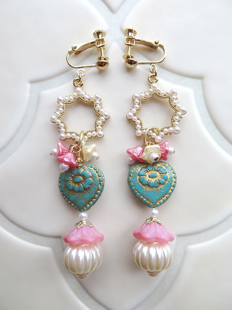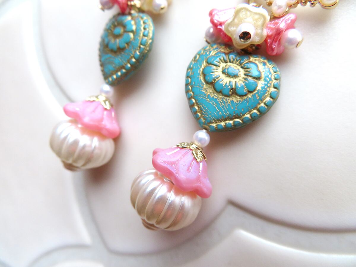 ヴィンテージのパーツやチェコガラスビーズ等を使用し可愛らしくゴージャスに仕上げました。