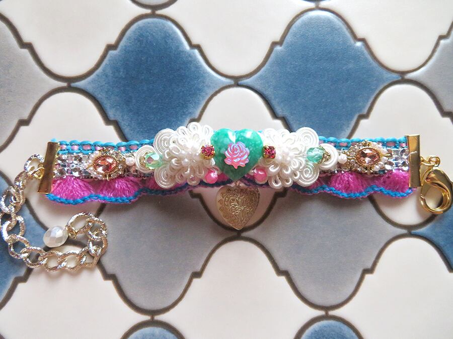 海外製のブレードやビーズ、ヴィンテージのパーツなどを多数使用しています。
