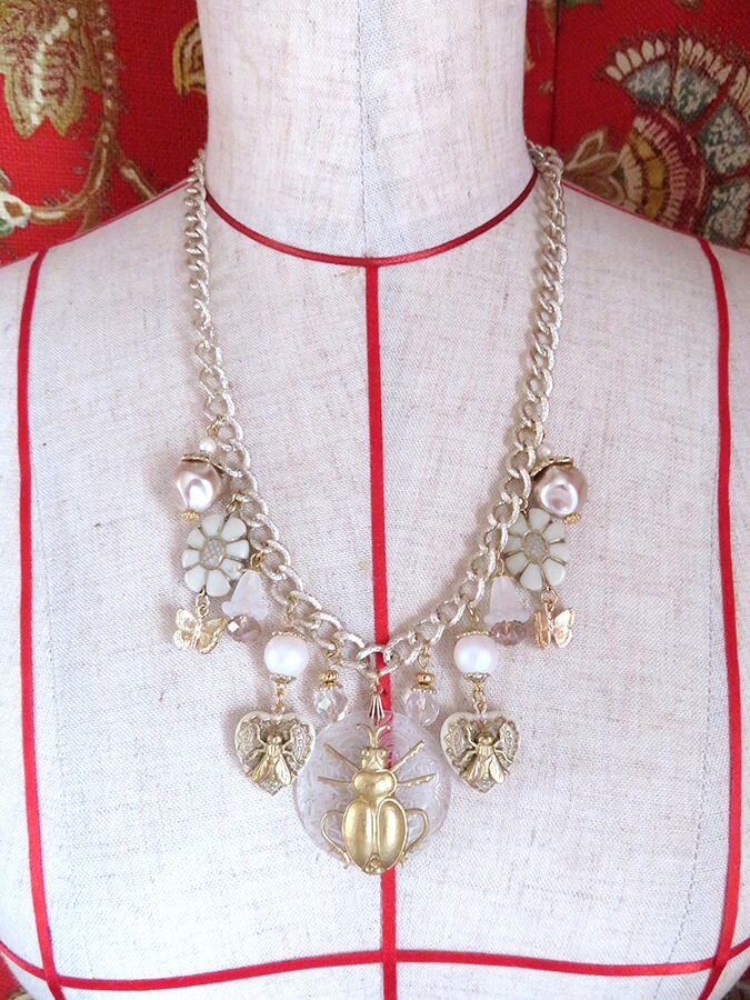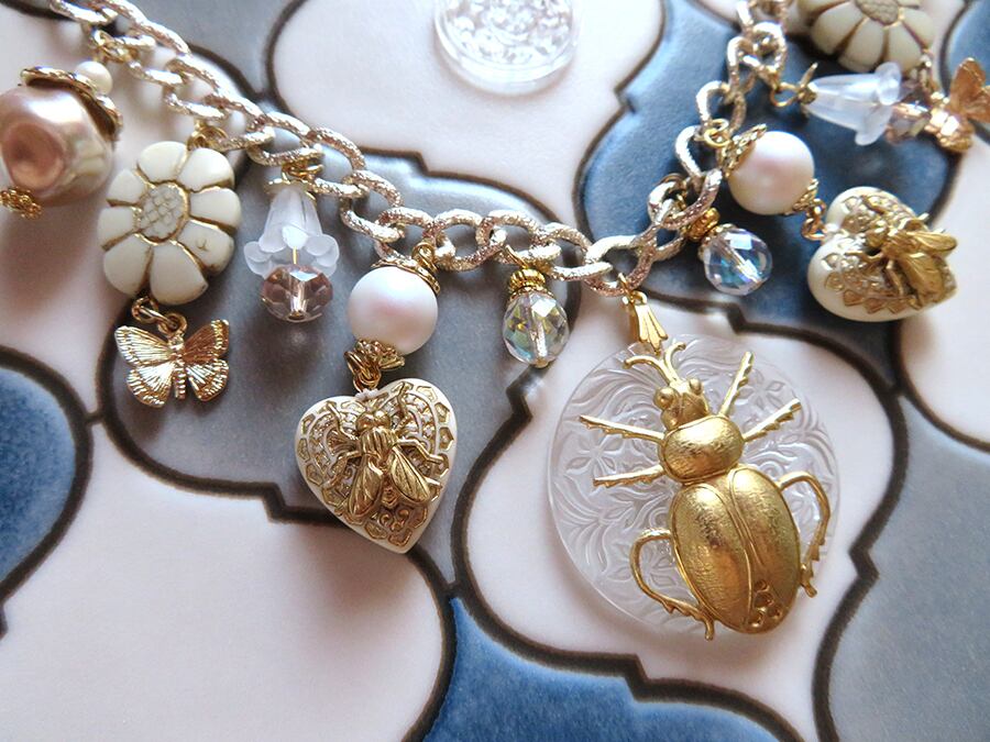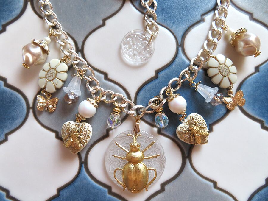 大きなラウンドビーズはドイツ製、ハートのチャームには蠅のブラスパーツが付いています。