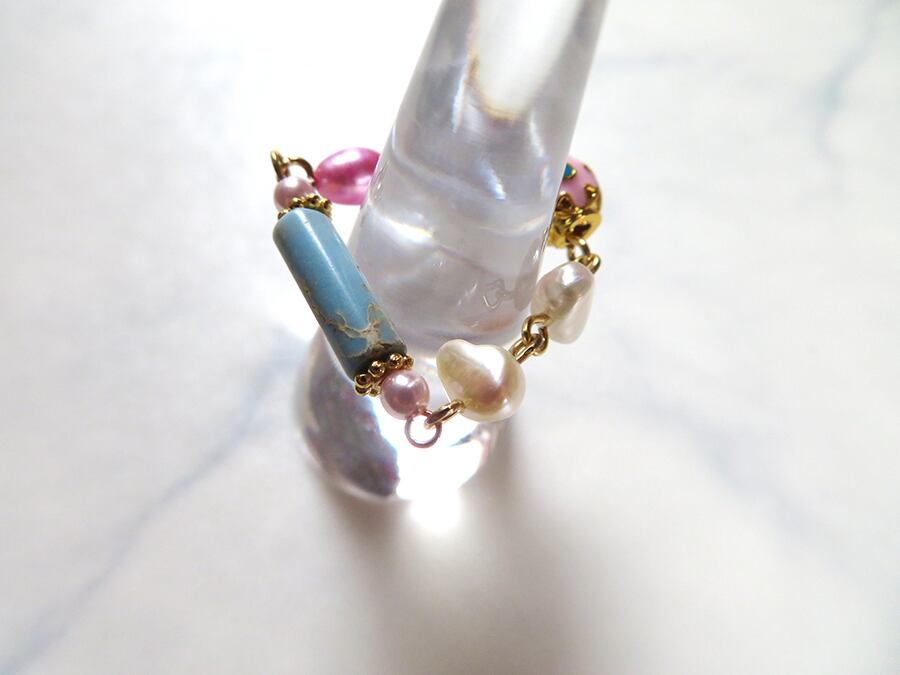 淡水パールやフェイク珊瑚等をつなぎ合わせて、360度どこを表に着けても違った可愛さが出る様に制作しました。
