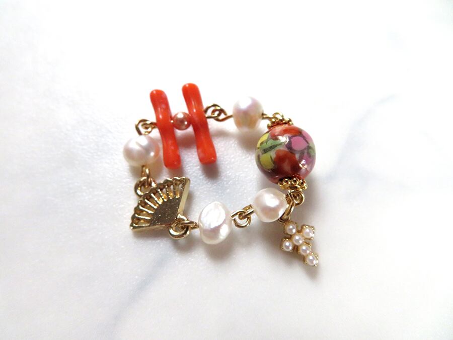 淡水パールやフェイク珊瑚等をつなぎ合わせて、360度どこを表に着けても違った可愛さが出る様に制作しました。
