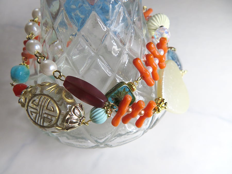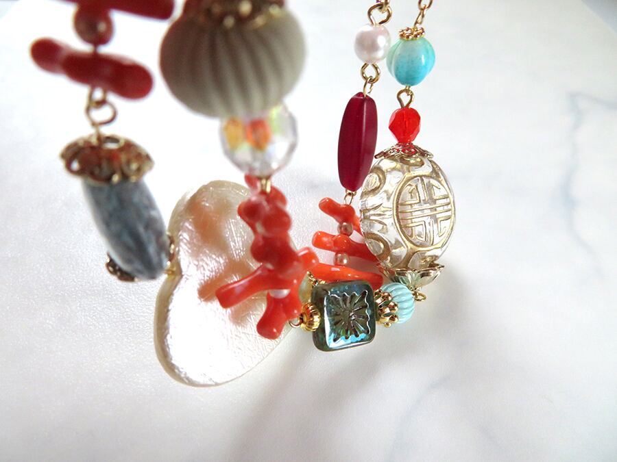 チャイナボタンやフェイク珊瑚等をつなぎ合わせて、360度どこから見ても違った可愛さが出る様に制作しました。