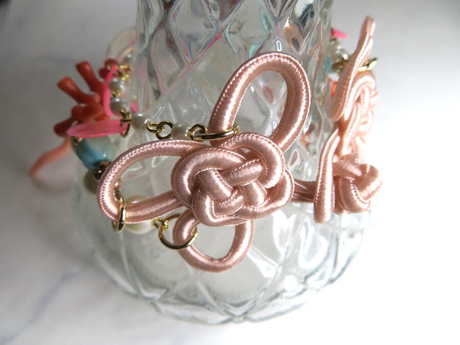 チャイナボタンやフェイク珊瑚等をつなぎ合わせて、360度どこから見ても違った可愛さが出る様に制作しました。