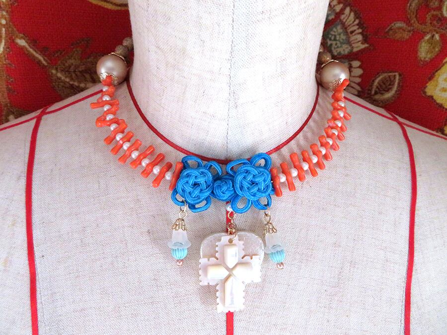 チャイナボタンやフェイク珊瑚等をつなぎ合わせて、360度どこから見ても違った可愛さが出る様に制作しました。